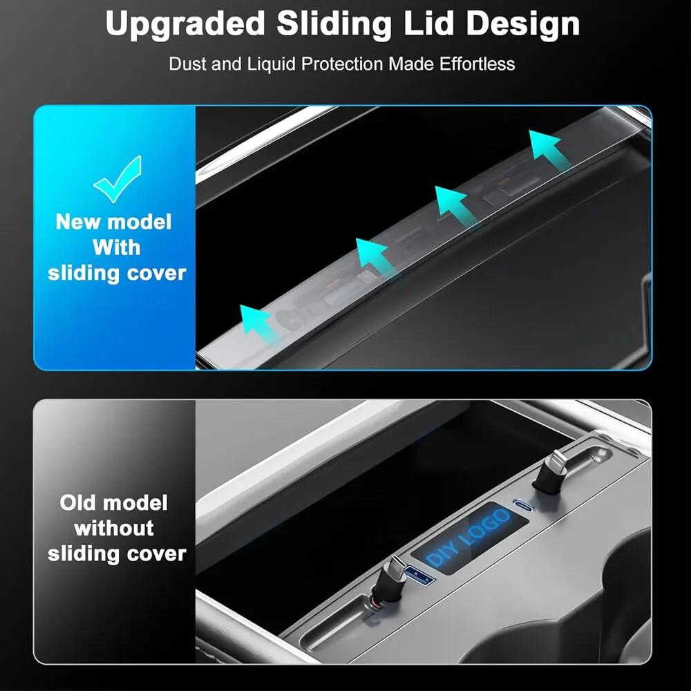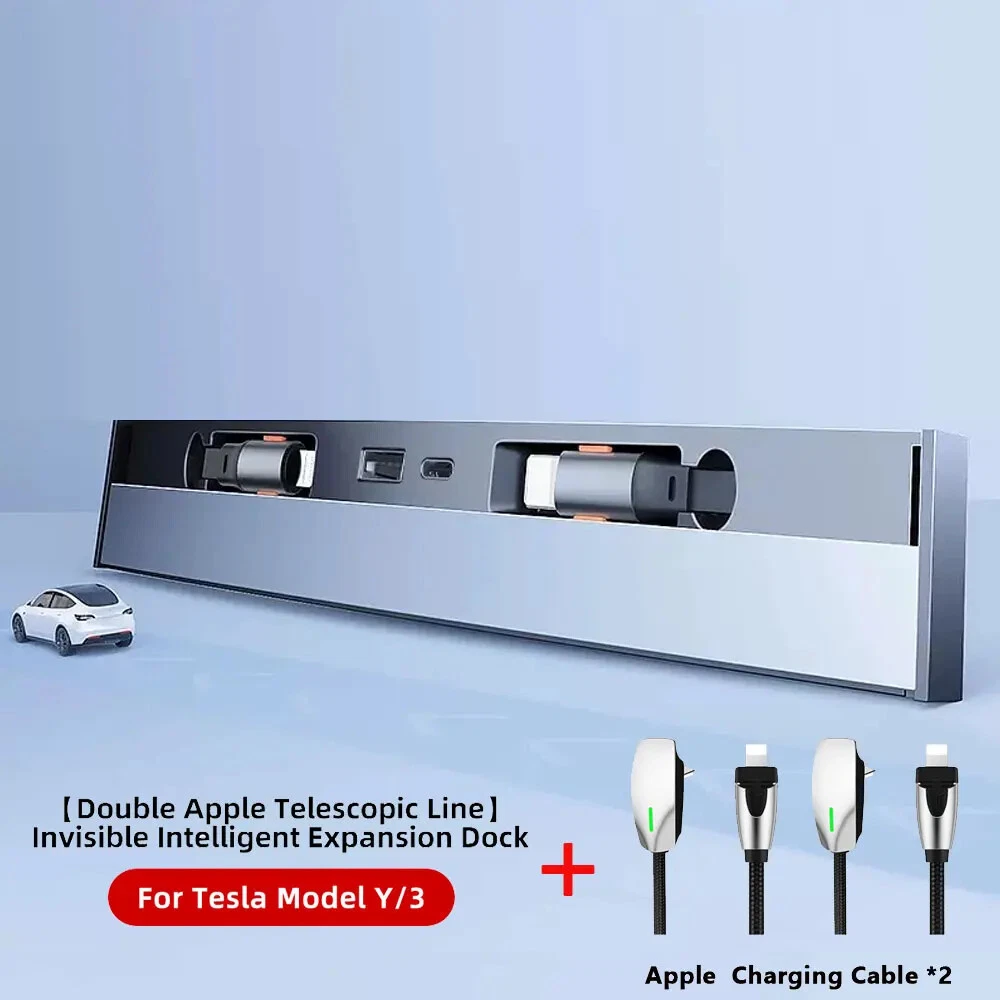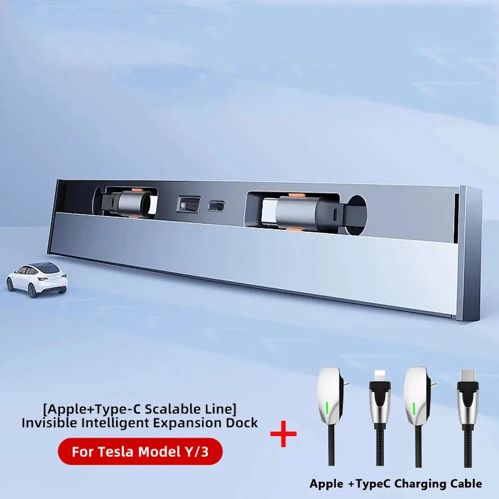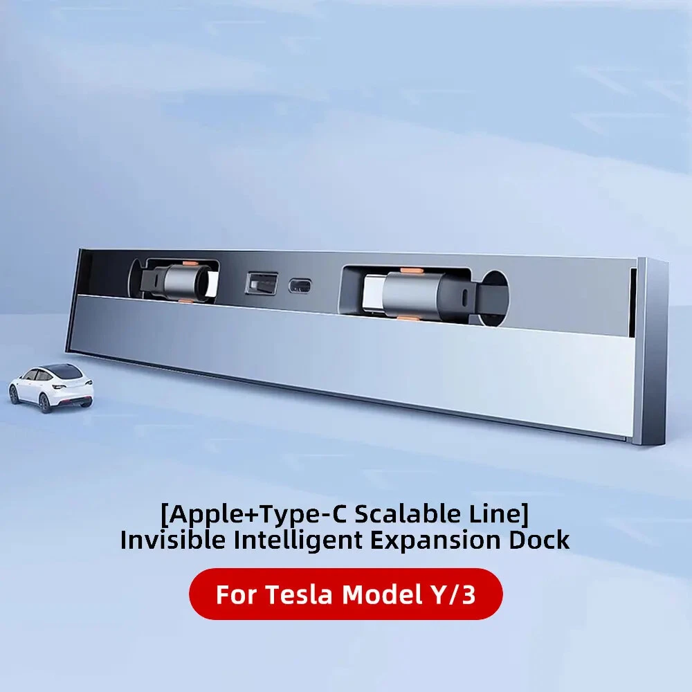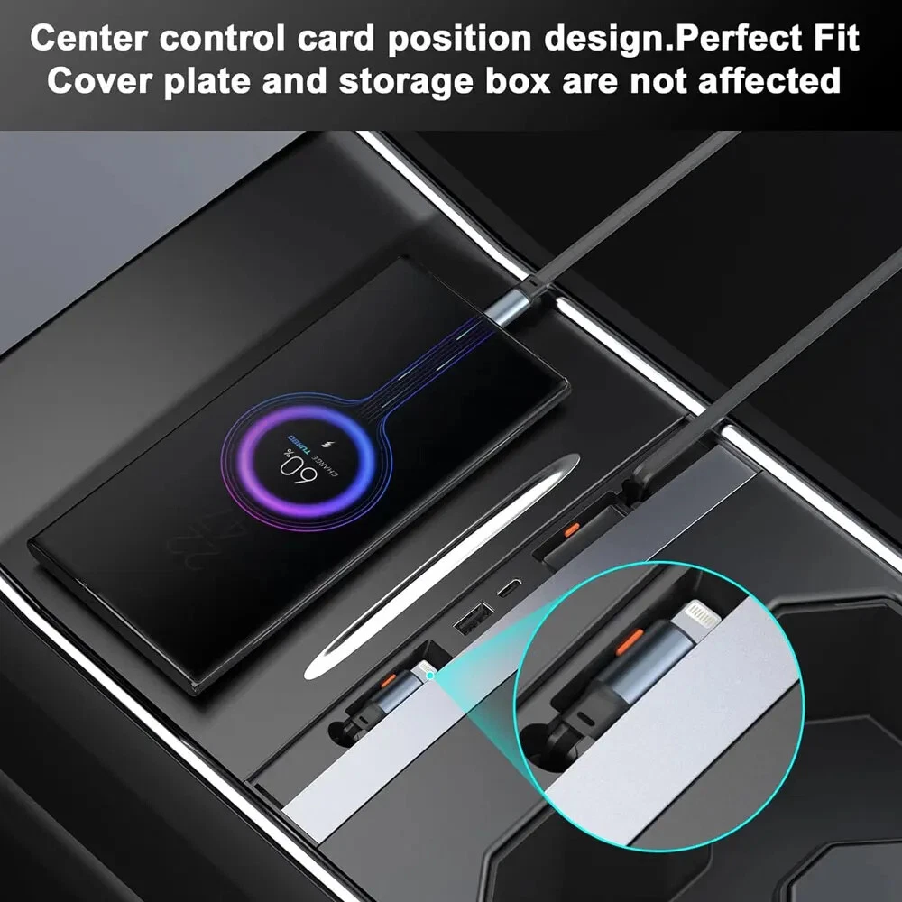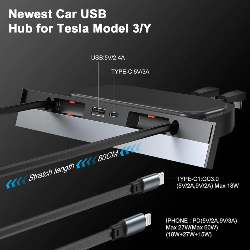 Car USB Hub for Tesla USB Hub Multi Port for Tesla Model 3/Y Multifunctional Tesla Accessories Anti-Dust Sliding Lid Retractable 2024 Upgraded For Tesla Charger: Upgraded For Tesla accessories adopt a waterproof Sliding Lid design to prevent liquid and dust particles from falling in. Extend the life of your Tesla Model 3/Y 2024 accessories and keep them clean with ease! 4 Ports for Fast Charging: USB hub for Tesla Model 3/Y features one Type-C cable and one Lightning cable, free retractable up to 31.5inch. And 2 charging ports for USB and Type C.The charging cable is retractable, once you are done charging pull the cable back and it will retract back.It keeps everything clean and solves the problem of wires getting twisted. it is a great addition to your car. Car Fast Charger: Tesla model 3 accessories uses high-quality chips, with a maximum power of 27W, 3 times faster than ordinary car chargers, charging in half an hour, lasting all day, no need to wait when charging in a hurry, and has over-current and Short circuit protection, it will not burn or damage your device while charging. Exact Match: The color and size of the center console match the Tesla Model 3/Model Y center console perfectly, and when you close the center console the whole thing looks like it's part of the car.Central control card design, does not affect the cover plate closed. 12-Month Warranty: We 12-month after sales service. Our professional after-sales team is ready to solve any product problems for you.Please email the We store first for a solution if meeting any connect issue or using problems , we will be sure to provide a satisfying solution for you.