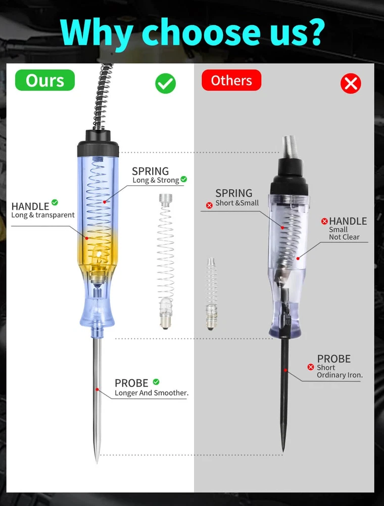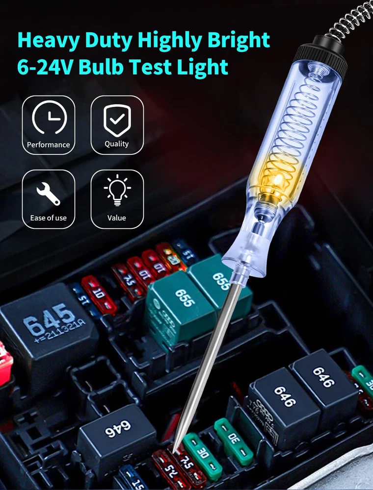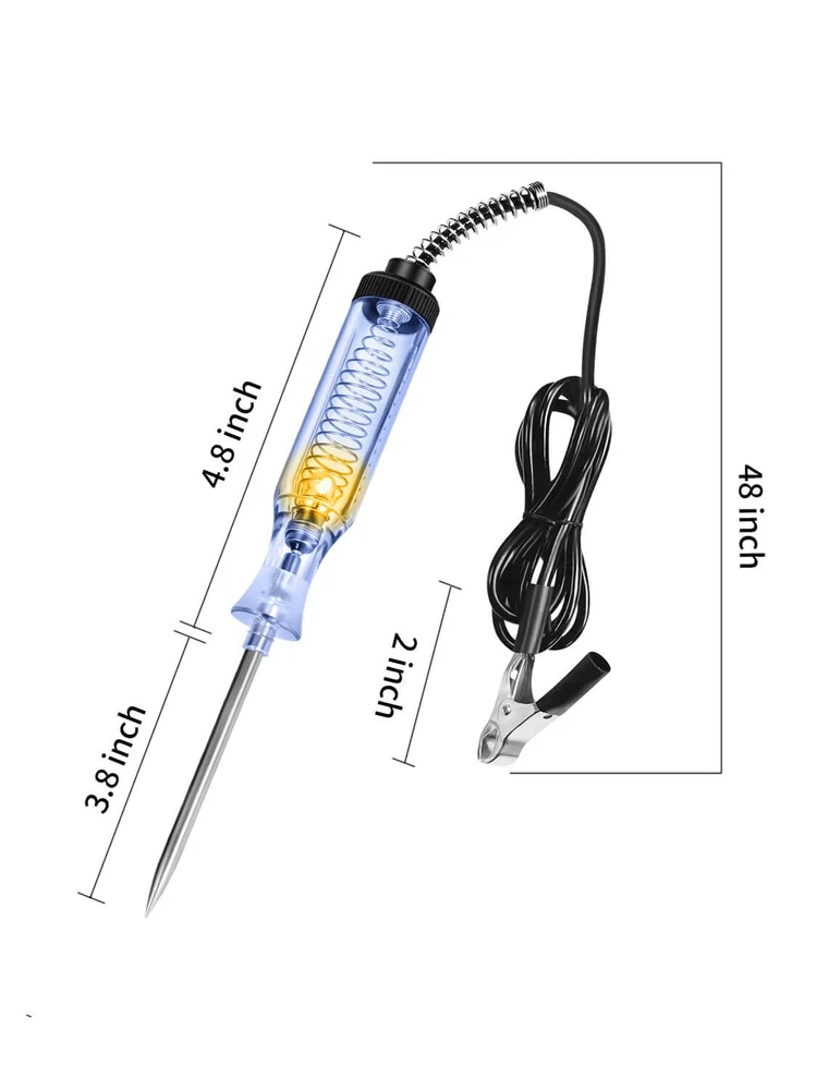 Store New Arrivals Add to Favorite View Feedback Contact Test Light Automotive,Circuit Tester 6V-12V-24V,ABS Handle Material,Long Steel Probe Coating PU and Alligator Clip, for Continuity Voltage, for Sedan, SUV, RV, Truck (Black,1-Pack) Description Item model number VVT-E02 Style Tungsten bulb Power Source Corded Electric Color Black Product Dimensions 8 x 4 x 1 inches; 3.84 ounces Country of Origin China Item dimensions L x W x H 8 x 4 x 1 inches Brand SchuhRia Manufacturer GOCIA 【Wide Application】DIY automotive circuit tester/circuit test light with 6-24V DC voltage testing range, ideal for checking various vehicles electrical circuits, quickly check automotive headlights, taillights, turn signal circuits, faulty sockets, fuse connections, also for testing other 6-24v DC wirings and circuits. 【Quality Quality Bulb】High visibility bulb to indicate circuits’ signal, the brightness of the light will be different with the different measured voltages. 【Bidirectional Current Voltage Testing】You can attach the alligator clamp either to negative or positive ground, while use the probe to touch the other side. 【Quality Made】Sharp stainless steel probe for piercing wires, also for hard to reach tight areas. Insulation protective rubber tip protects you against electric shock. Constructed with high quality acetate fiber body, shatter-proof, more durable than others. Premium PU spring wire, heat insulation and oil resistance for safe use. 【Convenient Use】High quality wire offers more flexibility, lighter and more durable than normal cable wires, convenient for use and storage, along with large size alligator clip for easy one hand operation, will definitely improve your working efficiency. 【Brand Sevice】We don‘t wage a price war, but only continue to provide quality products to customers and guarantee stable quality. Product Description Sharp Ni-Plating probe Highly Quality Bulb 12V-24V Bulb align with probe Anti-pull spring 48inch Soft cord,Longer than others Ni-Plating Alligator Clip Circuit Testing Connect the alligator clip to the ground,use the probe to touch wires or fuse to diagnose short circuit or defectivefuse The body of the circuit tester is made of high-quality ABS, which is more durable, more resistant to fall than ordinary tester. Professional circuit 12-24V tester designed for car electrical circuits,automotive battery,battery charging systems,ignition systems,which is a must have tool for any automotive engineer ,electronic engineer or circuits DIY . ABOUT US We offer the best prices around on high quality products. Our E-store includes media such as books, movies, music and games while offering electronics, toys, sporting apparel, clothing, tools, general home, garden items and more. SHIPPING We are always working hard to ensure your package arrives as soon as possible. Please understand that some factors like weather, high postal traffic, and the performance of shipping companies are outside of our control. We offer free shipping to the lower 48 states and ship within 2 business days of payment, usually sooner. We do not accept P.O. Boxes. Please provide a physical address. RETURNS We offer a 30-Day Return Policy on items which you are not completely satisfied with. You have the option for a full-refund or an exchange of the item. No returns are available on items shipped outside of the USA. PAYMENT We accept PayPal. CONTACT US This page content is yet to come Please ad us to your favorite seller and visit again later Thank You CUSTOMER SATISFACTION We try our very best to make sure every customer is completely satisfied. If there's a problem, message us! We're happy to help.