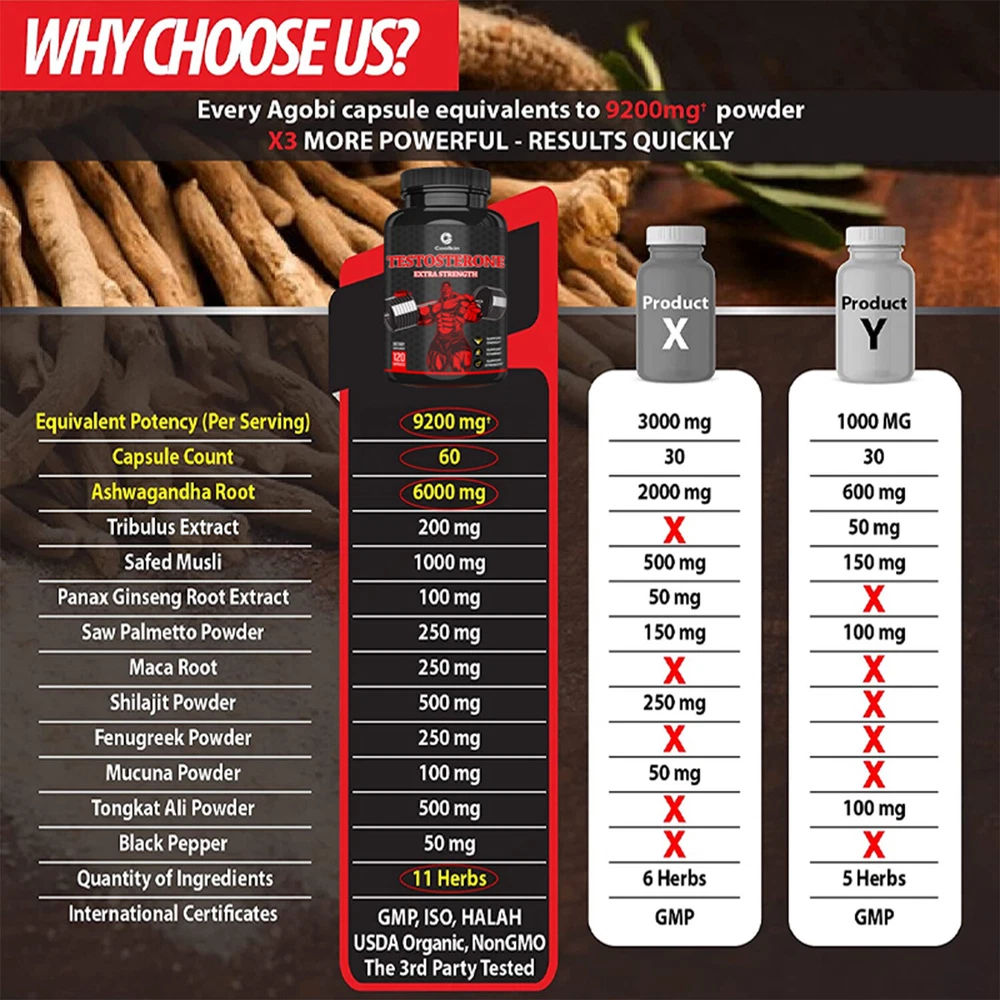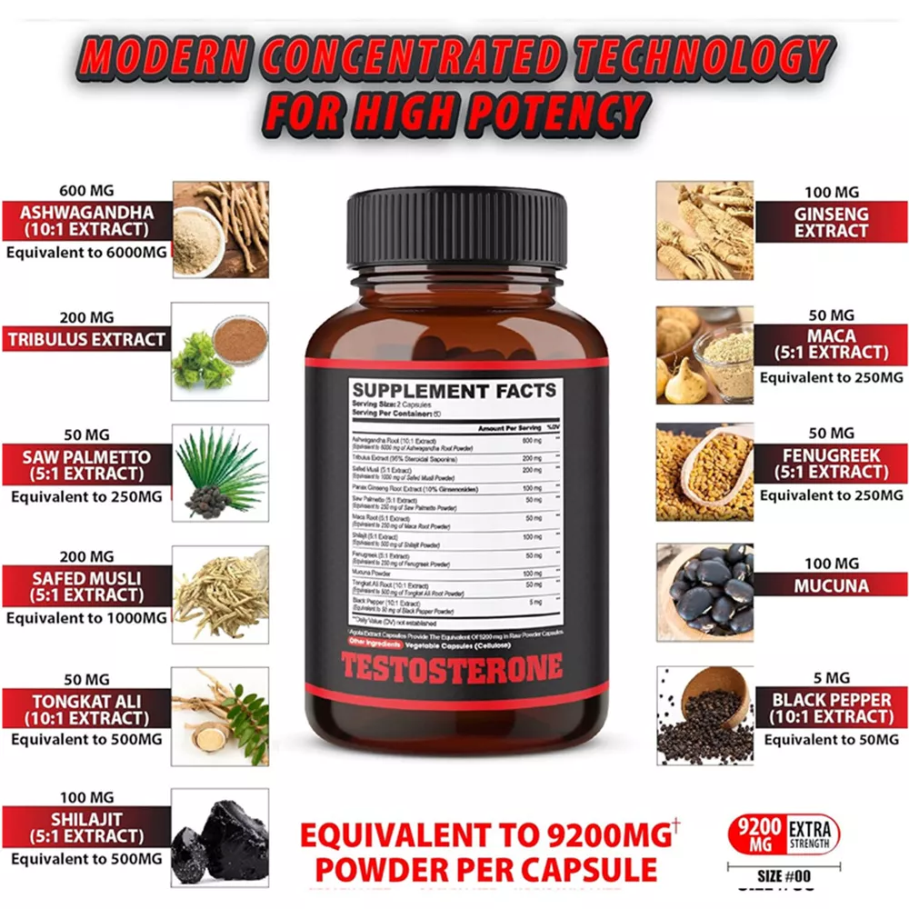 Effects: Energy & Endurance, Testosterone Booster Ingredients: Tribulus, Ginseng, Ashwagandha Directions: Take 1-2 capsules twice a day after meals. Shipping: Ships within 48 hours on working days. Shelf life: 2 years Description: PREMIUM INGREDIENTS: Scientifically formulated with powerful male enhancement ingredients including Ashwagandha, Tribulus Terrestris, Ginseng, Saw Palmetto, Maca Root, Fenugreek and more. These ingredients have been shown to promote energy, endurance, strength, drive, and lean muscle. BUILD STRONGER, LIMER MUSCLE: Testosterone Booster helps increase muscle mass, improve mood, immune system and energy production. Perform better during workouts and recover faster, giving you better physical performance. HIGH QUALITY: Testosterone boosters are tested for quality and purity by third-party laboratories and manufactured to strict GMP standards to ensure proper purity and potency. Document