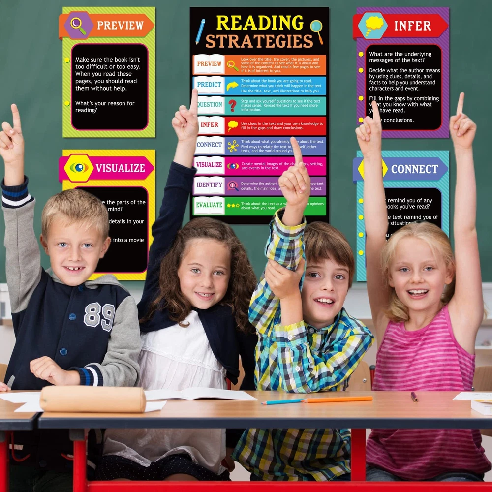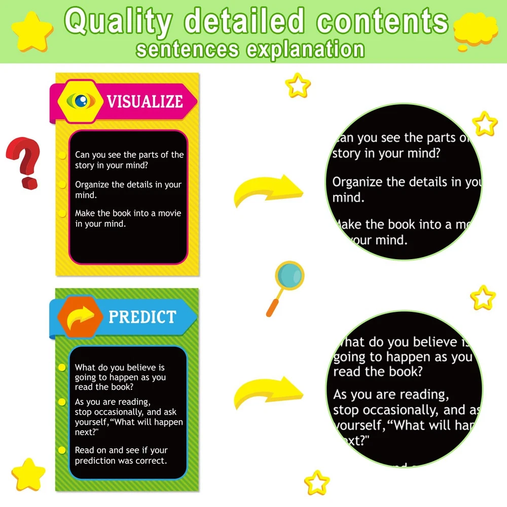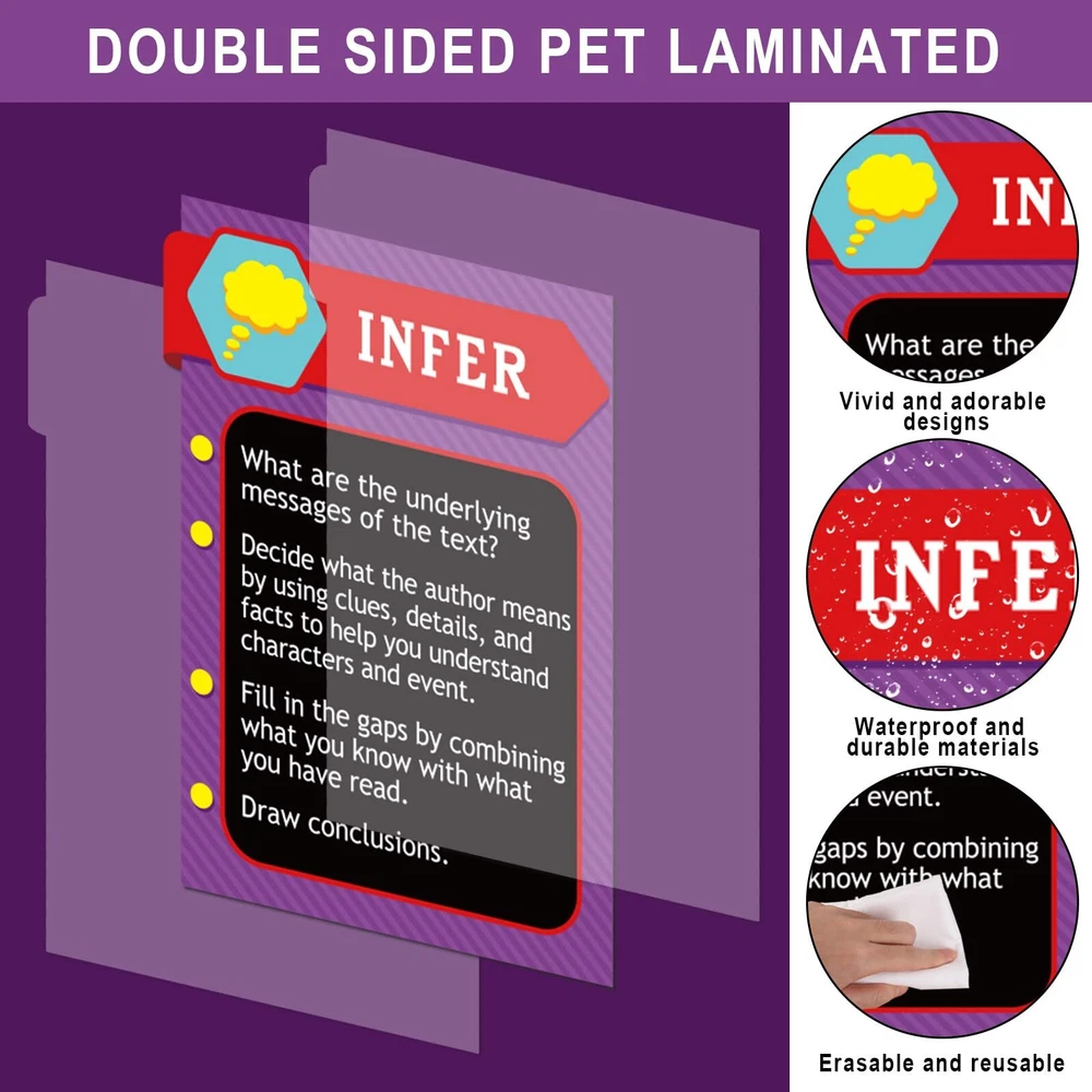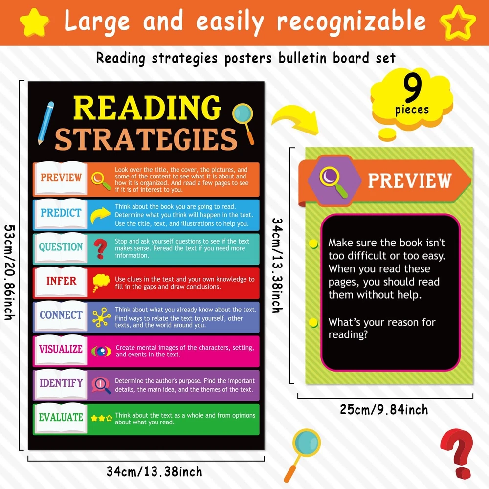 9 Pieces Reading Strategies Posters Educational Bulletin Board Set for Classroom Laminated Grammar Posters for Elementary Middle School Classroom Supplies Decorations. Package includes : 9 pieces reading strategies posters. Material: made of cardboard. Size: as the picture shown. Color: as the picture shown. Feature: Designed for preschool, elementary school and middle school grades, suitable for classroom and libraries. Made of high quality cardboard and double sided laminated with PET film, which is durable, waterproof, tear resistant and reusable. Colorful and beautifully designed with cute images that are eye-catching and easy to grab the attention of a student or child. Can be used as classroom decorations, gifts and education posters. Warm notes: Please allow slight deviation due to manual measurement. Please allow slight color difference due to different monitors. Includes 9 double-sided laminated reading strategy posters designed for elementary and middle school classrooms Durable and reusable PET film lamination makes posters waterproof and tear resistant Colorful designs with explanations and examples grab students' attention and help them learn Perfect for decorating classrooms and teaching reading comprehension, communication skills and more Can be used as gifts, decorations or educational posters in schools, offices and libraries