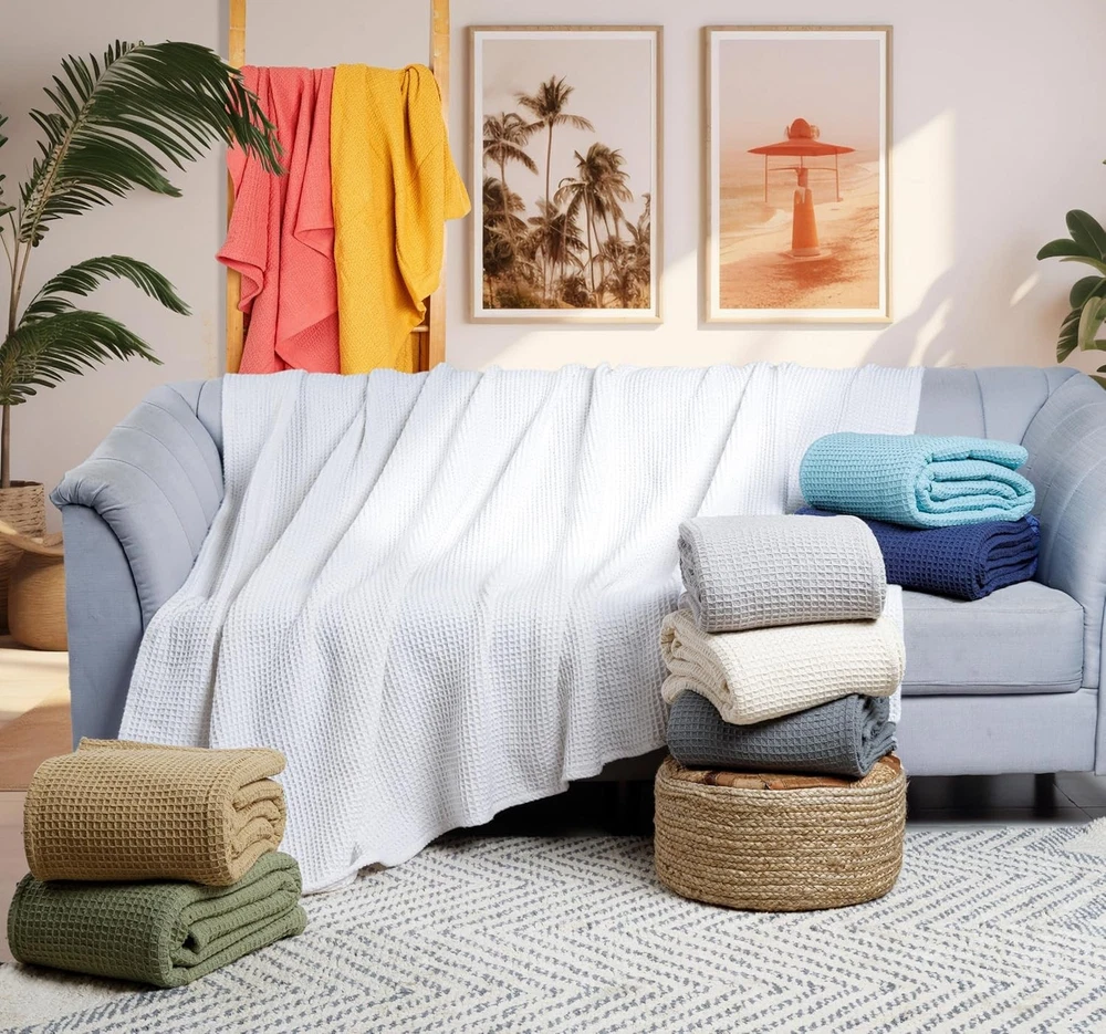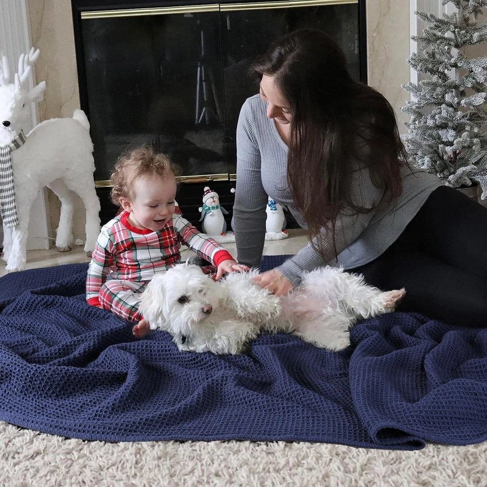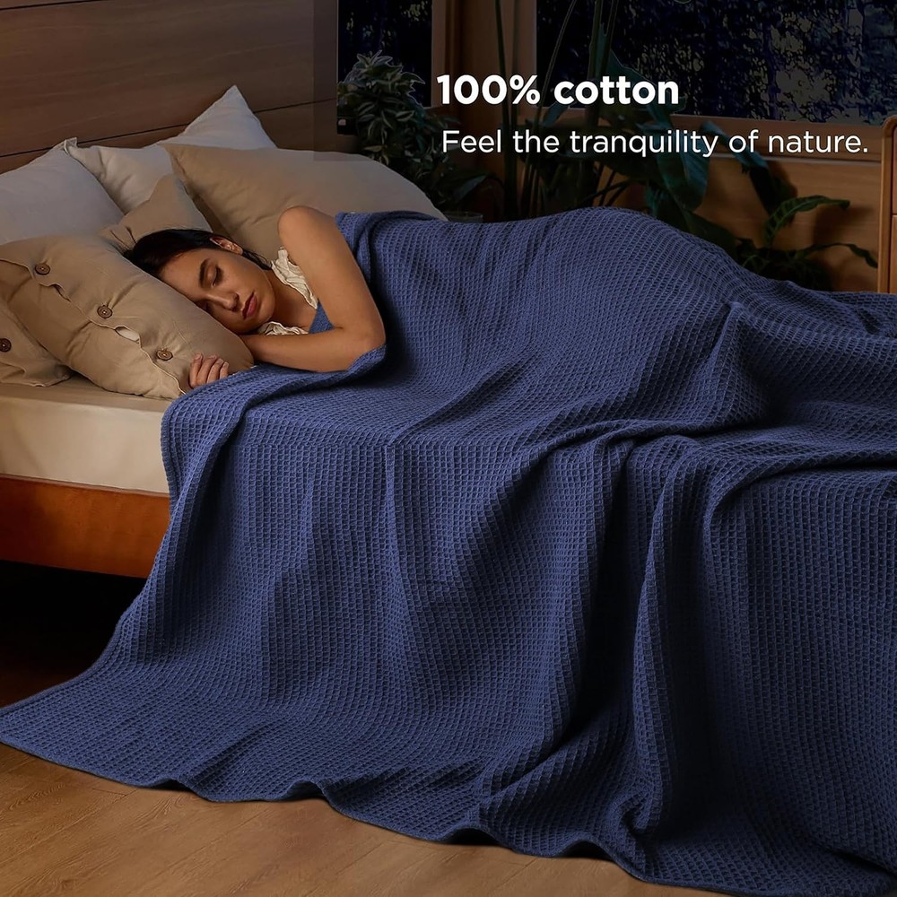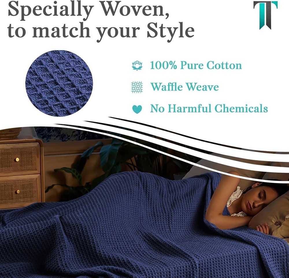 Tex Trend 100% Cotton Blankets King Size – Durable (U.S. Standard), Navy Product Details Material: Cotton Color: Navy Brand: Tex Trend Special Feature: Fade Resistant, Durable, Soft, Breathable Style: Modern Blanket Form: Throw Blanket Age Range (Description): Adult Product Dimensions: 108"L x 90"W Theme: Plain Pattern: Waffle Recommended Uses For Product: Travel, Napping Seasons: All Fill Material: Cotton Weave Type: Waffle Product Care Instructions: Machine Wash Size: King (U.S. Standard) Fabric Type: 100% Cotton Unit Count: 1.0 Count Number of Items: 1 Fabric Warmth Description: Lightweight Sport: Camping Water Resistance Level: Not Water Resistant Model Name: Waffle Manufacturer: Tex Trend Item Weight: 6.25 pounds Country of Origin: India Item model number: COTTON-BL-$P Soft, Breathable & Stylish: Crafted from 100% cotton, this pre-washed blanket boasts a soft and gentle texture that becomes even more luxurious with each wash. Its anti-static fabric ensures exceptional breathability and moisture absorption, providing a cozy and dry sleeping experience throughout the year. All Season Comfort: Imagine wrapping yourself in a blanket that feels like a warm embrace on a chilly night. Our classic weave is designed to provide exceptional comfort and warmth without feeling stuffy or suffocating. The open cell weave ensures proper air circulation, making it a versatile bedding essential for all seasons. Whether you're seeking a light layer in spring and summer or an additional layer in fall and winter, our blanket offers optimal comfort without feeling too heavy or too light. Waffle Weave Texture: The timeless waffle weave design combines classic elegance with a modern touch, featuring a three-dimensional, puffy appearance. The intricate craftsmanship adds a sophisticated flair, creating a serene atmosphere that complements any home decor. Additionally, the unique waffle weave promotes air circulation, enhancing the blanket's breathability. Warm Yet Lightweight: Crafted from premium long-staple cotton, this waffle blanket offers a harmonious blend of warmth and weight. Ideal for cuddling up, its soft and soothing fabric will envelop you in comfort and tranquility. Versatile Blanket: Beyond its traditional use as a bed or sofa blanket, our waffle blanket can be used as a bedspread or layered on your bed. It's also perfect for outdoor activities like picnics, travel, backpacking, or even napping in the office or car. To prevent snagging, we advise against allowing pets to play on the blanket.