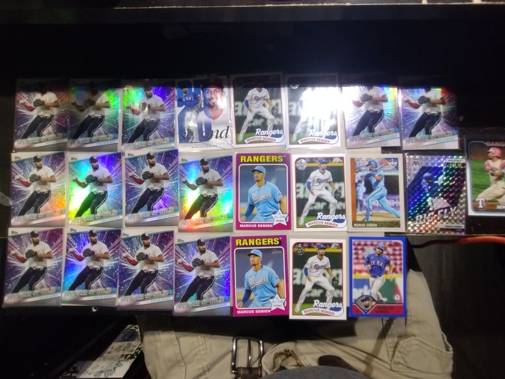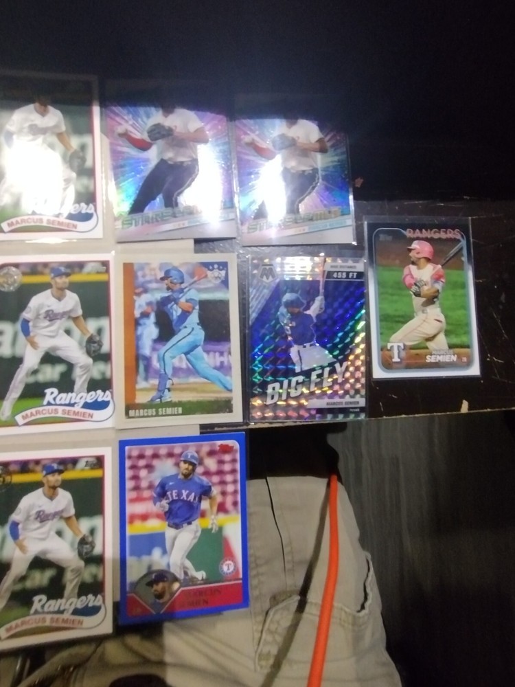 This mixed card lot features 24 trading cards of Marcus Semien, the Texas Rangers' All-star 2nd Basemen from the 2023-24 season. Manufactured by Topps in 2024, these cards are part of the Major League Baseball (MLB) collection and include various insert features. The cards showcase Semien in his Rangers uniform and are standard sized sports trading cards, perfect for any baseball card collector or fan of the Texas Rangers.
