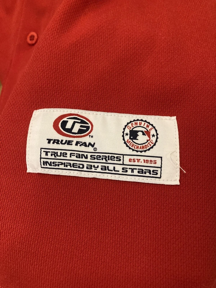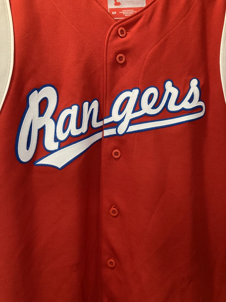 Show your support for the Texas Rangers with this vintage True Fan jersey. The red jersey features the iconic Rangers logo and is officially licensed by the Major League Baseball. It's perfect for wearing during the regular season or displaying as a collector's item. This men's medium jersey is in great condition. Whether you're a die-hard Rangers fan or just love baseball, this jersey is a must-have addition to your collection. Get yours today and show your team spirit!