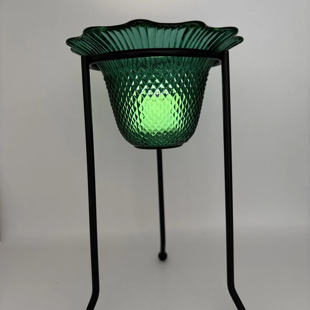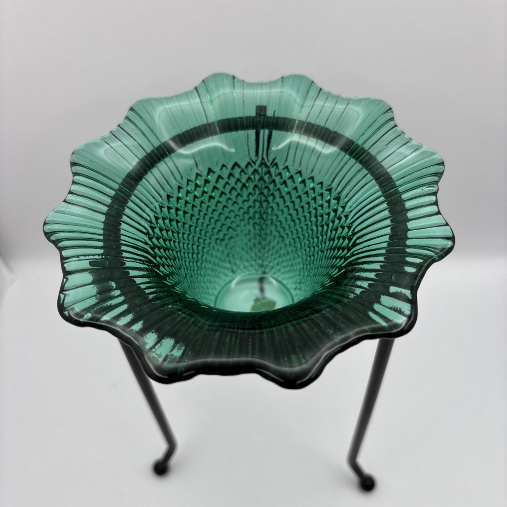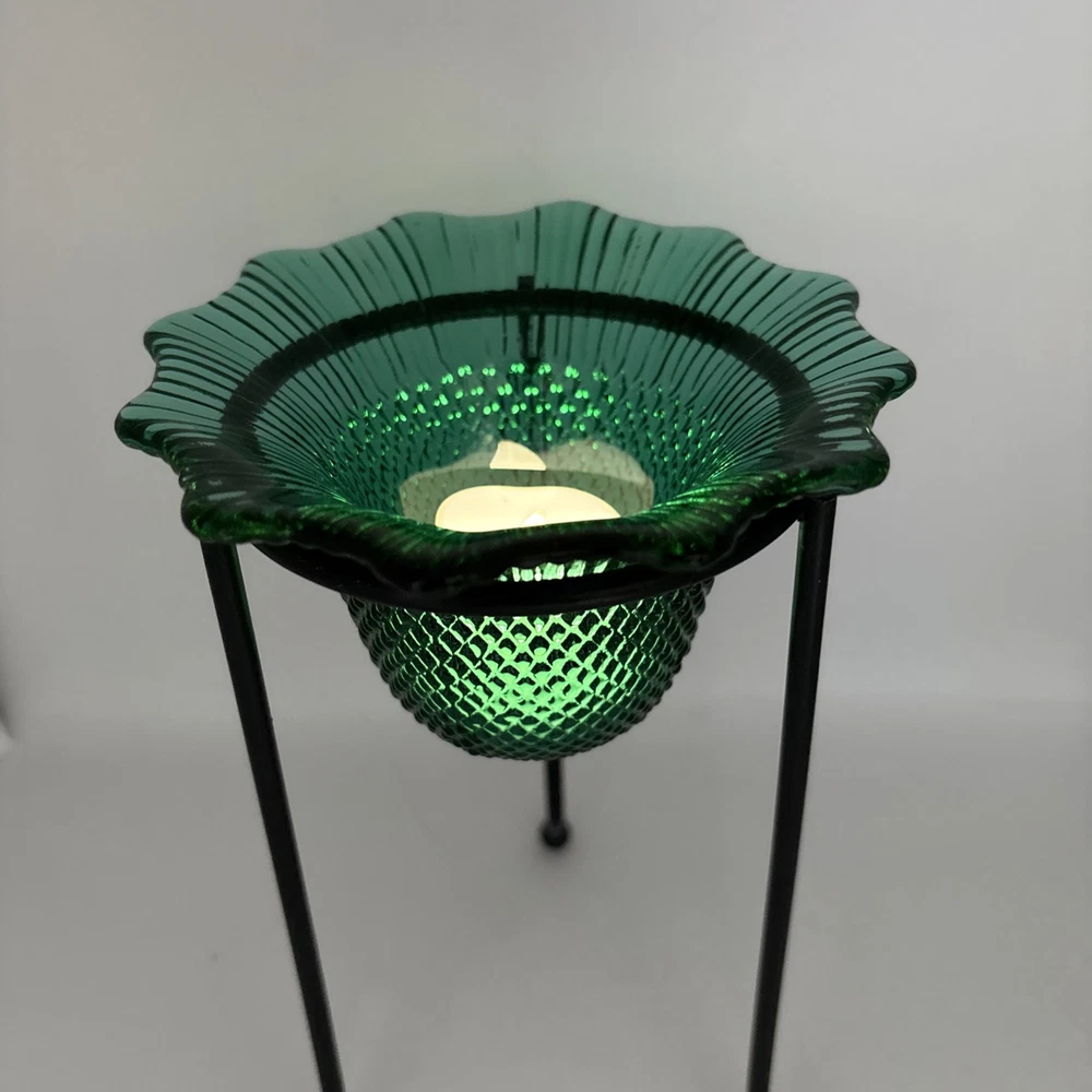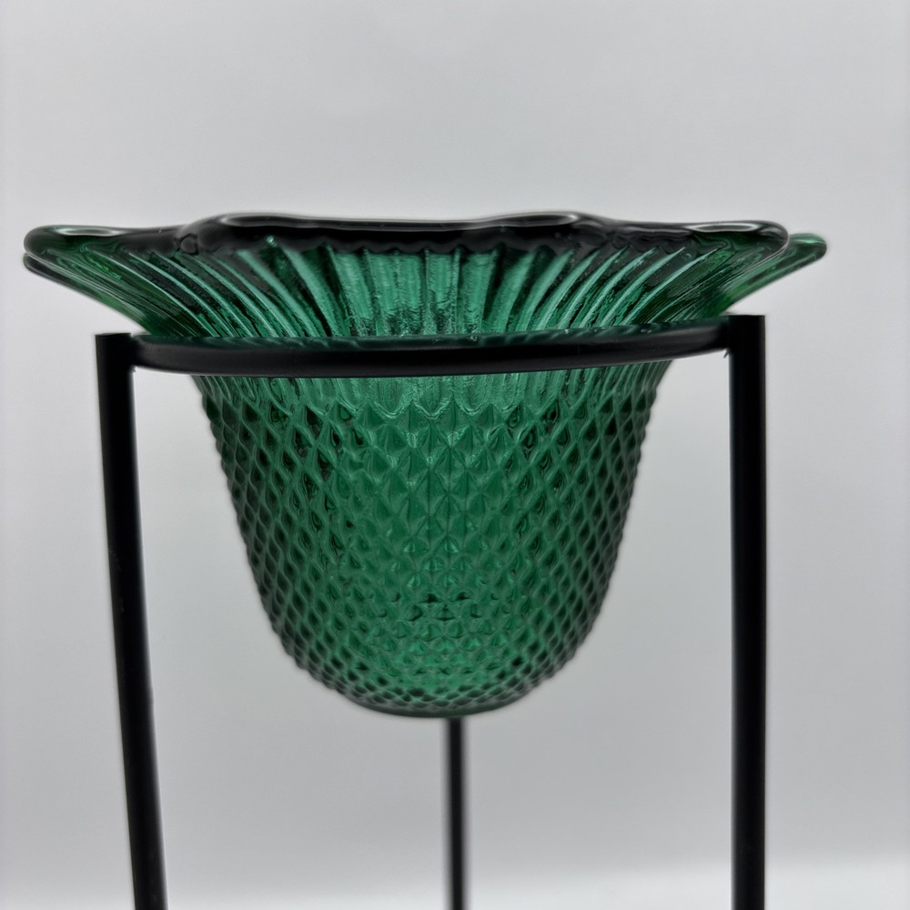 Textured Green Glass Small Bowl Tea Light Holder on Black Metal Stand