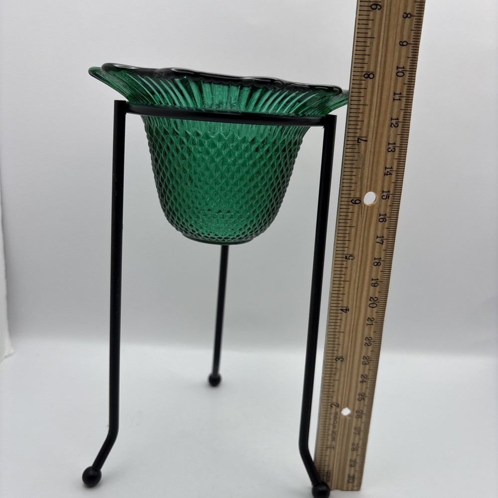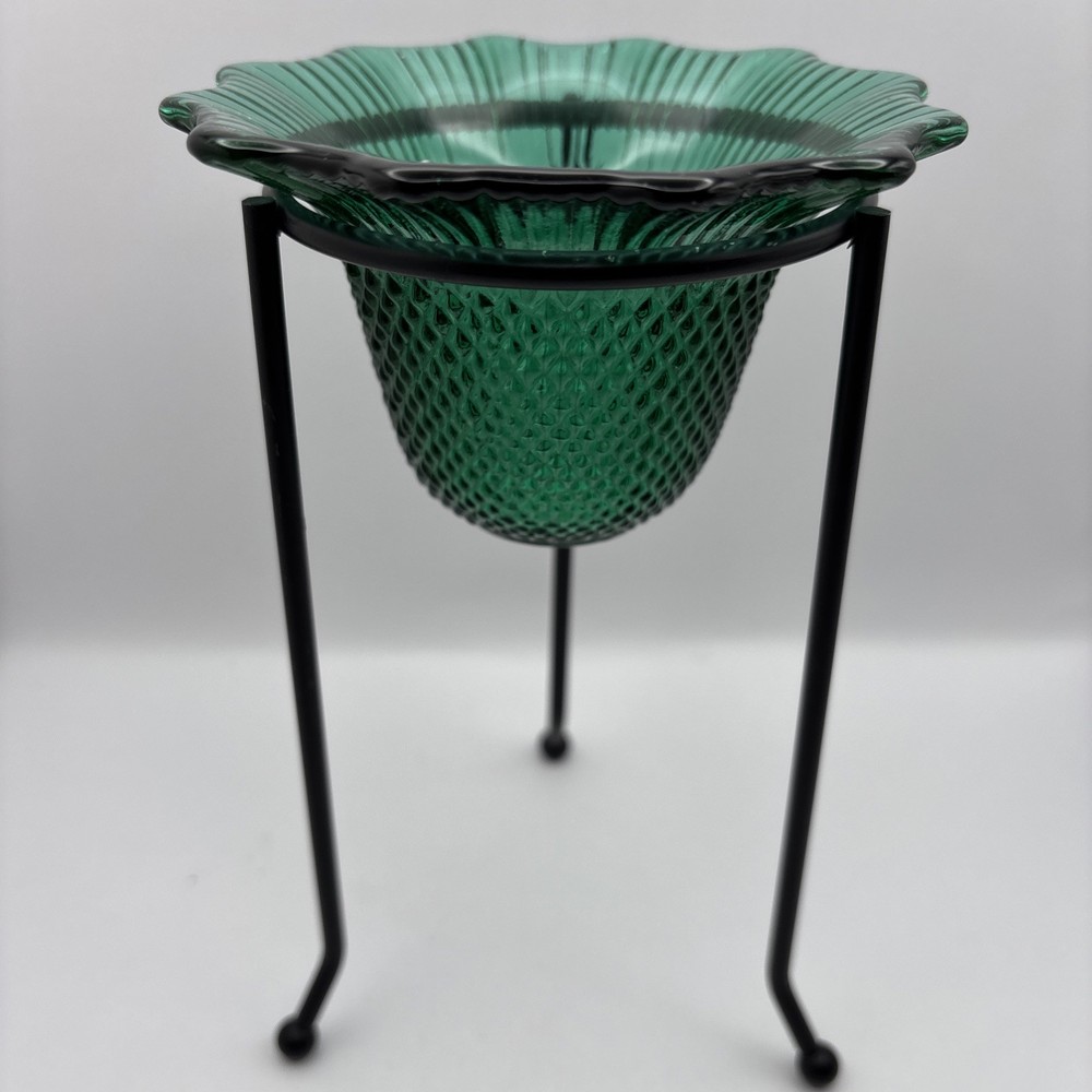 This is a textured green glass small bowl which is sitting in metal base. Can be used as a tea light holder as shown. Take it off the base and use it as a small candy dish if desired. JJ