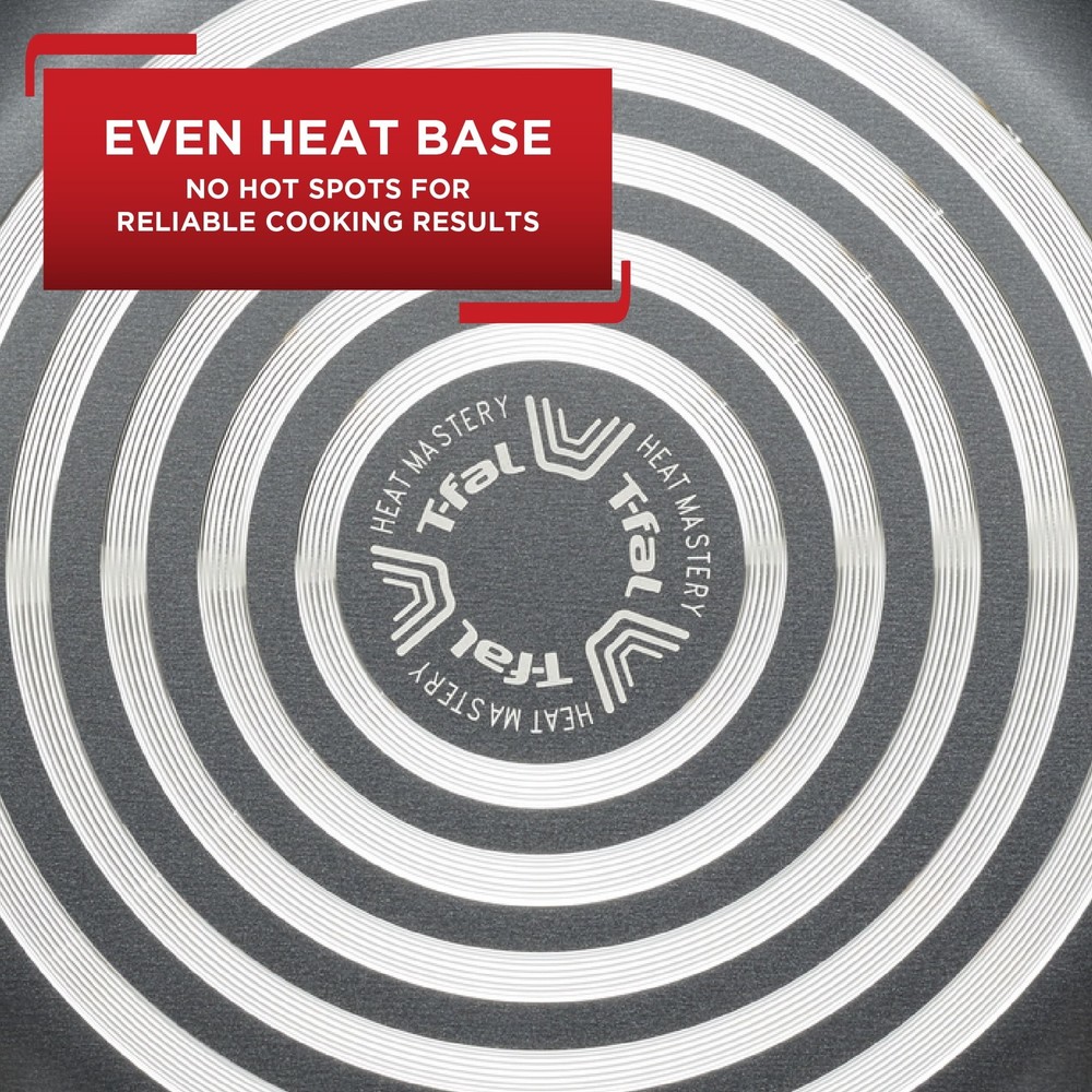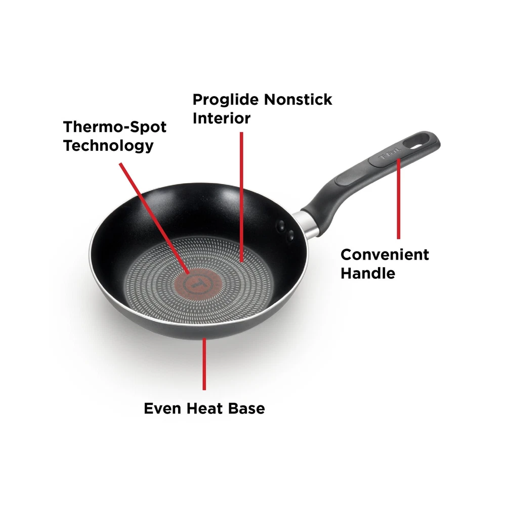 Cooking and cleaning made easy with T-fal Easy Care Nonstick 8" Fry Pan, ensuring reliable results when preparing meals for the whole family. Pro-Glide non-stick interior ensures easy food release, and enables healthy cooking with little to no oil. Perfect for a variety of meals, such as searing steaks and sautéing vegetables. Thermo-Spot heat indicator shows when T-fal pans are perfectly preheated to start cooking, and the even heat base allows for no hot spots. Features comfortable handles for a sturdy and secure grip. Dishwasher and oven safe up to 350°F; all cook tops compatibility excluding Induction. PROGLIDE GREY NONSTICK INTERIOR: Easy release and cleanup every time THERMO-SPOT TECHNOLOGY: Unique heat indicator that turns solid red to show when pots and pans are properly preheated to start cooking 8 INCH EVEN HEAT BASE: No hot spots for reliable cooking results COMFORTABLE COOKWARE HANDLE: Sturdy and secure grip DISHWASHER AND OVEN SAFE: Up to 350°F ALL COOK TOPS COMPATIBILITY: Excluding Induction LIFETIME LIMITED GUARANTEE