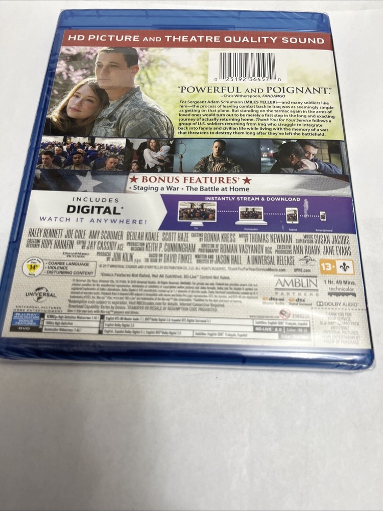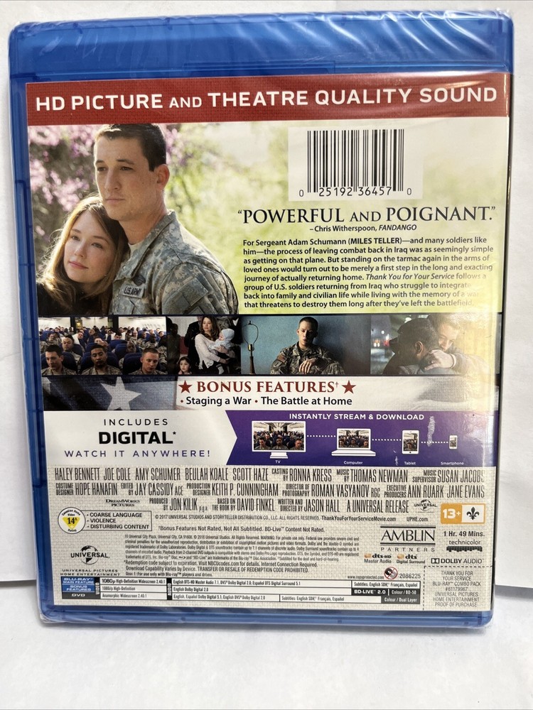 Rating: R UPC: 0025192364501 gtin13: 0025192364501 Language: English Movie/TV Title: Thank You for Your Service Format: DVD Director: Jason Hall Genre: Drama Studio: Universal Studios Features: Behind The Scenes Featurette Sub-Genre: War-Afghanistan & Iraq Actor: Haley Bennett Edition: Extended Edition Type: Movie Release Year: 2017