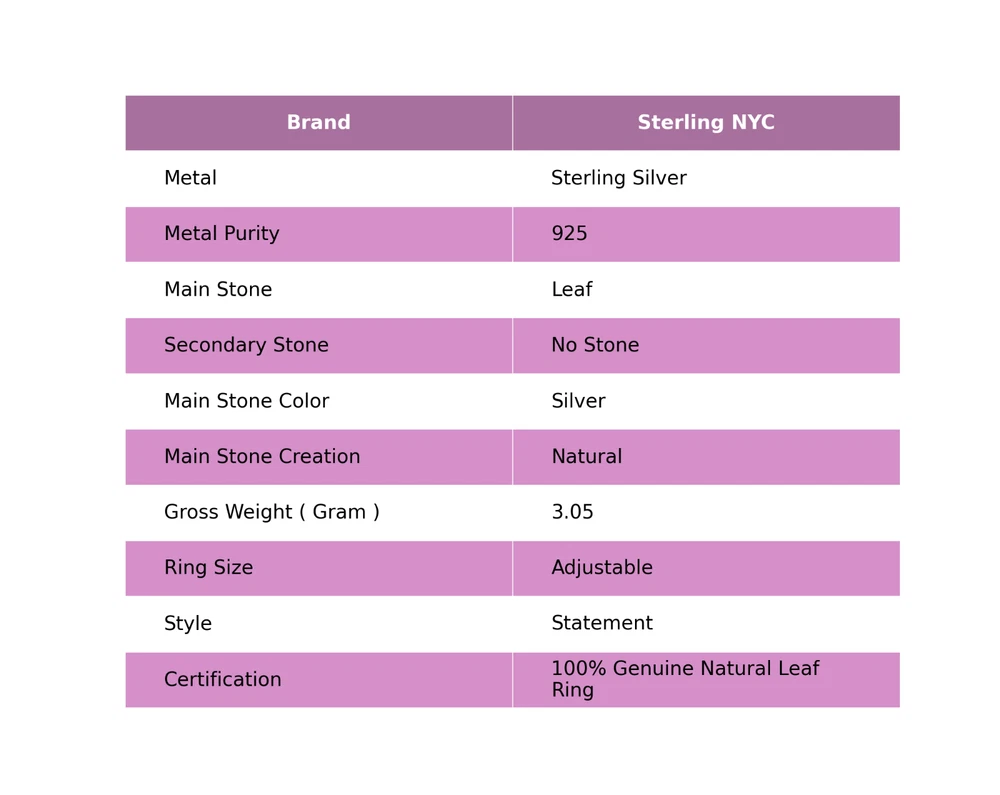 Welcome to Sterling NYC Gift For Women Statement Adjustable Ring 925 Silver Natural Leaf Gemstone Handmade Ring, Sterling Silver Ring, Leaf Ring, Handcrafted Ring Specifications:- SKU : JS-47910 Gemstone : Leaf Stone Shape : As Seen In Picture Metal Purity : 925 Sterling Silver Ring Size : Adjustable US Adjustable : Yes ----------------------------------------------------------------------------------------------------- Experience the timeless allure of silver jewelry, a cherished choice known for its exceptional properties and countless rewards. Explore the captivating charm of its unique attributes, enveloping you with elegance and remarkable healing qualities. Immerse yourself in the enigmatic world of silver, where beauty and benefits harmoniously intertwine. Benefits: Embrace the Elegance : Silver jewelry seamlessly blends accessible luxury with timeless beauty, elevating any jewelry collection without the need for extravagant spending. A Mindful Companion : Adorn yourself with silver jewelry as a gentle nudge towards mindfulness, a tangible reminder to cherish the beauty of every moment. Amplify Positivity : Silver, known for its energy-conducting qualities, is thought to enhance the power of positive intentions and affirmations, aiding in the clear manifestation of your desires. Unleash Self-Expression : Silver jewelry, with its versatile designs, empowers individuals to express their unique style, allowing their personality to shine through every piece. Soothing Serenity : Silver's cooling properties are believed to have a therapeutic effect, bestowing a sense of relief and tranquility upon both body and mind. ----------------------------------------------------------------------------------------------------- For Mother's Day Gift For Father's Day Gift For Promise For Valentine' Day For Halloween Party For Christmas Day Gift For New Year Party For Mom For Her ----------------------------------------------------------------------------------------------------- Discover the impeccable designs tailored just for you, and receive personalized guidance by reaching out to us. Our skilled artisans meticulously handcraft each piece in our workshop, infusing them with love and unwavering attention to detail. Your visit holds immense significance to us, and we are committed to ensuring that your shopping experience is nothing short of exceptional. Thank you for choosing us; we sincerely hope you thoroughly enjoy your shopping journey. Happy shopping! ----------------------------------------------------------------------------------------------------- At SterlingNYC, exquisite craftsmanship meets premium sterling silver gemstone jewelry. Our handcrafted pieces reflect authenticity and uniqueness, a testament to our commitment to excellence. Explore our collection and create your own dazzling jewelry ensemble.