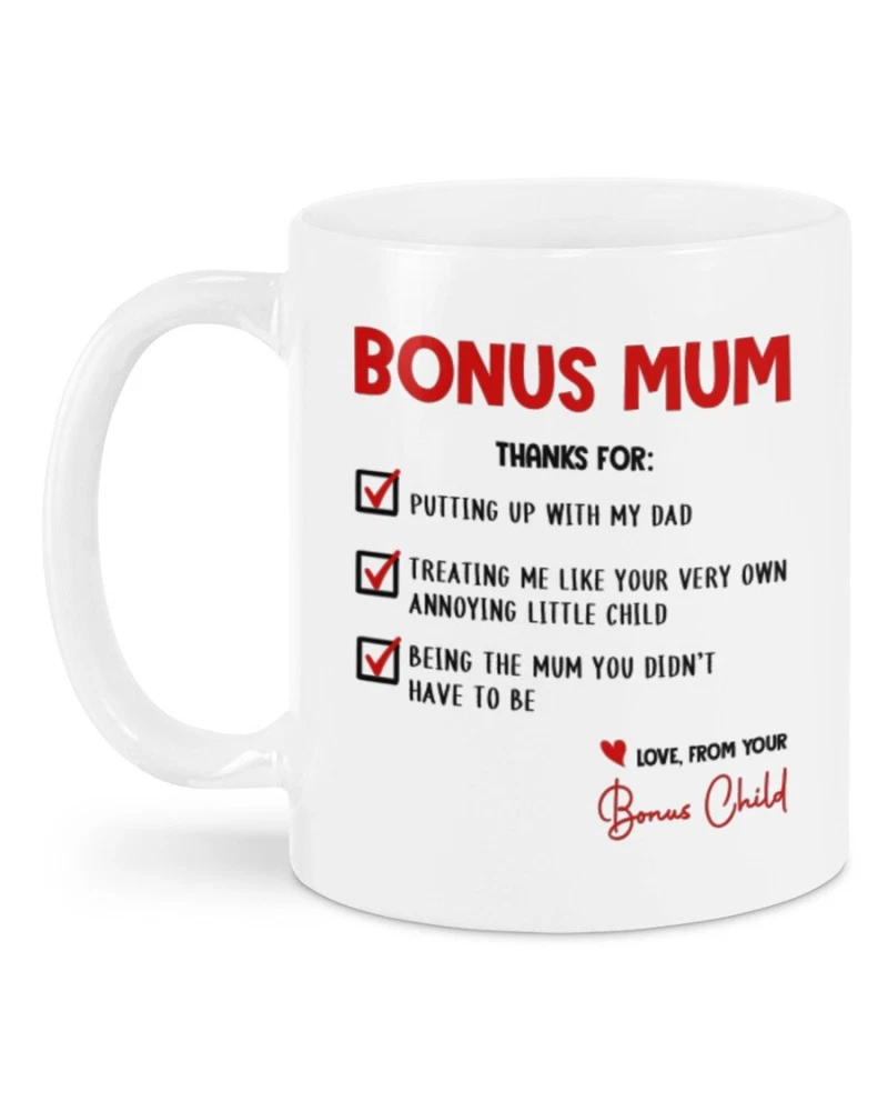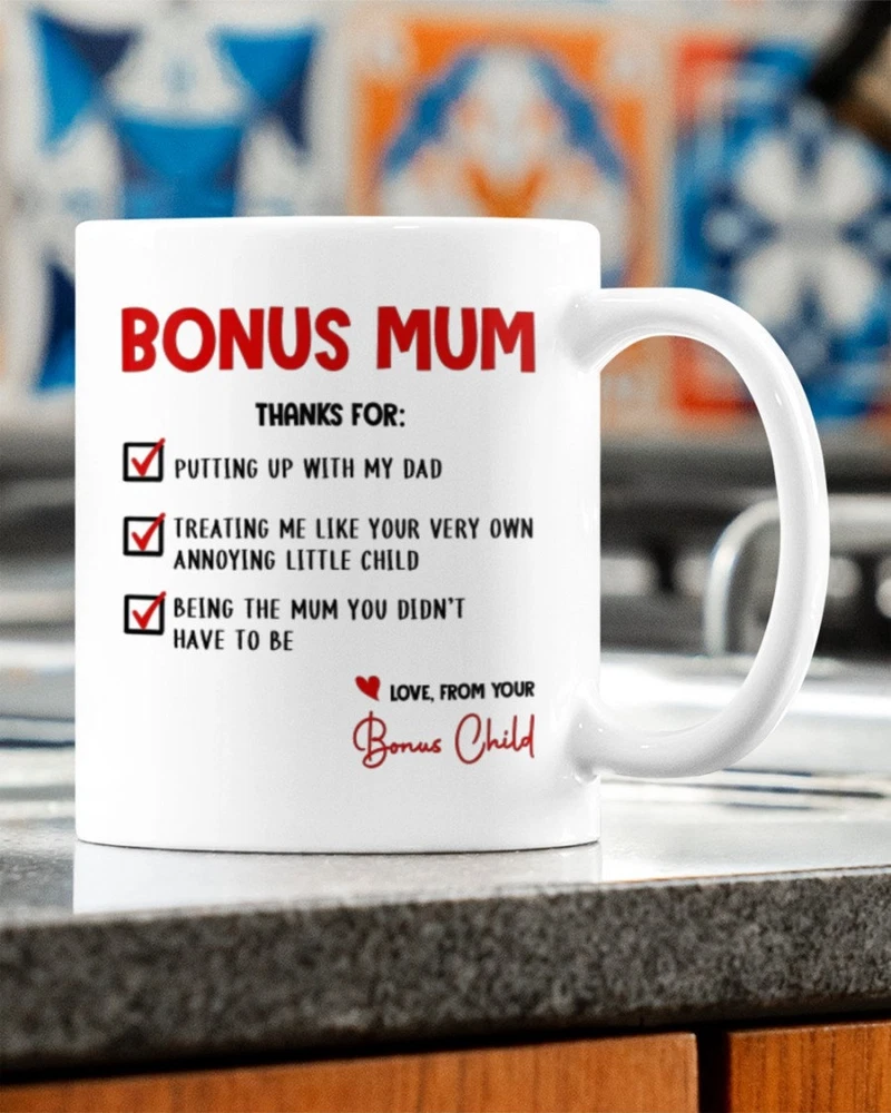 Thanks My Bonus Mom Personalized Coffee Coffee Mug Gift To Bonus Mom From Bonus Product Details.. This high quality 11oz. ceramic white mug has a premium hard coat that provides crisp and vibrant color reproduction sure to last for years. Perfect for all hot & cold beverages. The highest quality printing possible is used. It will never fade no matter how many times you wash it. Material: 100% Ceramic. Print both sides. Dishwasher and Microwave Safe. High Gloss + Premium White Finish. Printed in the U.S.A. Personalized & Custom. We support personalized and custom mug to add custom, when placing an order, you can add notes to the "order note" in shipping address section. Also you can contact us directly via message. Shipping Info. Ready to ship in 1 to 2 business days, All products are made-to-order and proudly printed in the United States. Shipped by USPS and DHL, You will receive your order in 5-7 days. Replace & Refund. All products are defective during shipping broken, chipped will be replaced free of charge. You are not satisfied with the product, we will refund 100% money to you. If any other issues arise, please do not hesitate to message, we would be more than happy to assist you.