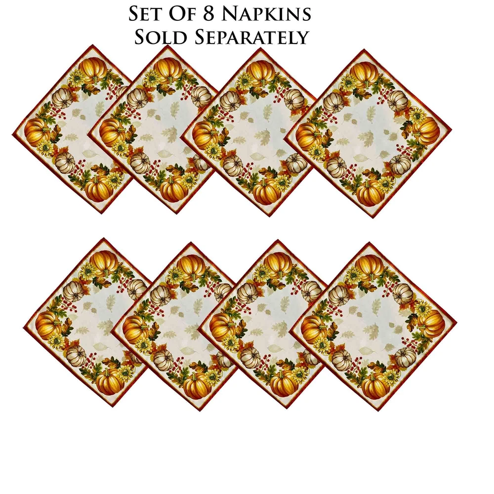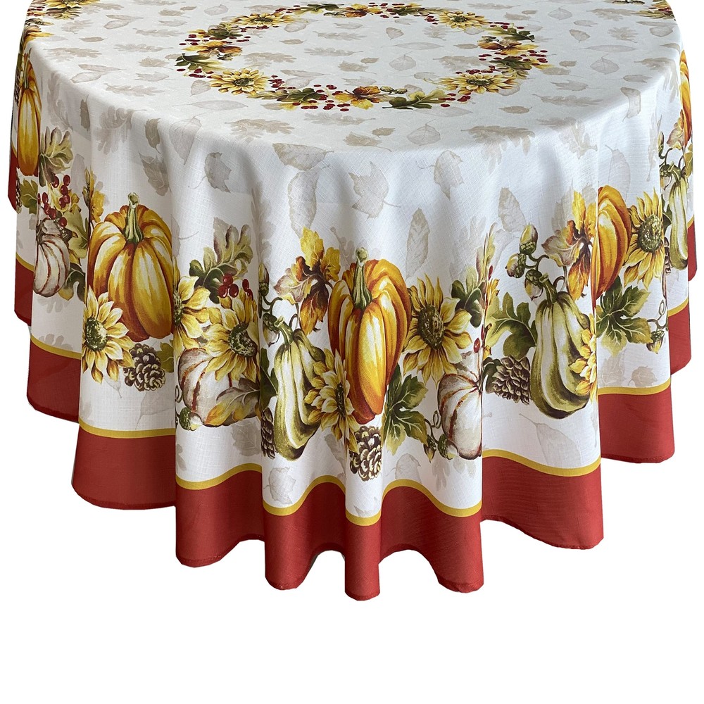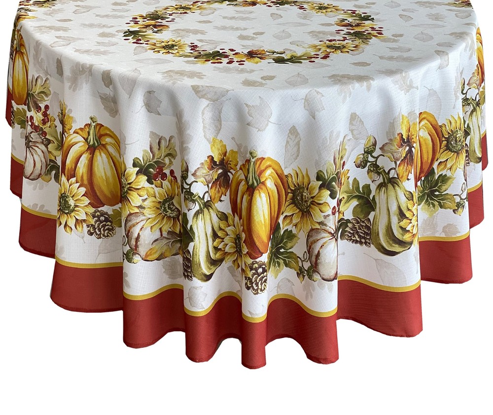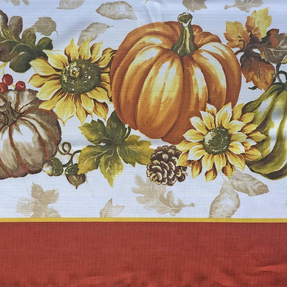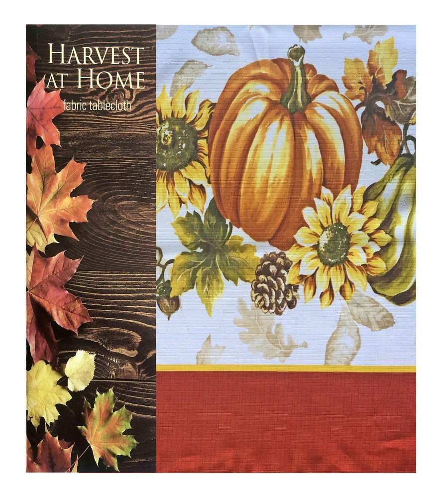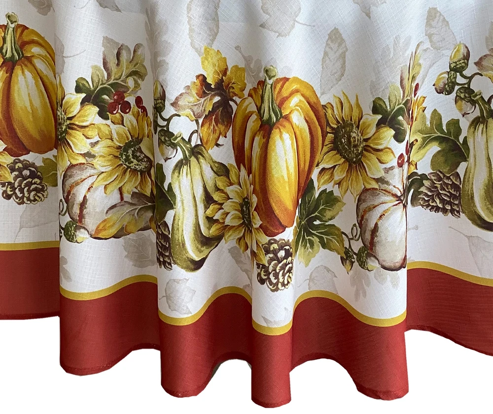 Brilliant Autumn Harvest Bordered Thanksgiving Fabric Tablecloth, Fall Pumpkin and Sunflower Cottage Print Easy Care Tablecloth, 60 Inch x 84 Inch Oval SIZING: 60" x 84" Oval (152 x 213cm) - Fits tables from 36 Inch x 60 Inch to 48 Inch x 72 Inch and Seats 6 to 8 People - Oval STYLING: The Brilliant Autumn Harvest Bordered Thanksgiving Fabric Tablecloth features a magnificent harvest print featuring fall leaves on a creamy background and a bold border of pumpkins, gourds, sunflowers, and acorns with a solid rust border. FEATURES: Festive Easy Care, Soil Resistant and Permanent Press Kitchen and Dining Room Tablecloth for Fall, Autumn and Thanksgiving Dining, Entertaining, Parties, Picnics, Restaurants and Cafeterias. Indoor and Outdoor Thanksgiving Holiday Tablecloths Napkins sold separately. Easy Care 100% polyester construction is machine washable and tumble dry and requires little or no ironing