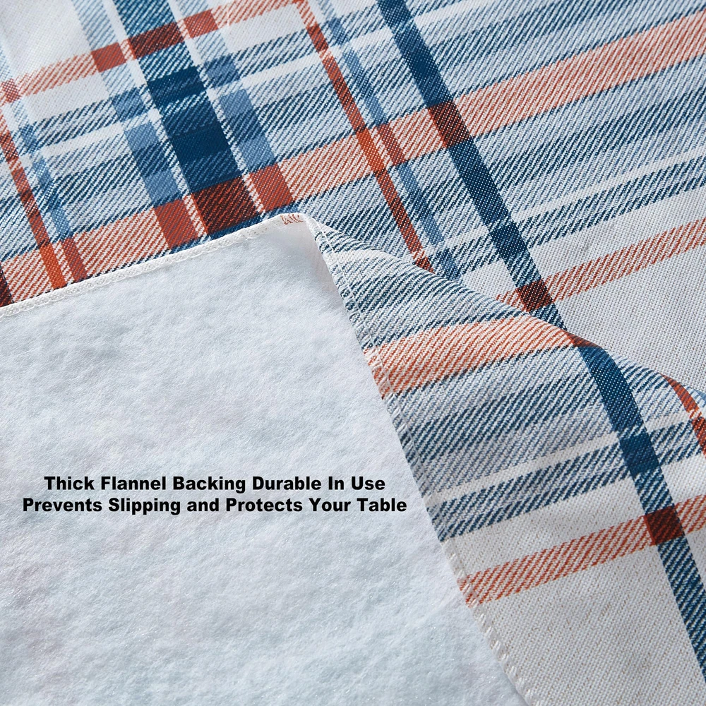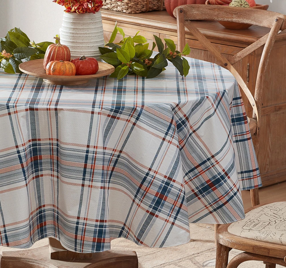 From the Harvest Farmhouse collection by . The Blue Rustic Mountain Plaid Vinyl Flannel Backed Tablecloth is perfect for and year round dining and entertaining throughout the seasons. The Blue Rustic Mountain Plaid Vinyl Flannel Backed Tablecloth is designed to be a favorite for your busy home, kitchen or dining room table or restaurant. The Blue Rustic Mountain Plaid Vinyl Flannel Backed , and Fall Tablecloth is a country rustic pattern that features a medium scale plaid in rust, stonewashed blue and rust on a white colored background. Great for use with adults and children for , Fall and at home or in commercial settings. Perfect for decorating and keeping your kitchen or dining room table protected from everyday accidents. Like plastic, the easy-care vinyl surface can be wiped clean with a damp cloth or sponge. Vinyl top layer adds a protective waterproof layer. Flannel backed to reduce skidding and slipping on most surfaces. Finished with sewn edges. Easy to fold and store when not in use. Great for indoor, outdoor, home, and commercial use alike, the Blue Rustic Mountain Plaid Vinyl Flannel Backed Tablecloth is available in a large selection of sizes and shapes for all of your holiday entertaining needs. Sizes available are: 52 x 52 Square, 52 x 70 Oblong, 60 x 84 Oblong, 60 x 84 Oval, 60 x 102 Oblong, 60 x 120 Oblong and 70 Round. Blue Rustic Mountain Plaid Vinyl Flannel Backed Tablecloth - Stonewashed Blue and Rust Country Plaid Easy Care Vinyl Tablecloth, 70” Round SIZING: 70" Round (178cm) - Fits round tables from 20 Inch x 58 Inch Diameter and Seats 4 to 6 People - Round STYLING: The Blue Rustic Mountain Plaid Vinyl Flannel Backed , and Fall Tablecloth is a country rustic pattern that features a medium scale plaid in rust, stonewashed blue and rust on a white colored background. FEATURES: Beautiful Easy Care Kitchen and Dining Room Tablecloth for Dining, Entertaining, Parties, Picnics, Restaurants and Cafeterias. Indoor and Outdoor Flannel Back Holiday Tablecloths are Easy Care - Just Wipe Clean - No Laundering Needed CARE INSTRUCTIONS:: Vinyl Flannel Backed Tablecloth - For best results use mild soap with damp cloth or sponge on vinyl surface of tablecloth. Do not Iron or machine wash or dry. Materials: Surface 100% Vinyl, Flannel Backing: 100% Polyester