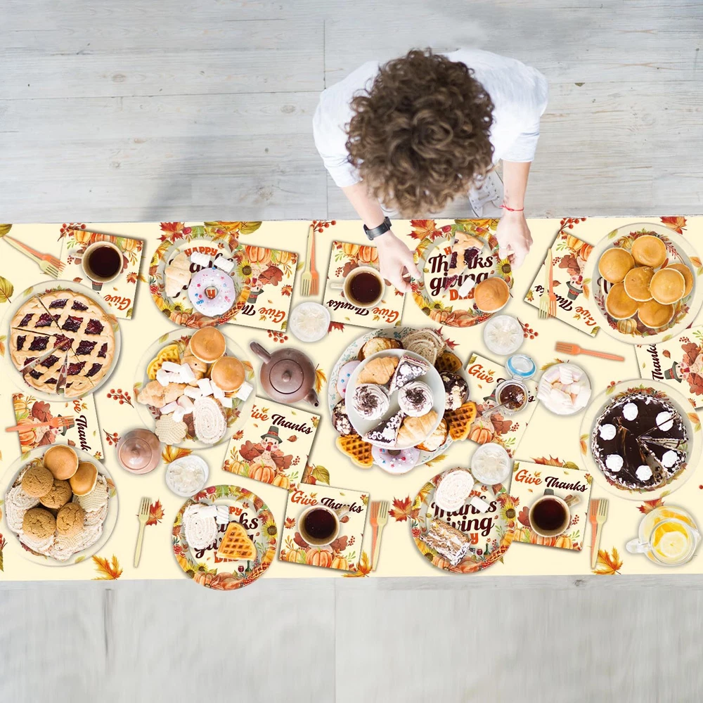 Make Your Thanksgiving Extra Special with This Plates and Napkins Set The Happy Thanksgiving disposable dinnerware set adds the perfect touch to your party, seamlessly complementing other autumn decorations to make your celebration truly unique. Set Includes: 2 pcs 54*108 inch tablecloths 24 pcs 9-inch disposable dinner plates 24 pcs 7-inch paper dessert plates 24 pcs napkins featuring classic Thanksgiving designs 24 pcs forks (2 colors) Features: -Convenient and Disposable: No need to worry about washing up! Made from high-quality cardboard, this tableware is safe, odorless, and durable, protecting your table from scratches and spills. Enjoy every moment of the party with confidence. -Classic Thanksgiving Design: Featuring traditional autumn elements like turkeys, pumpkins, and maple leaves, this set pairs perfectly with other Thanksgiving decorations such as Happy Thanksgiving banners, creating a warm and festive atmosphere that will make your event truly memorable. Bring this stylish and fun Thanksgiving dinnerware set to your party and create lasting memories with family, kids, and friends. Comprehensive Set: The Thanksgiving tableware set includes 24 9-inch disposable dinner plates, 24 7-inch dessert plates, 24 colorful plastic forks, 24 printed napkins, and 2 tablecloths, providing everything you need to serve 24 guests at once. Disposable Convenience: The Thanksgiving dinnerware set offers an easy and hassle-free party experience. Forget about cleaning up—simply toss everything out after use, giving you more time to enjoy quality moments with your kids, family, and friends. Quality Materials: The Thanksgiving dinner plates are crafted from premium quality, thickened cardboard, making them durable and heat-resistant. This ensures a convenient and safe dining experience, allowing you to fully enjoy your party. Stylish and Durable: Featuring classic Thanksgiving elements like turkeys, pumpkins, and maple leaves, the Thanksgiving plates napkins, and tablecloth set is printed with bright, fade-resistant colors, adding joy and lasting memories to your celebrations. Perfectly Coordinated: Thanksgiving party supplies pair beautifully with other fall decorations, to create a warm atmosphere. It’s ideal for any Thanksgiving event, whether it’s a kids’ Thanksgiving party, a family gathering, or a Friendsgiving party.