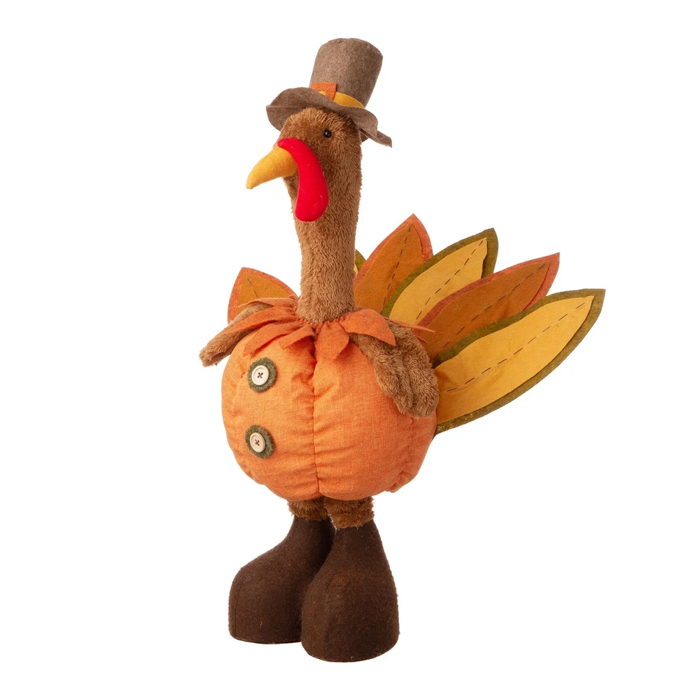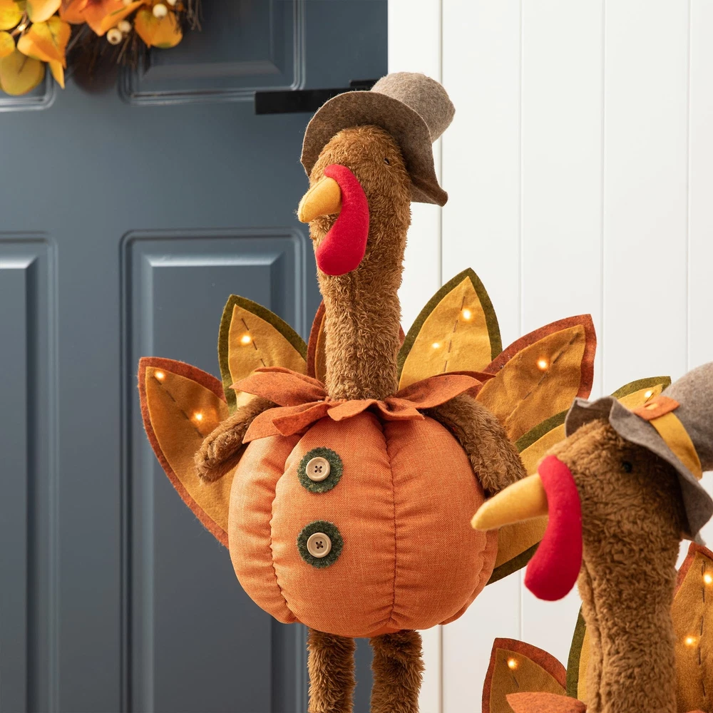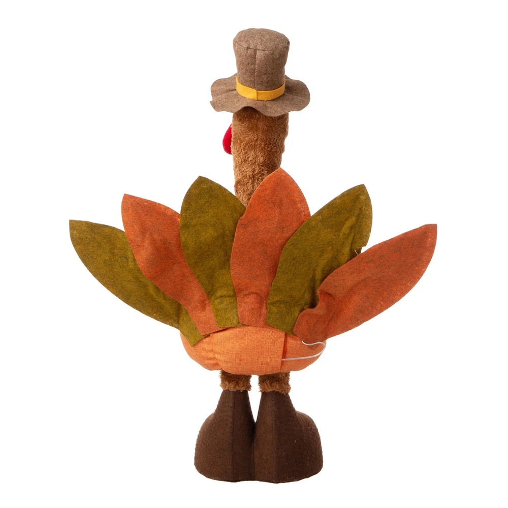 37.00"H/24.00"H Fabric Turkey Standing Decor, With Telescoping Legs This thanksgiving decorations turkey plush has realistic design and distinctive telescoping legs, simply irresistible! Makes for a festive centerpiece, greet your visitors during the Thanksgiving holiday. Measures 14.17" Length, 7.48" Width, 24" - 37"Height( With Telescoping Legs) Stuffed with polyester, Warm white Led Light With plush finish, this turkey has a decorative cute hat and fabric body It features festive fall colors such as orange, yellow and dark red which will surely enrich you home.