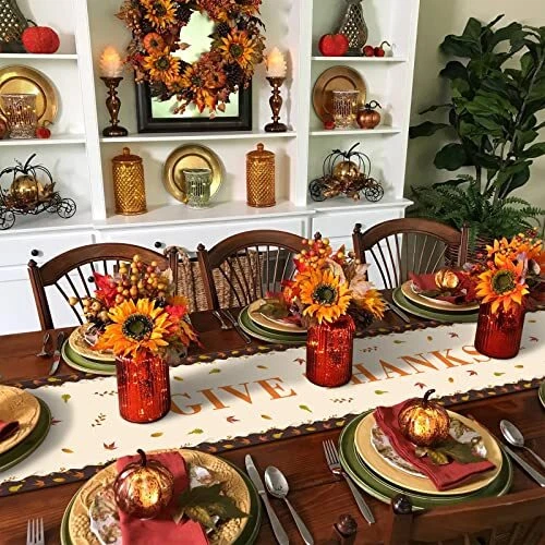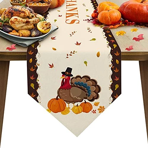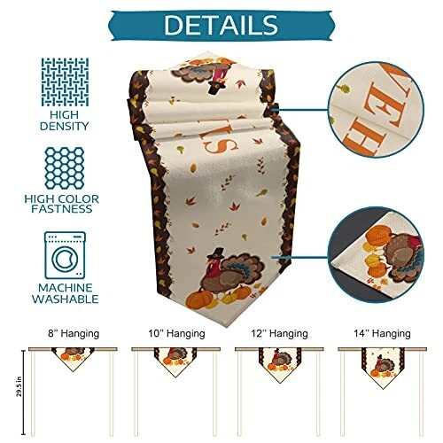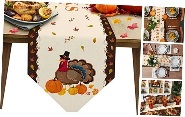 30 Days Return Policy Fast Delivery Trusted seller Thanksgiving Table Runner 108 inches Long Turkey with Pumpkin Maple Leaves Non-Slip Washable Burlap Table Linens for Family Dinner, Outdoor or Indoor Parties, Wedding, Gathering Table Decorations Product Description Multifunctional Use - Our table runners are measured as 13 x 108 inches. This table runners are perfect for most rectangular tables, round tables, square tables, candle holders, mantels, shoe cabinets Premium Material - Our table runners are made of linen, durable and the table runners can be reused. This table runners are will not scratch the table, protect the table from scratch, stain Unique Design - This table runners are beautifully sewn with stitches, and the stitches are not easy to loosen. The color of the table runners are bright, and it is not easy to fade after long time to use, which can bring a new look to your table Gift ideas - On housewarming day, anniversary, birthday, autumn, Halloween, Thanksgiving, tablecloths can be exquisite gifts for mothers, fathers and friends Easy Care - Machine washable. Low temperature tumble drying. Don't bleach. Don’t worry, our table runners are not easily deformed after many time to clean Shipping Returns Payment Shipping Shipping is FREE to all addresses other than APO/PO boxes in the lower 48 states. All our stock ships from US-based warehouses. Shipped via USPS or UPS (depending on location and package weight) Unless stated otherwise, all orders will ship within 24-72 hours of your payment being processed. Check our feedback to see the great reviews of FAST shipping we offer. Returns As our valued customer, we will do our best to make sure the product you receive arrives to you on time and as expected. If you are not satisfied with your purchase, please contact us within 30 days of receiving your order to process a return. Payment We currently accept payment via eBay managed payments only. Once payment is cleared, we will dispatch your shipment within 1-3 business days. Please refer to the "Shipping" tab for more information regarding shipping speed to your destination.