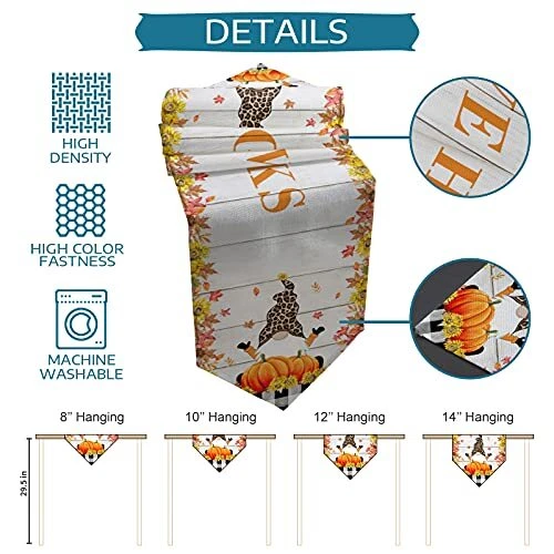 30 Days Return Policy Fast Delivery Trusted seller Thanksgiving Table Runner 120 inches Long Gnome with Pumpkin Wooden Plank Non-Slip Washable Burlap Table Linens for Family Dinner, Outdoor or Indoor Parties, Wedding, Gathering Table Decorations Product Description Multifunctional Use - Our table runners are measured as 13 x 120 inches. This table runners are perfect for most rectangular tables, round tables, square tables, candle holders, mantels, shoe cabinets Premium Material - Our table runners are made of linen, durable and the table runners can be reused. This table runners are will not scratch the table, protect the table from scratch, stain Unique Design - This table runners are beautifully sewn with stitches, and the stitches are not easy to loosen. The color of the table runners are bright, and it is not easy to fade after long time to use, which can bring a new look to your table Gift ideas - On housewarming day, anniversary, birthday, autumn, Halloween, Thanksgiving, tablecloths can be exquisite gifts for mothers, fathers and friends Easy Care - Machine washable. Low temperature tumble drying. Don't bleach. Don’t worry, our table runners are not easily deformed after many time to clean Shipping Returns Payment Shipping Shipping is FREE to all addresses other than APO/PO boxes in the lower 48 states. All our stock ships from US-based warehouses. Shipped via USPS or UPS (depending on location and package weight) Unless stated otherwise, all orders will ship within 24-72 hours of your payment being processed. Check our feedback to see the great reviews of FAST shipping we offer. Returns As our valued customer, we will do our best to make sure the product you receive arrives to you on time and as expected. If you are not satisfied with your purchase, please contact us within 30 days of receiving your order to process a return. Payment We currently accept payment via eBay managed payments only. Once payment is cleared, we will dispatch your shipment within 1-3 business days. Please refer to the "Shipping" tab for more information regarding shipping speed to your destination.