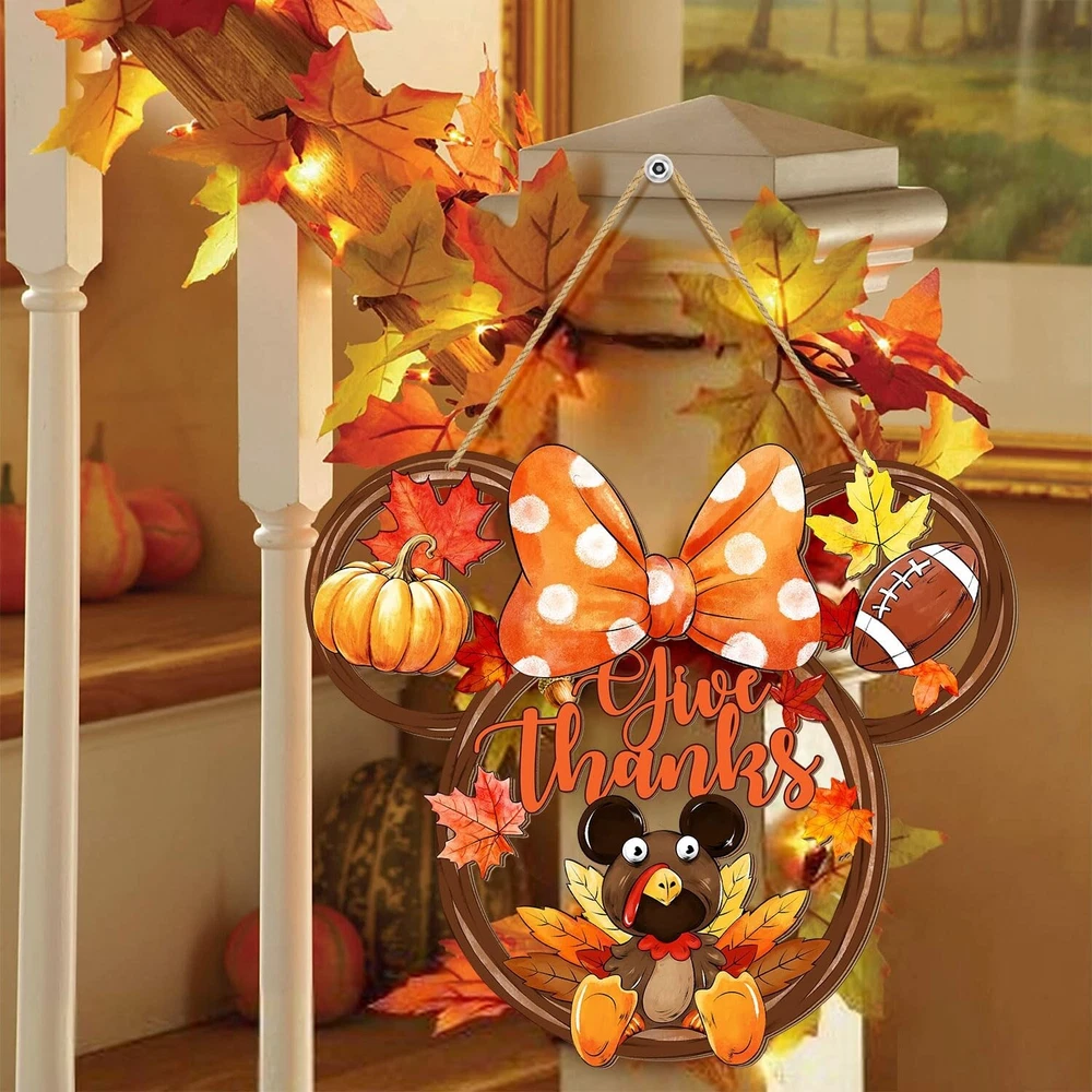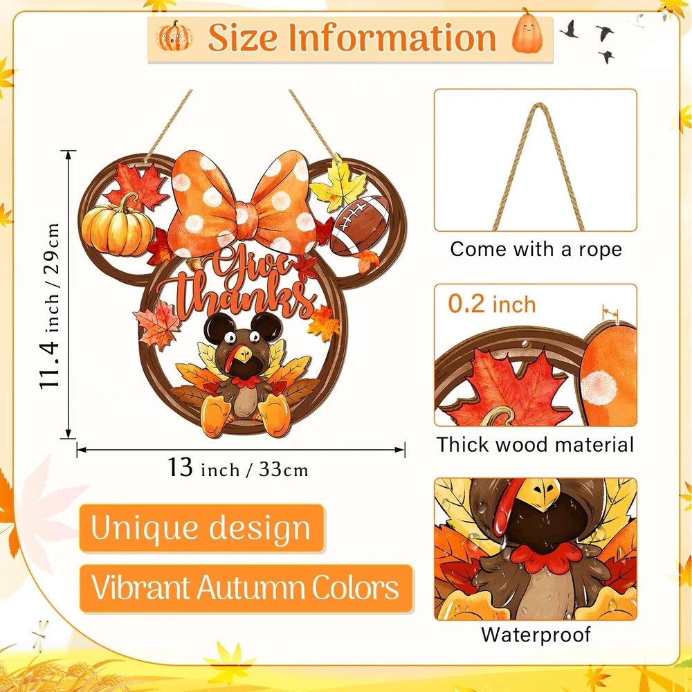 Thanksgiving Turkey Door Sign Mouse Shaped, Give Thanks Wooden Maple Leaves Pumpkin Hanging Decor for Front Door, Fall Wood Wreath Wall Decor for Autumn Harvest Home Decorations Product Details Color: Give Thanks Turkey Brand: Sionoiur Material: Wood Mounting Type: Door Mount Manufacturer: Sionoiur Product Dimensions: 13 x 11.4 x 0.04 inches Item Weight: 4.6 ounces Manufacturer: Sionoiur Country of Origin: China Item model number: MP-09601 Date First Available: August 22, 2024 What You Will Get: The package comes with 1 piece of wooden turkey door sign. Size:33*29cm (13*11.4inches), offering a substantial size for impactful decorative display. Crafted with vibrant colors and intricate details, this decorative piece is sure to bring a touch of autumn warmth to your entryway. Hang it on your front door or porch to greet guests with a delightful autumnal display. Premium Material: Crafted from high-quality wood with intricate laser-cut detailing for long-lasting use year after year. This lightweight sign is easy to hang and adds a whimsical touch to your fall decor. The vibrant colors and intricate details are sure to catch the eye of passersby and add a touch of festive flair to your autumn decor. Suitable for indoor and outdoor hanging. Unique Design: This Thanksgiving turkey door sign features a whimsical mouse character surrounded by fall foliage, pumpkins, and a football. The wooden plaque bears the heartwarming message 'Give Thanks', reminding you and your guests of the true essence of the holiday. Easy to Display: Includes a jute rope hanger for convenient wall or door mounting, adding a touch of rustic charm. Can be hung on doors, walls, or used as a wreath or yard decoration. This hanging sign will make a great addition to your Thanksgiving party. Decoration Scenes: Suitable for both indoor and outdoor use, adding a touch of fall whimsy to your home. Hanging it on the front door, back door, room door, yard, wall position near the entrance, even can use it in cafe and restaurant, office and business to greet guests. Eye-catching Thanksgiving Decorations This charming Thanksgiving door sign is the perfect way to welcome guests and spread holiday cheer! Crafted from high- quality wood, it features a delightful image of a turkey surrounded by fall leaves, a pumpkin, and a football. The vibrant colors and intricate details bring the festive scene to life. Product Details Material: Thick solid wood Color: As shown in the picture Size: Approx 13x11.4inches (33x29cm) Package Including: 1 x turkey hanging sign Premium Material Crafted from high-quality wood, this sign measures approximately 13x11.4inches, this lightweight sign is easy to hang and adds a whimsical touch to your fall decor. The vibrant colors and intricate details are sure to catch the eye of passersby and add a touch of festive flair to your autumn decor. Seasonal Hanging Decor This wood Thanksgiving Day sign is made of thick wood material, so it is durable to use and not easy to break. Whether you're celebrating harvest or simply embracing the cozy ambiance of autumn, this delightful door sign is a must-have for any home. Versatile Display Hang this delightful piece on your front door, wall, or anywhere in your home to add a touch of rustic warmth and autumnal charm. With its eye-catching design and meaningful sentiment, this Thanksgiving door sign is sure to become a cherished part of your seasonal decorations for years to come. Suitable to hang on the indoor and outdoor , porch, entryway, above the fireplace, and so on.