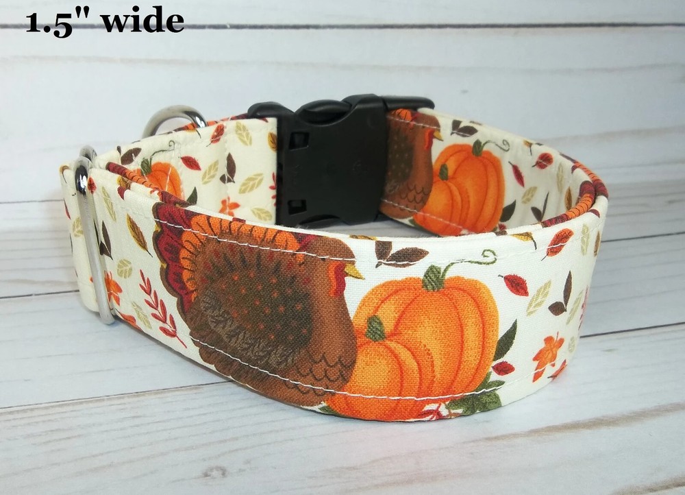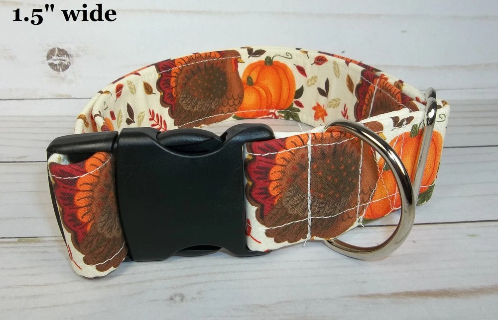 Thanksgiving Turkey Pumpkin Dog Collar made by Terri's Dog Collars ♥ ♥ ♥ ♥ ♥ ♥ Each buy it now of this auction is for one handmade Terri's Dog Collar ~ size your choice Size: adjustable from 7 - 26" depending upon size chosen from the drop down menu Width: varies 5/8" wide 7 - 10" 5/8" wide 10 - 15 3/4" wide 10 - 15" 3/4" wide 12 - 17" 13 - 18" 1" wide 15 - 23" 1" wide 17 - 26" 1" wide 1.5" wide 15 - 23" 1.5" wide 17 - 26" Fabric: thanksgiving turkey and orange pumpkins Webbing: Poly Pro Buckle: Heavy Duty Contoured Plastic side release We take great pride and care in making our dog collars. We sew high quality fabric over a Poly pro webbing for durability and strength and yet a great weight on your dog's neck. We also use a heavy duty welded D-ring so that your dog can pull as much as he / she wants when walking and you'll still be safe. We use a heavy duty contoured side release buckle. The contour feels great on your dogs neck and the heavy duty stands up to lots and lots of wear. Before you order, you need to measure your dog's neck and make sure it will fit. Please e-mail me with questions or special orders to be listed on ebay for you Other Details : You will receive a collar like in the pictures. The collar in the picture is 1" wide large but has been adjusted to the smallest size of 17". Your collar will be made when you order. We are smoke free / cigarette free work space. However, we do have dogs and love them very much. ♥ ♥ ♥ ♥ ♥ ♥ We accept eBay payments at this time. If you need to change your shipping address, please do so BEFORE you make your payment. Also, please attach any information that you think we will need, to your payment in the comments section. ♥ ♥ ♥ ♥ ♥ ♥ Shipping by first class mail with delivery confirmation: $5.35 We do combine shipping We ship Monday - Friday and will ship most orders within 2 business days (not calendar days) ♥ ♥ ♥ ♥ ♥ ♥ Thank you !!! Thank you for taking time to visit our auction and store. Happy eBaying !! Model NOT included: She just likes showing off her custom made collars !!!!