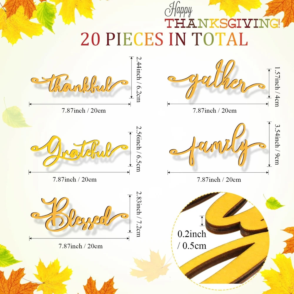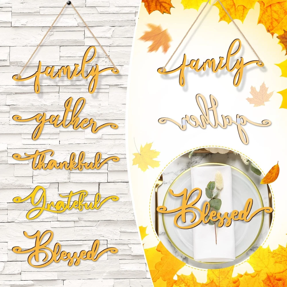 Thanksgiving Wood Cutout Thankful Letter Plate Ornament Rustic Grateful Blessed Wood Table Sign Family Gather Cutout Wall Decor for Fall Home Reunion Dinner supply (Gold, 20 Pieces) Product Details Color: Gold Item Package Quantity: 20 Brand: Jetec MPN: B0B5CP3PFC_CA NARF UPC: Does not apply EAN: Does not apply Material: Wood, Jute Color: Gold Occasion: Thanksgiving Theme: Rustic,Thanksgiving Brand: Jetec Material: Wood, Jute Color: Gold Occasion: Thanksgiving Theme: Rustic,Thanksgiving Brand: Jetec Pattern: Letter Print Item Weight: 0.2 Kilograms Number of Pieces: 20 Product Dimensions: 7.87"L x 7.87"W Manufacturer: Jetec Item Weight: 7 ounces Country of Origin: China Item model number: B0B5CP3PFC_CA NARF Date First Available: June 29, 2022 What's included: the package includes 20 pieces of Thanksgiving wood cutout signs in 5 different styles, [Blessed], [Grateful], [Thankful], [Family] and [Gather], 1 roll of rope and foam double-sided tapes, and the enough quantity and a nice combination can meet your decor needs Lightweight and quality material: these Thanksgiving word signs are made of quality wood, well polished and no burrs, not easy to break or fade, not easy to deform or corrode, which you can use with confidence for a long time Size information: each wooden cutout letter sign length measures approx. 7.87 inches, and the jute rope is about 3.28 feet in length, and the proper size can well match with other decorations, and the rope is long enough for you to use Delicate design: these blessed, grateful, thankful , family, gather plate signs are designed with cutout words, and paired with classic color, which is a classic and exquisite design, and can leave a deep impression on your guest and friends Widely applied: these wooden cutout plate signs can be applied on various occasions, such as Thanksgiving, Christmas, harvest festival, family union parties, housewarming parties or other proper occasions Features: Easy to use and carry: These wooden cutout letter signs are lightweight and easy to use, which you can directly place them on the dessert table, counter top, dining table, or hang or stick on the wall, door, window, wreath and more. Nice party gift: These wooden words for crafts can be shared with your friends, colleagues, family members, neighbors at Thanksgiving, harvest festival, family union parties, housewarming parties, and more, and they can also be applied as decor accessories. Specifications: Material: wood Color: as the picture shown Size: as photos shown Rope: 3.28 feet in length Package includes: 20 x Thanksgiving wooden cutout signs Notes: Please check the size carefully before buying. Due to different screens, the colors may be slightly different. Manual measurements, please allow slight size errors. Winding risk may exist, please keep away from little kids.