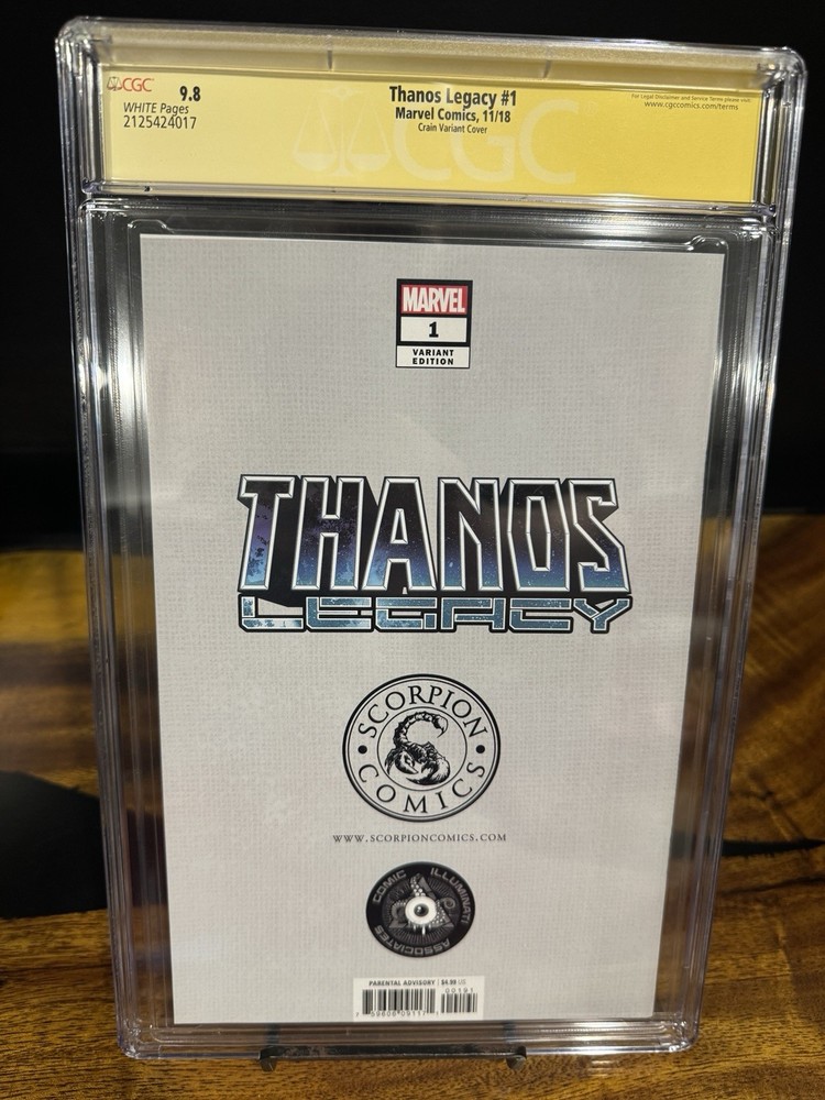 The Thanos Legacy #1 SS - CGC 9.8 - Clayton Crain Signature - Variant Cover is a single issue comic book featuring the character Thanos. The variant cover is signed by artist Clayton Crain and professionally graded by Certified Guaranty Company (CGC) as a 9.8 Near Mint/Mint grade. Published by Marvel Comics in the Modern Age era, this English-language comic is intended for a general audience and belongs to the action, superheroes, and adventure genres. This limited edition cover variant was released at New York Comic Con and is a highly collectible item for fans of the legacy series.