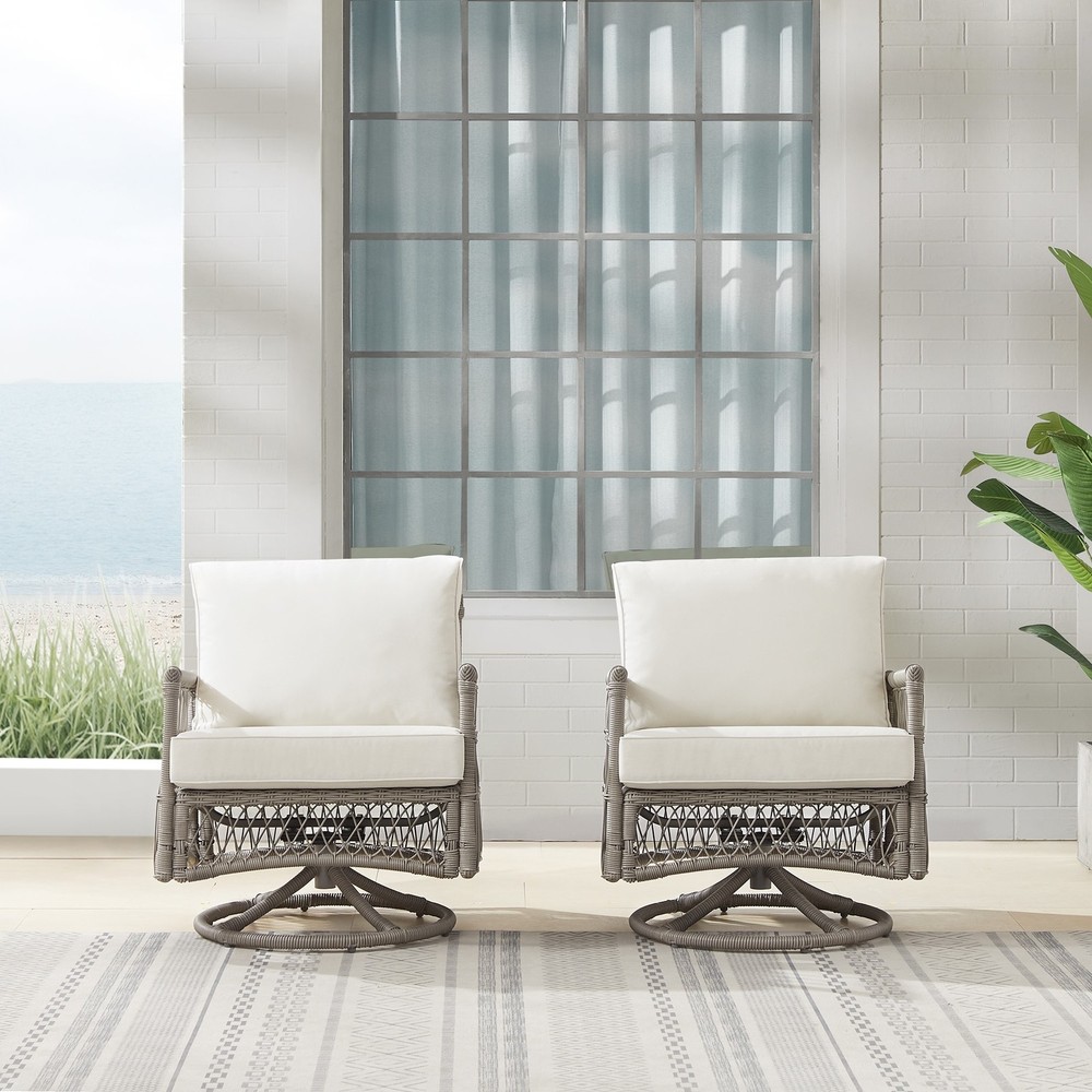 Create the perfect island oasis with the Thatcher 2Pc Outdoor Wicker Swivel Rocker Chair Set. With a strong steel frame and handwoven driftwood resin wicker, the Thatcher chair set is designed to last outdoors through any weather. Enjoy smooth, easy 360-degree swivel motion and rocking chair bases with 4" thick seat and back cushions for ultimate comfort. The UV-resistant construction and moisture-resistant cushion cores make it ready for any season, while the creme cushion covers and modern coastal design bring a touch of charm to any outdoor space.Features: Sturdy steel frame Handwoven driftwood resin wicker UV-resistant all-weather construction 360-degree swivel chair base 4" thick seat and back cushions Weather-resistant cushion cores Removable cushion covers Modern coastal Free Shipping Over $49.99* Details Thatcher 2Pc Outdoor Wicker Swivel Rocker Chair Set Product Description: Create the perfect island oasis with the Thatcher 2Pc Outdoor Wicker Swivel Rocker Chair Set. With a strong steel frame and handwoven driftwood resin wicker, the Thatcher chair set is designed to last outdoors through any weather. Enjoy smooth, easy 360-degree swivel motion and rocking chair bases with 4" thick seat and back cushions for ultimate comfort. The UV-resistant construction and moisture-resistant cushion cores make it ready for any season, while the creme cushion covers and modern coastal design bring a touch of charm to any outdoor space. Features: Sturdy steel frame Handwoven driftwood resin wicker UV-resistant all-weather construction 360-degree swivel chair base 4" thick seat and back cushions Weather-resistant cushion cores Removable cushion covers Modern coastal design Additional Details: Cushion covers made of high-performance solution-dyed polyester Cushion covers are machine washable
