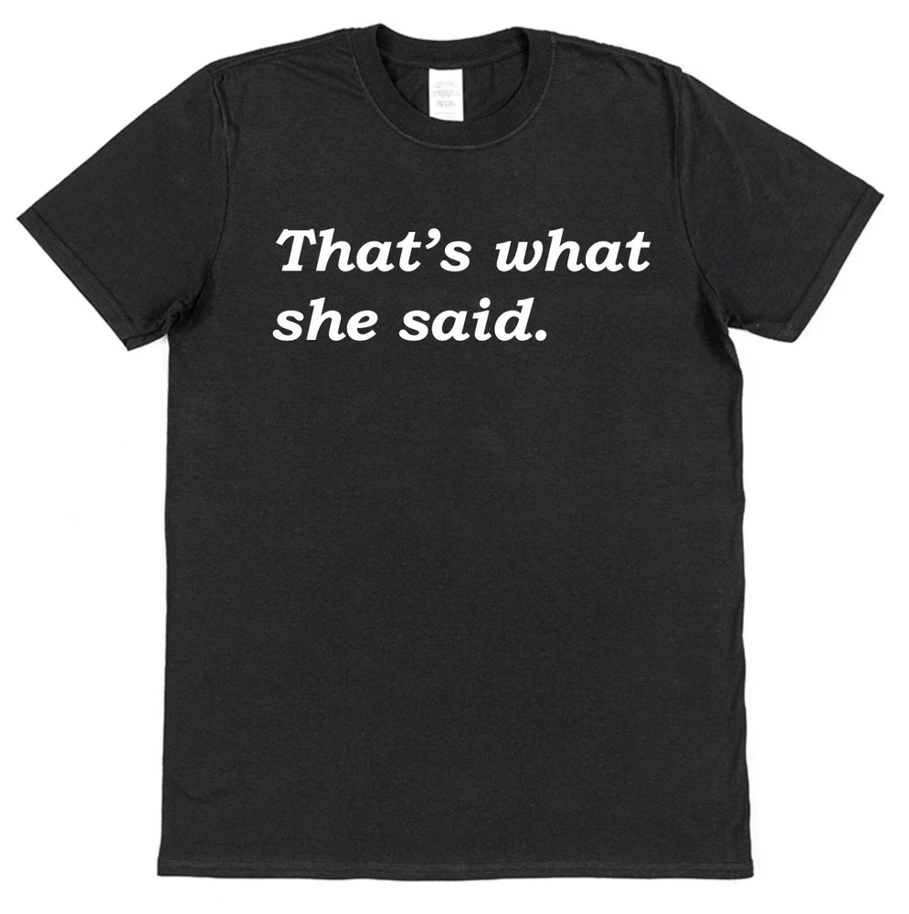 Funny Slogan T-shirt. That's what she said. Brand new 100% Cotton. Comfortable regular fit. Ideal gift for husband at Christmas, Valentine's Day or his birthday or... Buy this tee to inject some humour into your wardrobe. Click My Clobber T-Shirts are 100% cotton so are comfortable and breathable. They've been made to last with re-enforced seams to eliminate separation and double stitched hem and sleeves for durability. This T-shirt was designed and printed in the UK. We specialise in high quality T-shirt printing and provide a comfortable product that will last and last. Men’s funny slogan T-shirts are always well received. Grab one today. Sizes Width is measured across garment 1cm down from armholes. Length is measured from highest point of shoulder to bottom edge of garment. Small - Width 46cm, Length 71cm (To fit 34''-36'') Medium - Width 51cm, Length 74cm (To fit 38''-40'') Large - Width 56cm, Length 76cm (To fit 42''-44'') XL - Width 61cm, Length 79cm (To fit 46''-48'') 2XL - Width 66cm, Length 81cm (To fit 50''-52'') 3XL - Width 71cm, Length 84cm (To fit 54''-56'') Please contact us if you have any questions or if you can't find what you're looking for. We always do our best to help.