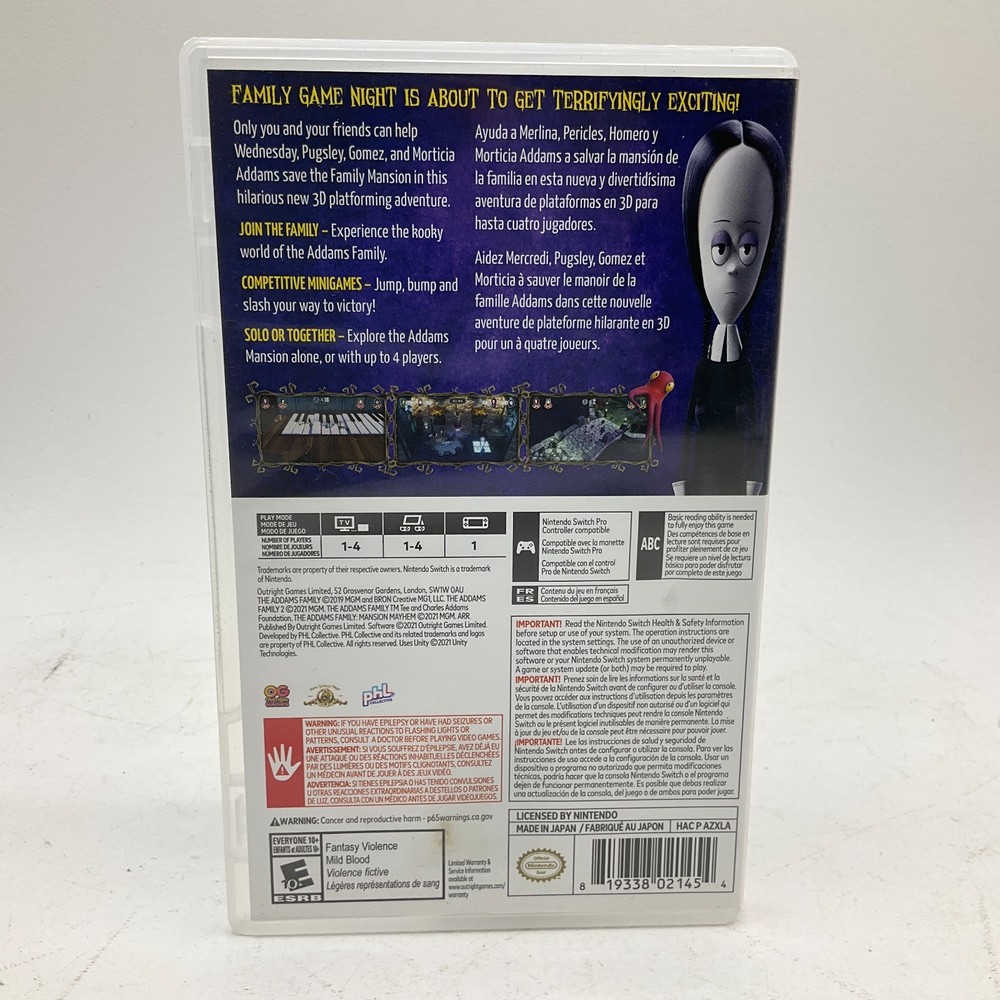 You are looking at a The Addams Family Mansion Mayhem Nintendo Switch This item is in good previously owned condition. Tested & working! There is a small tear in the back of the game art. Please see all pictures for details! About Us Customer service is our #1 priority! If for any reason you are dissatisfied with your purchase we offer a 30 day money back guarantee unless otherwise noted in the listing (AS-IS/For Parts - No returns.) We only accept items back in the condition that they were sent to you. Items that are listed AS-IS are not eligible for this money back guarantee. If you are unhappy with your purchase PLEASE contact us BEFORE leaving feedback or contacting eBay so we can work with you to resolve any problems. Shipping When we charge shipping to our customers we only pass on to our buyers exact shipping costs - no added fees. We offer combined shipping for multiple items purchased, so if you purchase more than 1 item from us, please wait for us to combine shipping costs. We require signature confirmation on all items that sell for $750.00 & more per eBay's selling policy. We also insurance all items that sell for $250.00 & more. PLEASE NOTE: WE DO NOT WORK/SHIP ON HOLIDAYS OR WEEKENDS! We use the eBay Global Shipping program for international shipping. DLLR License #991 Please note, we are not an authorized distributor or manufacture's representative of this item. *This product may contain a chemical known to the state of California to cause cancer and birth defects or other reproductive harm*