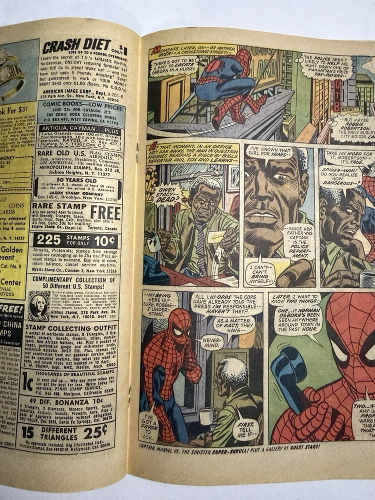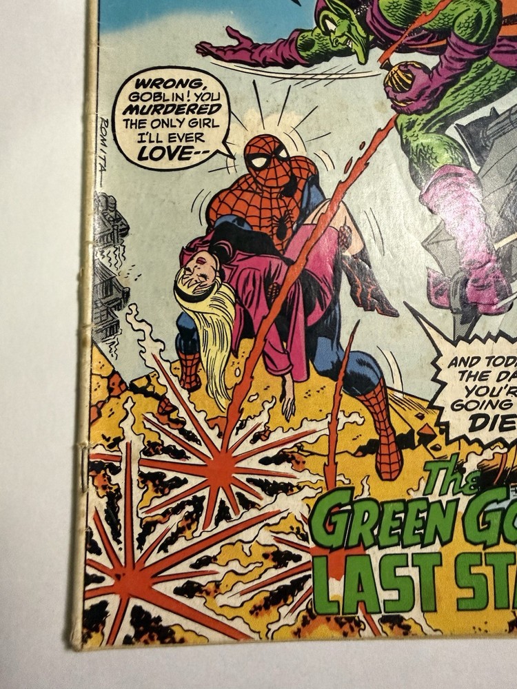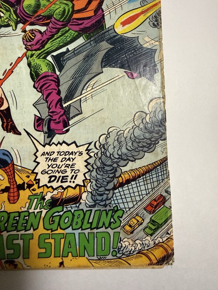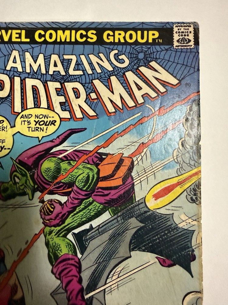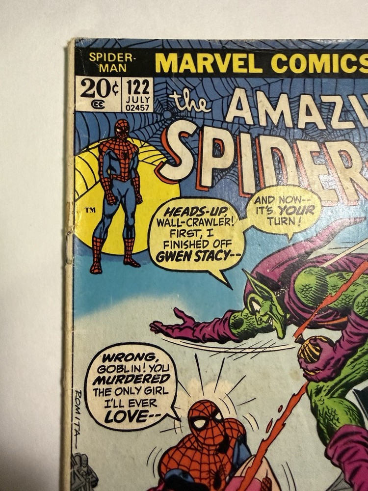 Amazing Spider-Man #122 Key info: Death of the Green Goblin Grade: 4.0 VG Notes: slight spine roll, spine stress, soft corners, staining to spine and back cover, light tanning to front right side cover Please review all pictures Socials: ItsAliveComicsNYC