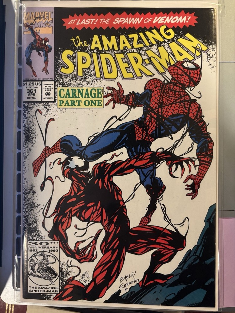 The Amazing Spider-Man #361, published by Marvel Comics in April 1992, features the first full appearance of the villain Carnage (Cletus Kasady). The issue, part of the Modern Age era, includes characters like Spider-Man (Peter Parker), Mary Jane Watson Parker, and Venom (Eddie Brock). With artwork by Randy Emberlin, David Michelinie, Bob Sharen, and Mark Bagley, this English-language comic is a valuable collectible for fans of superhero genre comics.