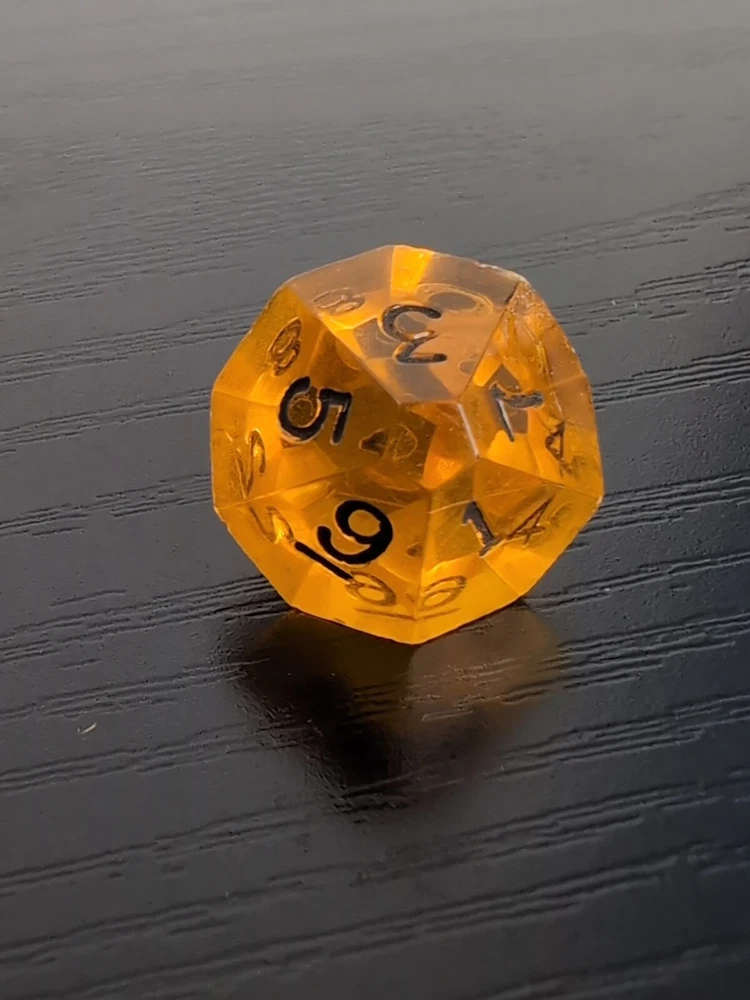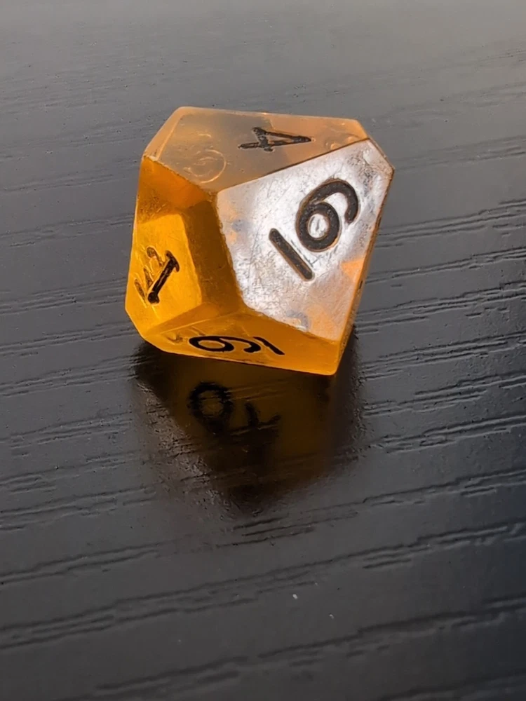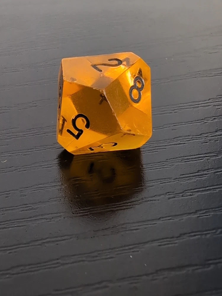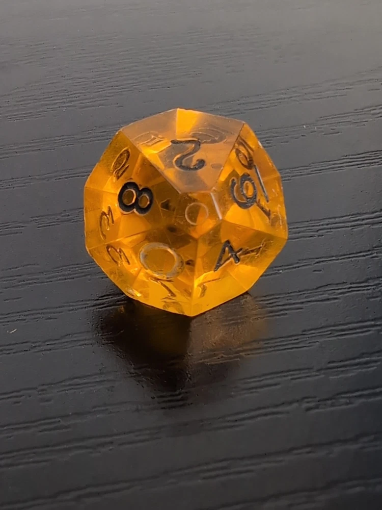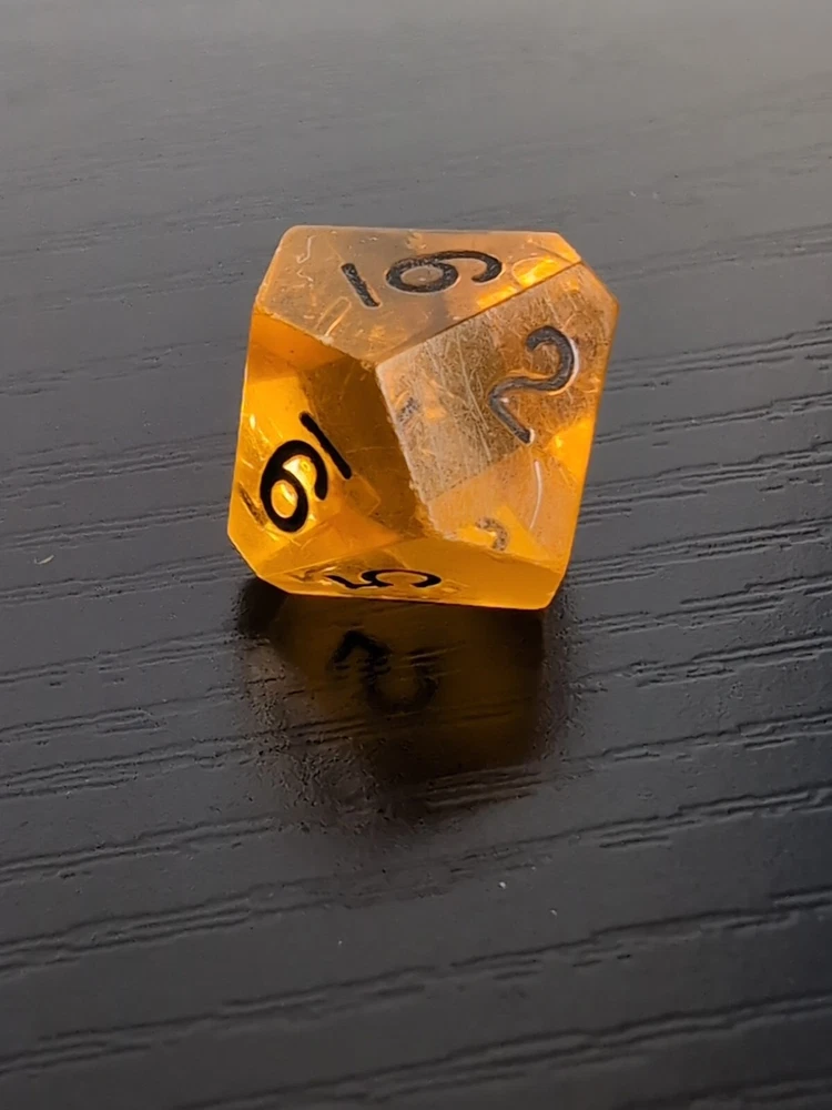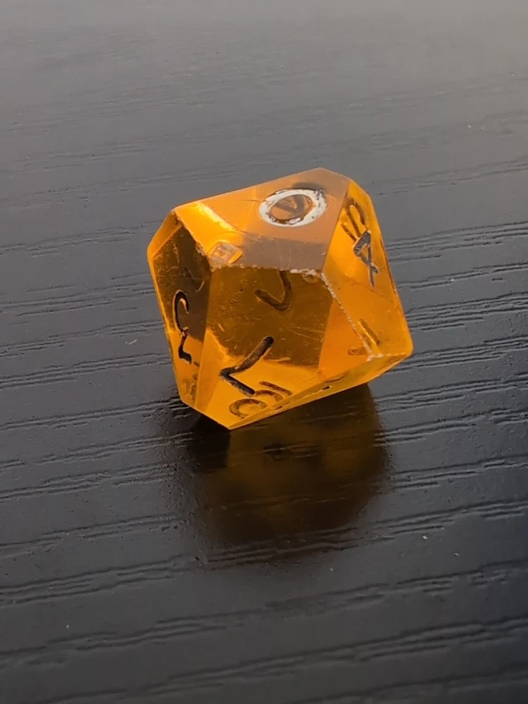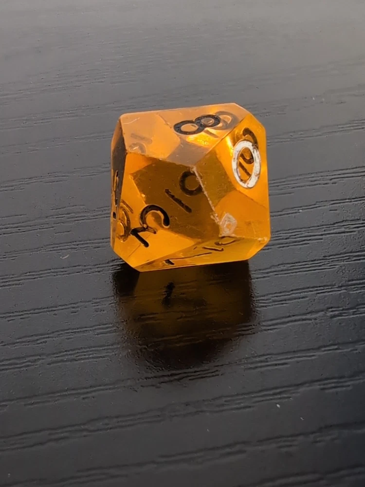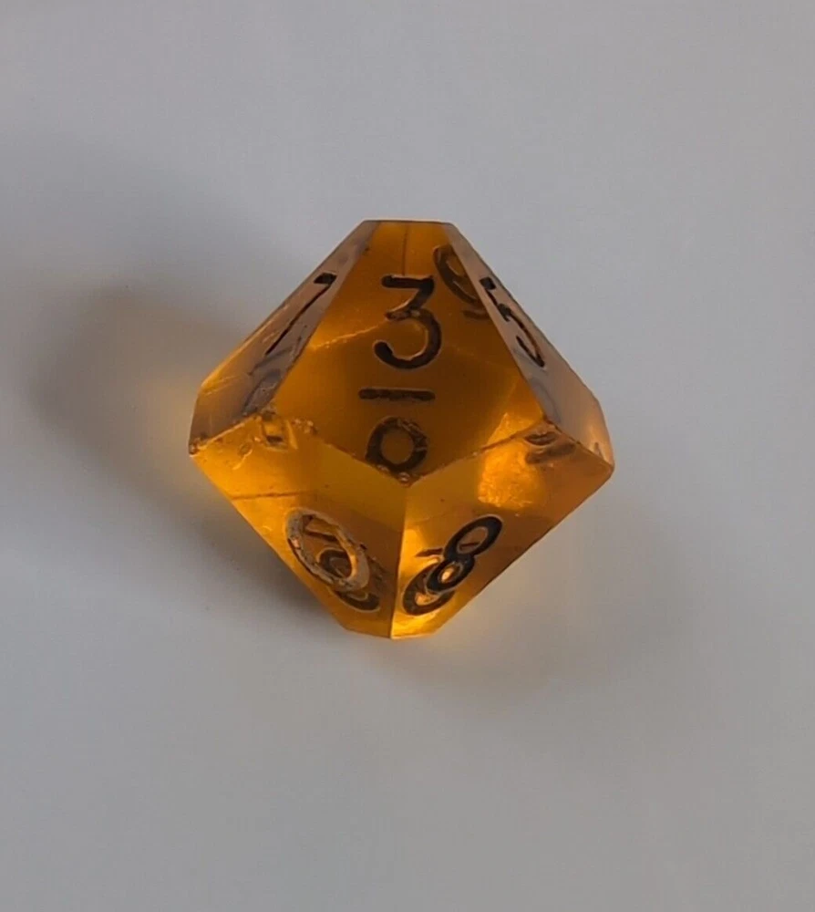Amory d10 Injection mold circle. Sprue mark on the 0. Inked. Scratches from play. Some edge chipping. This is orange, but more topaz. If you need more pictures, or of something specific, please let me know. Happy to take more pictures! I have more dice listed in my store. Willing to combine shipping!