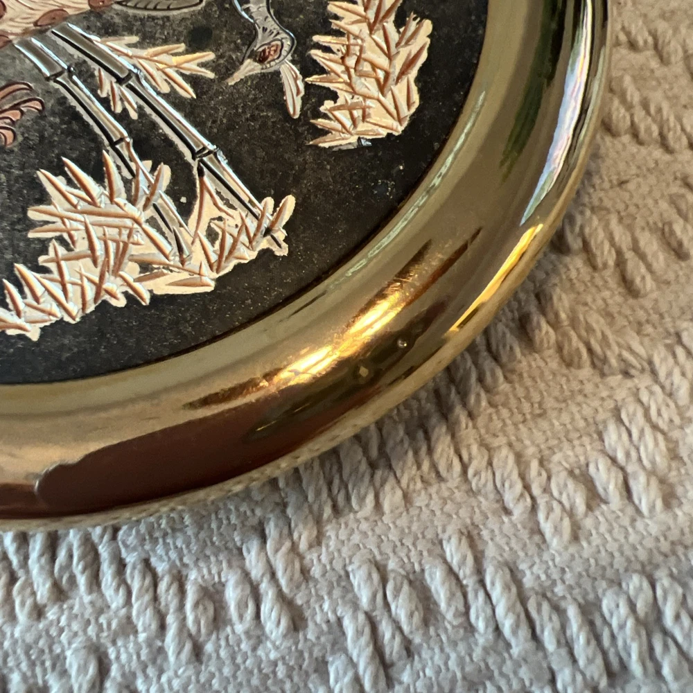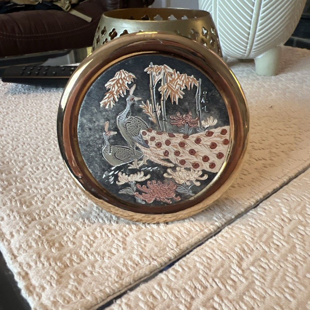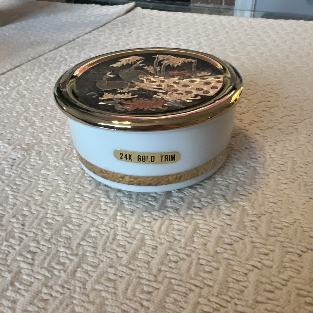 Experience the elegance of Asian artistry with this exquisite The Art of Chokin trinket box. Adorned with a stunning peacock motif, this porcelain dish is meticulously crafted in Japan, featuring a rich gold finish that exudes a timeless charm. The circular shape and 24 KT gold trim enhance its beauty, making it a sophisticated addition to any collection. This piece not only serves as a functional trinket box but also as a decorative accent that reflects a sense of luxury and tradition. Whether for personal use or as a thoughtful gift, it brings a touch of vintage flair and cultural richness to any setting.