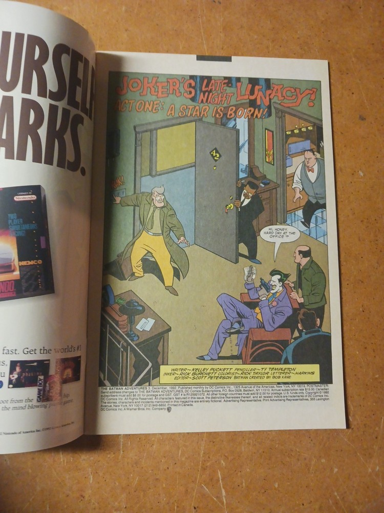 Publisher:DC Comicsbrand:DC ComicsLanguage:EnglishEra:Modern Age (1992-Now)Character:Alfred Pennyworth, Joker, James Gordon, Harvey Dent, Batman (Bruce Wayne), Joker (Villain), Harvey BullockIssue Number:3Cover Artist:Ty Templeton, Rick BurchettPublisher Country:United StatesFeatures:DirectPublication Year:1992Attribution:Portions of content provided by the Grand Comics Database under Creative Commons Attribution-ShareAlike 4.0 International License (CC BY-SA 4.0)_desc_:Comic Stories: Joker's Late-Night Lunacy!Genre:SuperheroesNumber of Pages:36Artist/Writer:Rick Taylor, Ty Templeton, Kelley Puckett, Rick BurchettPublication Date:December 1992Series Title:The Batman Adventures