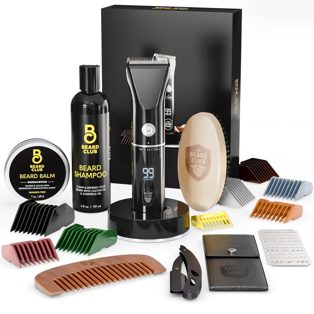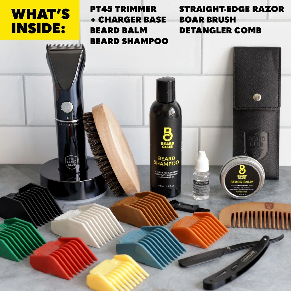 The Beard Club Mens Grooming Kit & PT45 Beard Trimmer for Men - Professional Cordless Electric Beard Hair & Moustache Trimmer, Straight Razor, Beard Shampoo, Balm, Beard Brush & Comb - Beard Kit Gift JAMES HARDEN'S PERSONAL FAVORITE - Sharp clean cuts, 8 color coded guides for 45 unique flawless trimming lengths. Extra sharp mower blades for beard and body hair giving you professional barber like styling flexibility and detailing, best beard trimmer for men POWERFUL BATTERY & MOTOR - Lithium-ion battery powers a 7,000 RPM quiet electric motor, giving you 3+ hours of consistent power without a cord. Recharge anywhere with the included LED Charging Display Stand or plug the charging cable directly into the trimmer EASY TO CLEAN - Blades repel dirt, oil and build-up to help prevent irritation. For a simple cleaning, wipe it with a damp cloth, or use the included brush to deeply clean the blade WARRANTY INCLUDED & TRAVEL SAFE - Backed with a one-year limited warranty. Comes with a built in travel lock making our beard trimmer completely portable and travel ready - no annoying wires holding you back IDEAL GIFT KIT - Perfect gift for men as an anniversary, birthday or Valentine's Day gift for your husband, fiance or boyfriend. Makes a great Christmas stocking stuffer or last minute Hanukkah gift. Dads favorite on Fathers Day Whether you've got some facial scruff, a hearty hedge, or you're a full blown bearded-king, we've got you covered. Come join us at The Beard Club and get your beard in shape today. This Beard Kit contains everything you need to groom your beard, including our PT45 Trimmer, and makes a great gift for yourself or your bearded loved one. The kit includes: PT45 Trimmer for Hair, Beard & Body, 8 Color Coded Guides, Beard Trimming Manual, Straight Edge Razor with 10 stainless steel blades & holster, Sandalwood Balm, Beard Shampoo, Wooden Beard Brush, Wooden Beard Comb, and Travel Bag. Shipping We offer FREE shipping on all orders! We use a selection of shipping services such as UPS, FedEx, USPS etc. We only ship to the lower 48 states, no APO/FPO addresses or PO Boxes allowed. Local pickups and combined shipping options are not provided at this time. Return You can return a product for up to 30 days from the date you purchased it. Any product you return must be in the same condition you received it and in the original packaging. Please keep the receipt. Payment We accept payment by any of the following methods: PayPal Please pay as soon as possible after winning an auction, as that will allow us to post your item to you sooner! Feedback Customer satisfaction is very important to us. If you have any problem with your order, please contact us and we will do our best to make you satisfied. Contact Us If you have any queries, please contact us via ebay. We usually respond within 24 hours on weekdays. Please visit our eBay store to check out other items for sale! Thank you for shopping at our store.