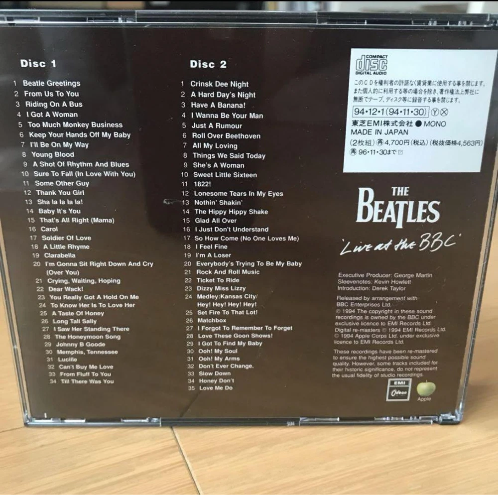 Description A Beatles album released as a two-disc set on November 30, 1994. Contains the best 56 songs from live studio recordings broadcast on BBC Radio in the UK from 1962 to 1965. This is the first official album of unreleased songs since 1977's ``The Beatles Super Live!''. The executive producer is George Martin. Digitally remastered sound source by Sonic Solution System. Talks with BBC DJs and members are also recorded at 13 locations. Full of unreleased photos! Japanese edition CD. Comes with a booklet with lyrics and commentary (Japanese). 1994 Toshiba EMI The case has some signs of use, but the disc surface is in good condition with no noticeable damage and can be played on a home CD player without any problems. 1-01 Beatle Greetings (Speech) 1-02 From Us To You 1-03 Riding On A Bus (Speech) 1-04 I Got A Woman 1-05 Too Much Monkey Business 1-06 Keep Your Hands Off My Baby 1-07 I’ll Be On My Way 1-08 Young Blood 1-09 A Shot Of Rhythm And Blues 1-10 Sure To Fall (In Love With You) 1-11 Some Other Guy 1-12 Thank You Girl 1-13 Sha La La La La! (Speech) 1-14 Baby It’s You 1-15 That’s All Right (Mama) 1-16 Carol 1-17 Soldier Of Love 1-18 A Little Rhyme (Speech) 1-19 Clarabella 1-20 I’m Gonna Sit Right Down And Cry (Over You) 1-21 Crying, Waiting, Hoping 1-22 Dear Wack! (Speech) 1-23 You Really Got A Hold On Me 1-24 To Know Her Is To Love Her 1-25 A Taste Of Honey 1-26 Long Tall Sally 1-27 I Saw Her Standing There 1-28 The Honeymoon Song 1-29 Johnny B Goode 1-30 Memphis, Tennessee 1-31 Lucille 1-32 Can’t Buy Me Love 1-33 From Fluff To You (Speech) 1-34 Till There Was You 2-01 Crinsk Dee Night (Speech) 2-02 A Hard Day’s Night 2-03 Have A Banana! (Speech) 2-04 I Wanna Be Your Man 2-05 Just A Rumour (Speech) 2-06 Roll Over Beethoven 2-07 All My Loving 2-08 Things We Said Today 2-09 She’s A Woman 2-10 Sweet Little Sixteen 2-11 1822! (Speech) 2-12 Lonesome Tears In My Eyes 2-13 Nothin’ Shakin’ 2-14 The Hippy Hippy Shake 2-15 Glad All Over 2-16 I Just Don’t Understand 2-17 So How Come (No One Loves Me) 2-18 I Feel Fine 2-19 I'm A Loser 2-20 Everybody's Trying To Be My Baby 2-21 Rock And Roll Music 2-22 Ticket To Ride 2-23 Dizzy Miss Lizzy 2-24 Medley: Kansas City/Hey! Hey! Hey! Hey! 2-25 Set Fire To That Lot! (Speech) 2-26 Matchbox 2-27 I Forgot To Remember To Forget 2-28 Love These Goon Shows! (Speech) 2-29 I Got To Find My Baby 2-30 Ooh! My Soul 2-31 Ooh! My Arms (Speech) 2-32 Don't Ever Change 2-33 Slow Down 2-34 Honey Don't 2-35 Love Me Do Label: Apple Records – TOCP-8401・02, Odeon – TOCP-8401・02, Apple Records – 8 31797~98 2, Odeon – 8 31797~98 2 Format: 2 x CD, Album, Remastered, Mono Country: Japan Released: 1994年12月1日 Genre: Rock, Non-Music, Pop Style: Beat, Rock & Roll, Rockabilly, Speech, Interview If you have any questions, please do not hesitate to ask. ^_^ Policy Payment You can use various payment methods based on eBay Managed Payments. Import duties, taxes and charges are not included in the item price or shipping charges. These charges are the buyer's responsibility. Shipping Expedited Shipping We always send the item with a tracking number. So please place an order without any concern on delivery. You can always track the delivery status. Shipping is only available to the address registered in eBay. If you want us to send another address, please change your address on eBay and then place an order. Shipping is available from Monday to Friday. Weekends are not available because freight companies are closed. Economy Shipping Delivery in 2-4 weeks. It may be delayed depending on the area and weather. Without tracking number. Cancellations & Returns Cancellation or returns will be accepted only if the item has an obvious problem that was not mentioned in the listing description. If that, please let us know within 3 days you got the item. Buyer is responsible for shipping costs and any charge incurred shipping products back. International Buyers Import duties, taxes and charges are not included in the item price or shipping charges. These charges are the buyer's responsibility. Please check with your country's customs office to determine what these additional costs will be prior to bidding/buying. These charges are normally collected by the delivering freight (shipping) company or when you pick the item up - do not confuse them for additional shipping charges.