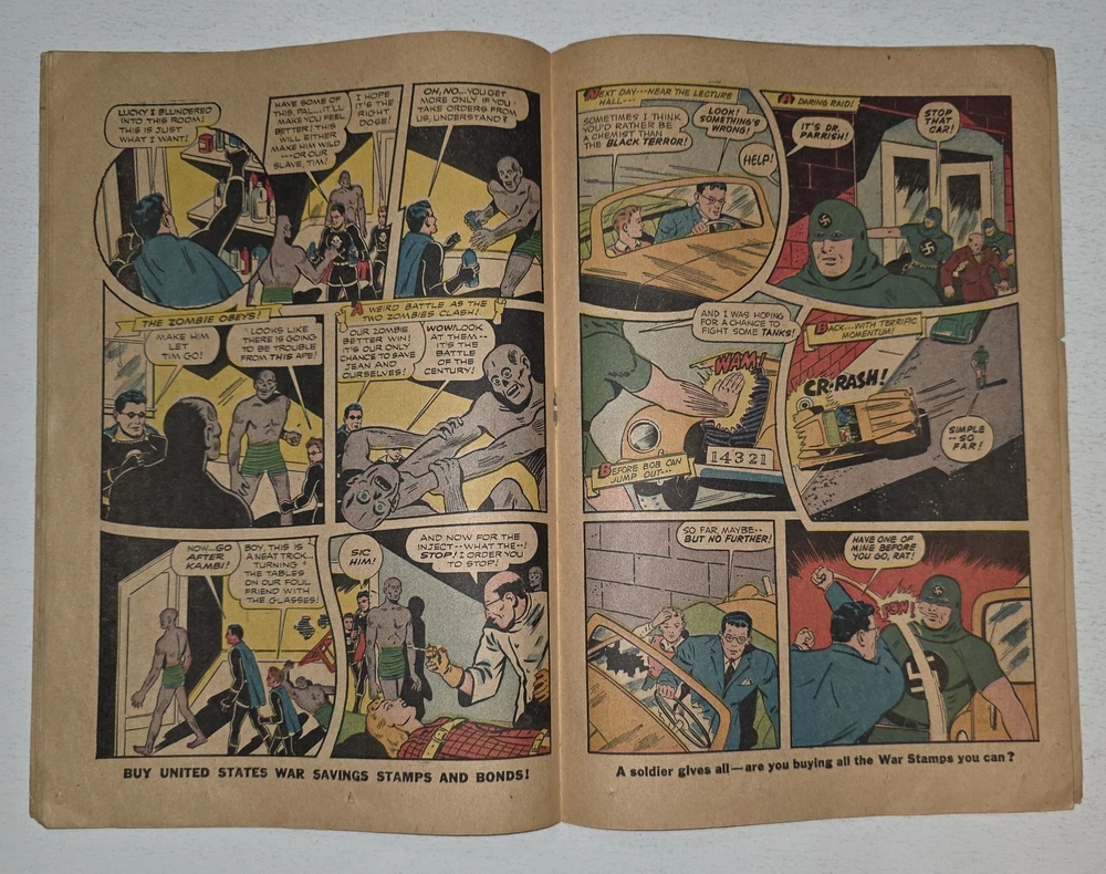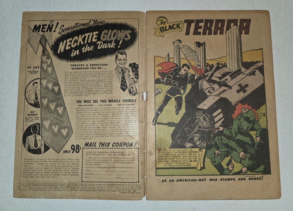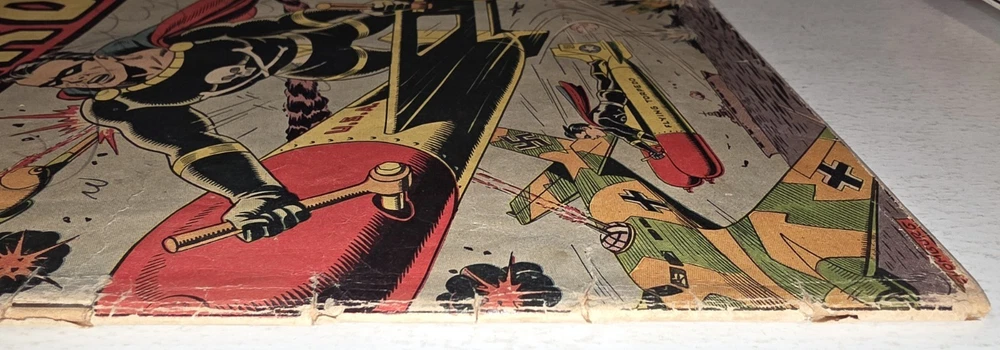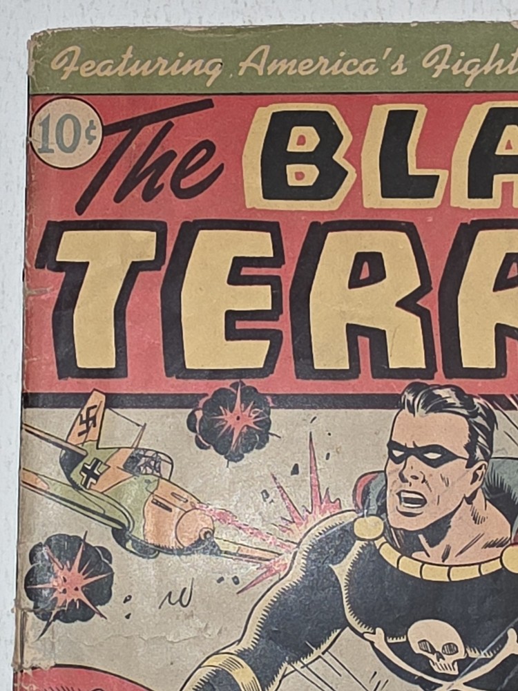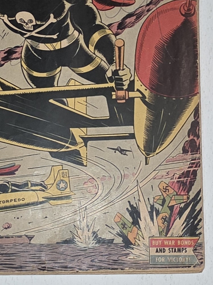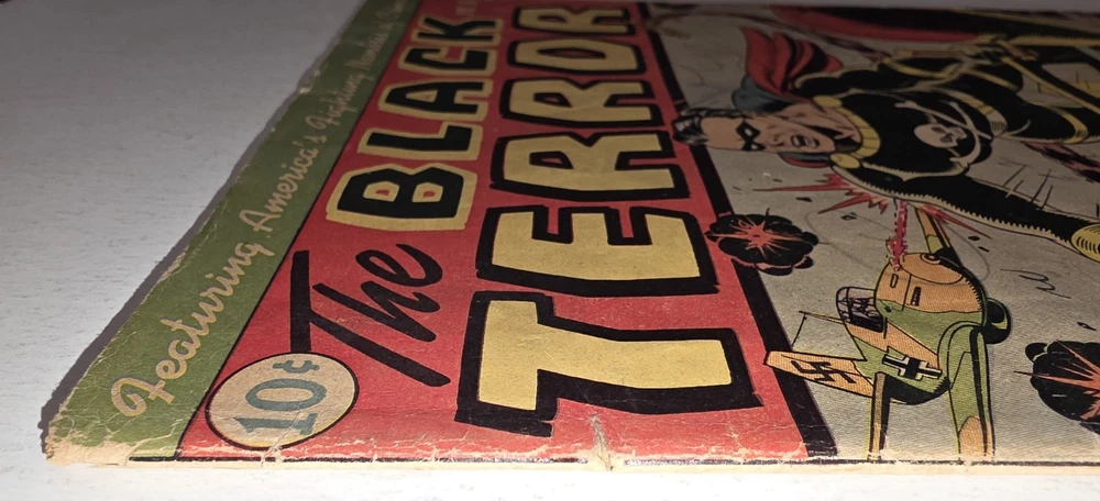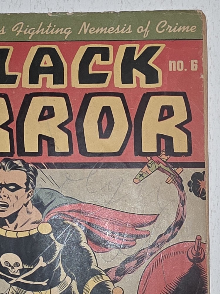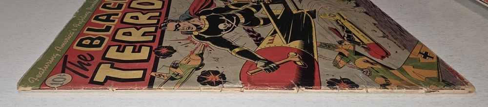 The Black Terror #6 comic book from 1944 features artwork by Alex Schomburg and is part of the Golden Age WWII era. This vintage single issue belongs to the US Comics tradition and showcases the superhero character, Black Terror. Published by Pines, this English-language comic is a part of the 1st edition series, making it a valuable collectible for comic book enthusiasts. - Complete, cover colorful and vibrant. Interior is good. Cover detached but staples at centerfold intact. Spine wear, creasing and ticks and pencil on cover but otherwise in good condition for this WWII gem. - Bagged and boarded - Shipped with Gemini packing to insure no damage during shipping - Usps Priority insured Check out our 1000s of comics in our store We combine shipping