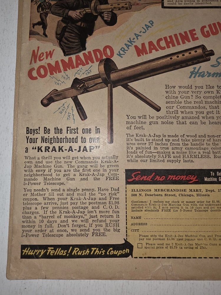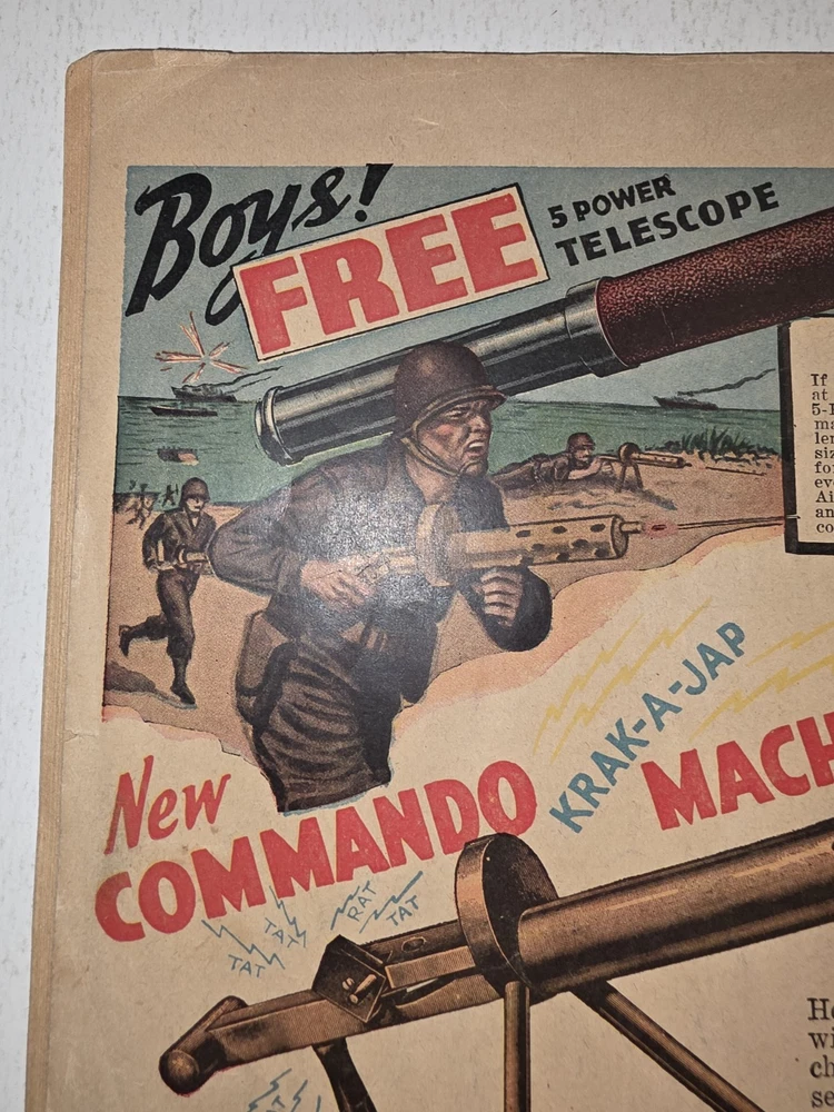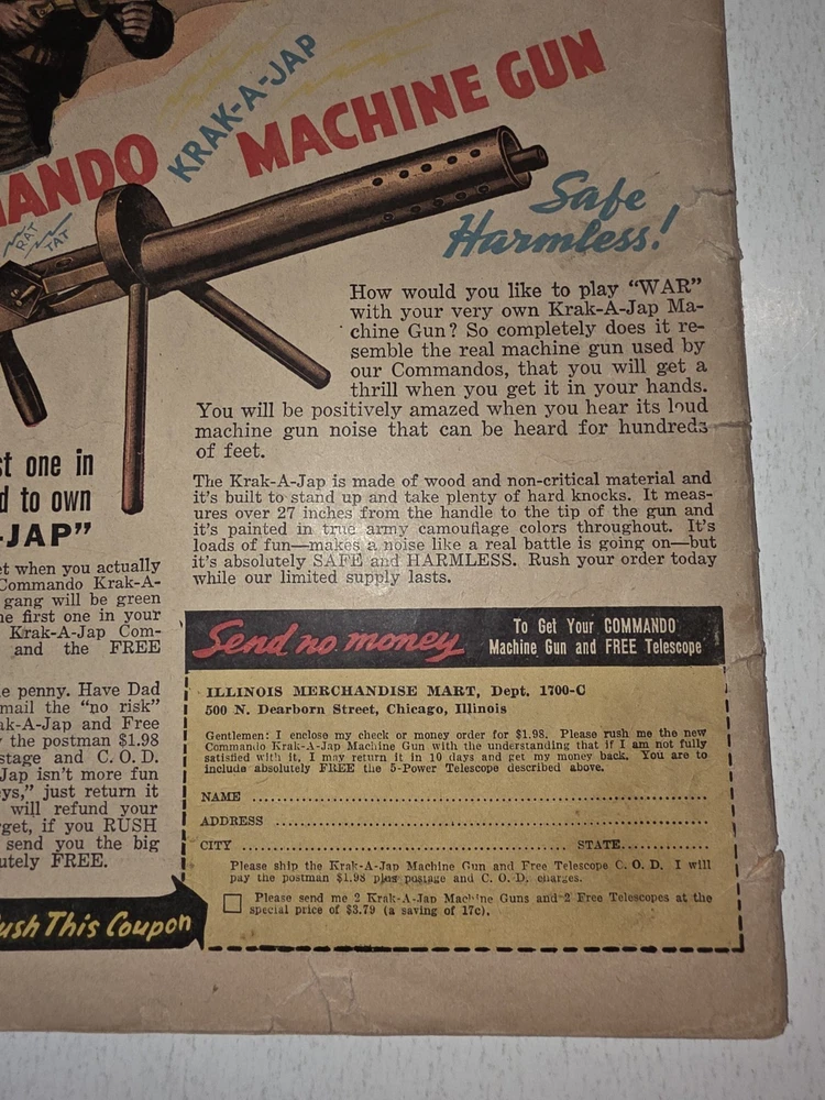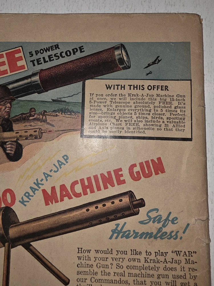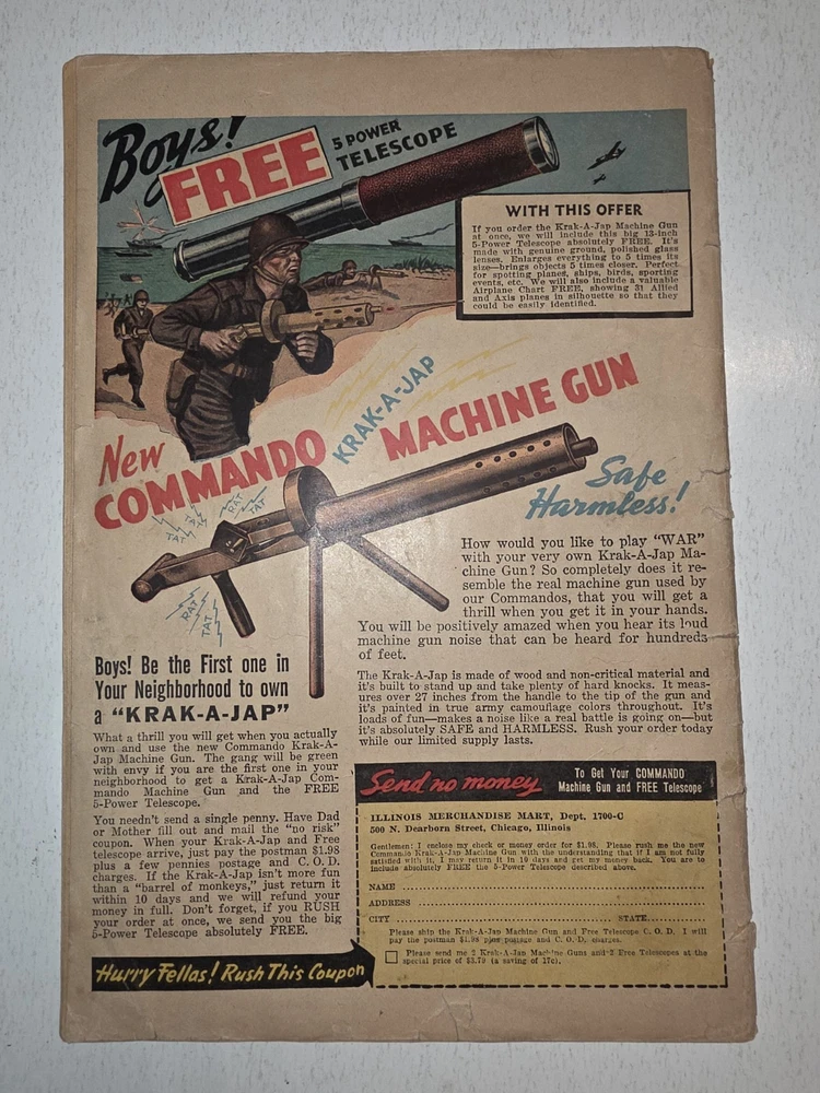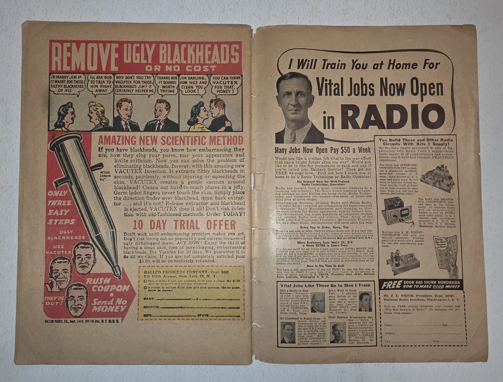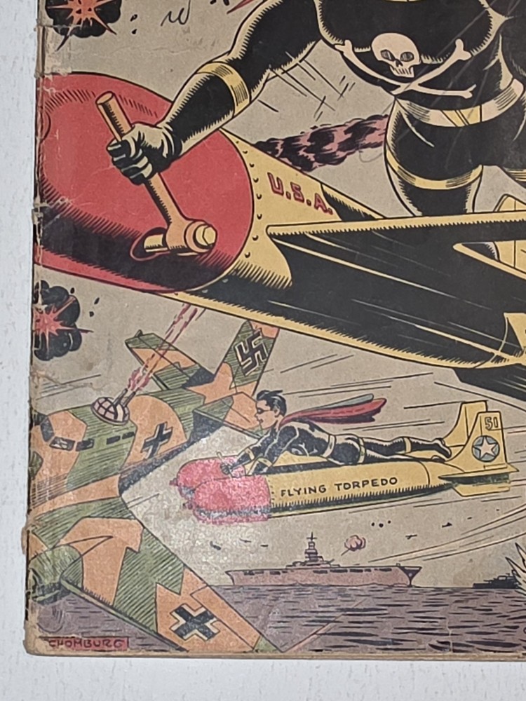 The Black Terror #6 comic book from 1944 features artwork by Alex Schomburg and is part of the Golden Age WWII era. This vintage single issue belongs to the US Comics tradition and showcases the superhero character, Black Terror. Published by Pines, this English-language comic is a part of the 1st edition series, making it a valuable collectible for comic book enthusiasts. - Complete, cover colorful and vibrant. Interior is good. Cover detached but staples at centerfold intact. Spine wear, creasing and ticks and pencil on cover but otherwise in good condition for this WWII gem. - Bagged and boarded - Shipped with Gemini packing to insure no damage during shipping - Usps Priority insured Check out our 1000s of comics in our store We combine shipping