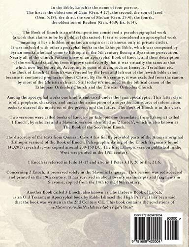 This book includes the 3 books ascribed to Enoch. 1 Enoch, 2 Enoch and 3 Enoch. The 1st Book of Enoch, the Ethiopic Book of Enoch, or 1 Enoch is more known as simply the Book of Enoch. Although this book is considered apocryphal for the Western canon, it is contained in the Ethiopic Bible. It was considered sacred by some important first followers of Christ but it was left out of the Bible and disappeared for centuries until it was rediscovered in 1773 in Ethiopic. This manuscript was first translated into English in the 1820s and into German in the 1830s. According to most scholars, part of it was written in third century BCE and part of it in the first century CE (the part related to the Son of Man). Although the oldest complete copies of 1 Enoch are K-9 or Kebran 9, dated late fourteenth early fifteenth century and Ethiopian Monastic Microfilm Library (EMML 2080) of the fifteenth or fourteenth century, fragments found in Qumramin the 1950s are more than 2000 years old. Other old important manuscripts are Abbadianus 55 (possibly fifteenth century) and British Museum Orient 485 (first half of the sixteenth century).The 2nd Book of Enoch, the Slavonic Enoch, or 2 Enoch, is another apocryphal book, found complete only in Old Slavonic manuscripts, and it was once present in the Old Slavonic Bible. It's usually dated to the first century CE although Matthew Black in The Oxford Guide to People & Places of the Bible state that there is no manuscript earlier than the fourteenth century BE.The 3rd Book of Enoch, the Hebrew Enoch, or 3 Enoch, is a Rabbinic text originally written in Hebrew usually dated to the fifth century CE. Some experts believe it was written by Rabbi Ishmael (second century CE), familiar with both 1 Enoch and 2 Enoch.