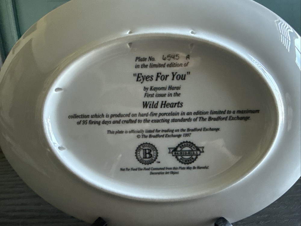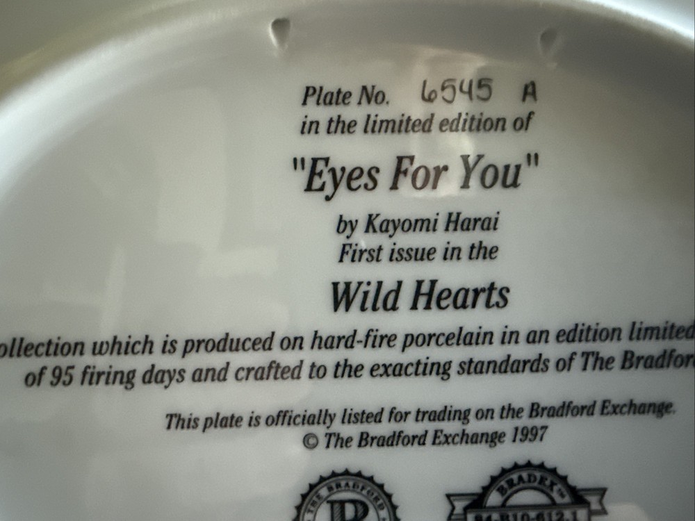 The Bradford Exchange Eyes For You/Wild Hearts Plate #6545A 1997 is a vintage collector's item made of porcelain, featuring a decorative design with a multicolor palette. Produced by the Bradford Exchange in the United States during the late 20th century, this oval-shaped plate is part of an art pottery production style, showcasing a unique American cultural influence. With its numbered feature and pottery production technique, this collector's plate is a beautiful addition to any decorative display, suitable for all occasions.