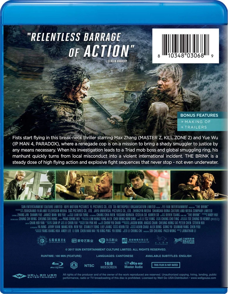 Further Details Title: The Brink Condition: New Format: Blu-ray Description: PRODUCT DESCRIPTION A renegade cop is on a mission to bring a shady smuggler to justice by any means necessary. When his investigation leads to a Triad mob boss and global smuggling ring, his manhunt quickly turns from local misconduct into a violent international incident. A relentless barrage of high flying action and explosive fight sequences, in this breakneck thriller, once the fists start flying, they never stop - not even underwater. ABOUT THE ACTOR Max Zhang is known from The Grandmaster (2013), Pacific Rim: Uprising (2018), Ip Man 3 (2015), and The Expendables 2 (2012). ABOUT THE DIRECTOR Jonathan Li is known for Infernal Affairs III (2003), Dog Bite Dog (2006), and Initial D (2005). See more Director: Jonathan Li Actor: Max Zhang, Shawn Yue, Janice Man Rating: MPAA Not Rated No Of Discs: 1 Run Time: 1 hour and 40 minutes Country/Region of Manufacture: USA Studio: Well Go Usa Language: English Subtitle Language: English EAN: 0810348030689 Region Code: Blu-ray: A (Americas, Southeast Asia...) Missing Information? Please contact us if any details are missing and where possible we will add the information to our listing.
