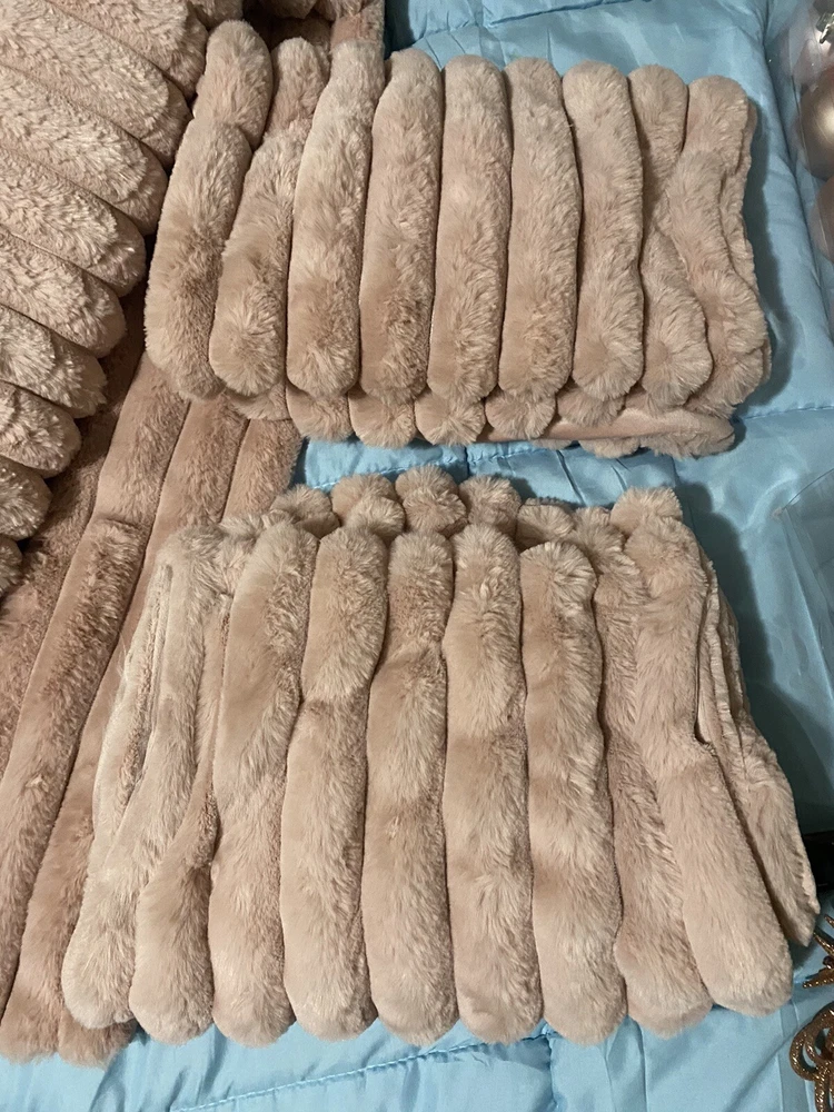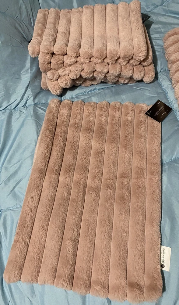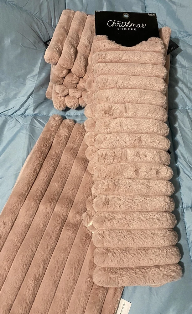 1 pink plush tree skirt 2 pink plush table runners 8 pink plush placemats 110 pink and light tan/gold ornaments, shatter proof 12 pink bow ornaments 2 tree toppers one pink, one gold 7 mini pink and gold poinsettia ornaments