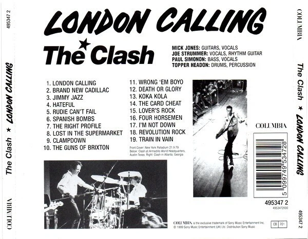 CONDITION: Used ARTIST: The Clash TITLE: London Calling GENRE: Rock LABEL: Columbia / 1999 Other Info: Made In Europe. 1 London Calling 3:18 2 Brand New Cadillac 2:09 3 Jimmy Jazz 3:55 4 Hateful 2:47 5 Rudie Can't Fail 3:27 6 Spanish Bombs 3:18 7 The Right Profile 3:53 8 Lost In The Supermarket 3:47 9 Clampdown 3:50 10 The Guns Of Brixton 3:12 11 Wrong 'Em Boyo 3:10 12 Death Or Glory 3:55 13 Koka Kola 1:49 14 The Card Cheat 3:50 15 Lover's Rock 4:01 16 Four Horsemen 3:00 17 I'm Not Down 3:00 18 Revolution Rock 5:36 19 Train In Vain 3:10 * We Post Next Working Day Of Payment. All Items Posts From Kos Island In Greece. * We Combine Shipping. We Post Worldwide. Registered Postage (With Tracking Number) * All Items Checked Before Uploading. Returns Accepted Only For Faulty Ones. * If We Don’t Have What You Are Looking For, Just Request It! * Feel Free To Communicate With Us!