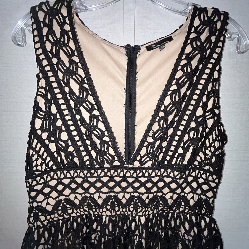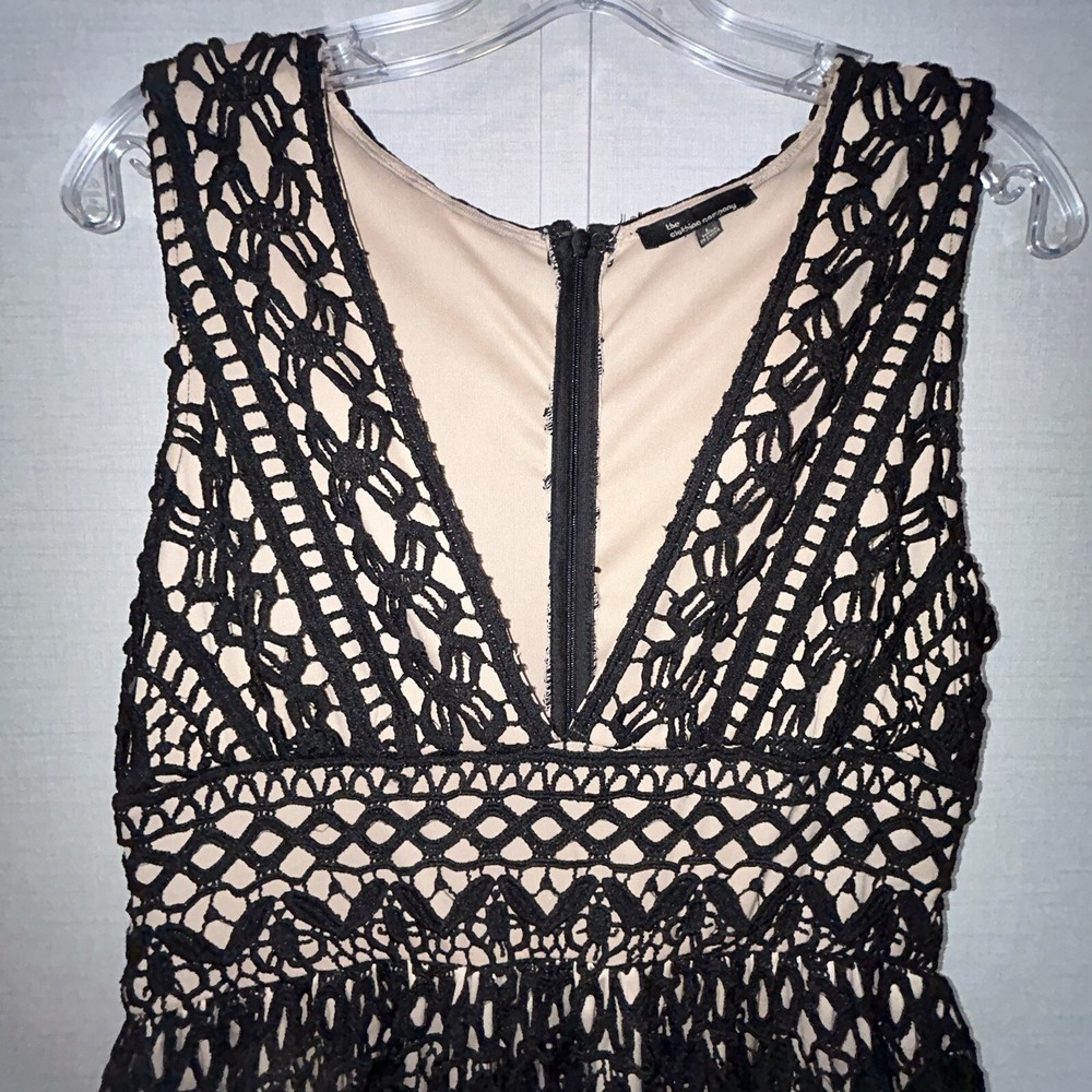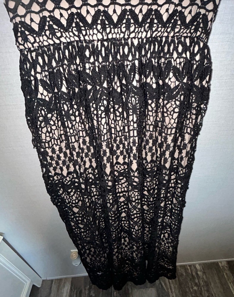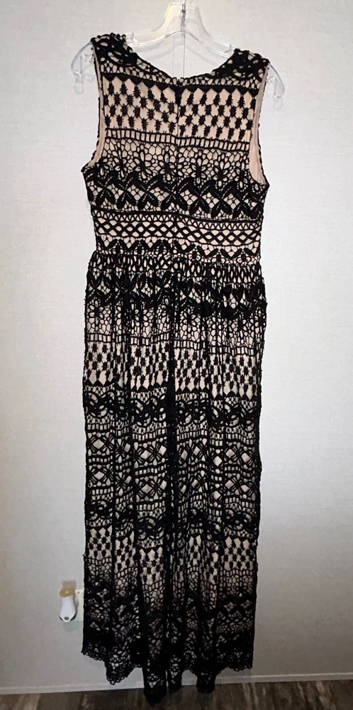 This elegant black maxi dress from The Clothing Company is a stunning addition to any wardrobe. Featuring a beautiful lace pattern, sleeveless design, and a V-neckline, this dress is perfect for formal occasions. The dress is made of high-quality polyester material with a crochet fabric type, making it both comfortable and durable. The dress has a zip closure and is lined for added comfort. It comes in size L . The dress is perfect for all seasons, including winter, summer, fall, and spring. Add this beautiful black maxi dress to your wardrobe today and make a statement at your next formal event!