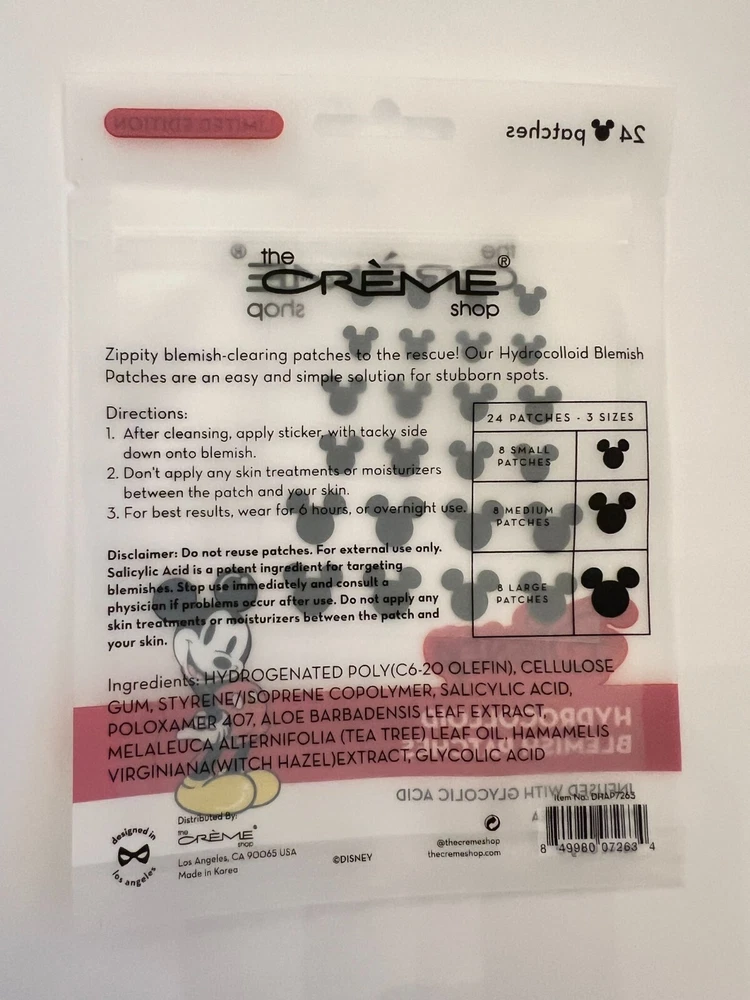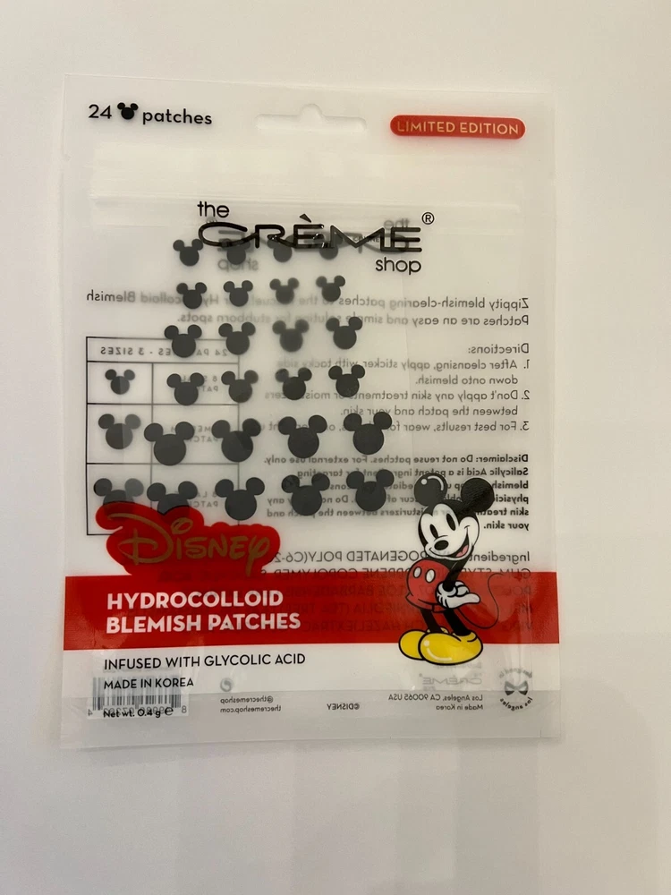 The Crème Shop - Mickey Mouse Hydrocolloid Acne Patches Infused with Glycolic Acid Introducing The Crème Shop's Mickey Mouse Hydrocolloid Acne Patches, a fun and effective solution for tackling pesky blemishes! Infused with glycolic acid, these adorable patches not only help to absorb impurities but also promote clearer skin. Designed with the iconic Mickey Mouse character, they bring a playful touch to your skincare routine while delivering powerful acne-fighting benefits. Say goodbye to stubborn spots and hello to a clearer complexion with these innovative patches! Key Ingredients Hydrocolloid: Creates a protective barrier over blemishes, helping to absorb excess oil and impurities. Glycolic Acid: A gentle exfoliant that helps to unclog pores and promote cell turnover for smoother skin. Salicylic Acid: Known for its acne-fighting properties, it penetrates deep into pores to reduce inflammation and prevent future breakouts. Benefits Hydrates and nourishes the skin while targeting acne. Promotes faster healing of blemishes. Provides a fun and engaging way to treat acne. How to Use Cleanse the affected area thoroughly. Peel off a patch and apply it directly onto the blemish. Leave the patch on for at least 6 hours or overnight for best results. Suitable For All skin types Acne-prone skin