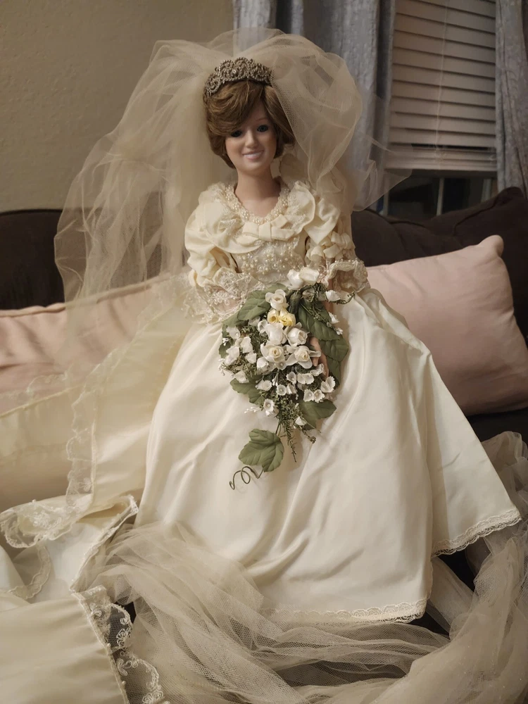 This exquisite Danbury Mint porcelain doll is a stunning addition to any collection. The doll is expertly crafted and features intricate details that make it truly special. It comes from the renowned Danbury Mint brand and is perfect for collectors of all types. Whether you're looking for a doll to display or one to play with, this figure is sure to impress.The doll is designed to resemble Princess Diana and is dressed in a beautiful wedding gown. It comes with a stand for displaying and is made of high-quality porcelain material. This doll is ideal for collectors who appreciate fine details and quality items.