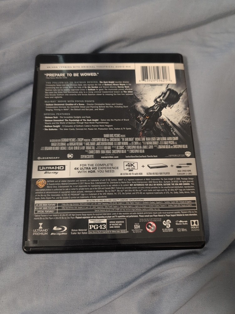 Format:Ultra HDUPC:0883929596218gtin13:0883929596218Features:WidescreenRating:PG-13Movie/TV Title:The Dark KnightProducer:Charles Roven, Christopher Nolan, Emma ThomasDirector:Christopher NolanStudio:Warner Home VideoRelease Year:2008Genre:Action & AdventureType:Movie