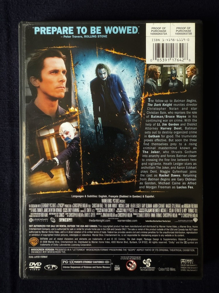 Movie/TV Title: The Dark Knight gtin13: 0085391176428 Rating: PG-13 Release Year: 2008 Director: Christopher Nolan Studio: Warner Home Video Format: DVD Features: Widescreen UPC: 0085391176428 Language: English Genre: Action & Adventure Run Time: 153 min. MPN: Does not apply Producer: Charles Roven, Christopher Nolan, Emma Thomas Brand: Unbranded