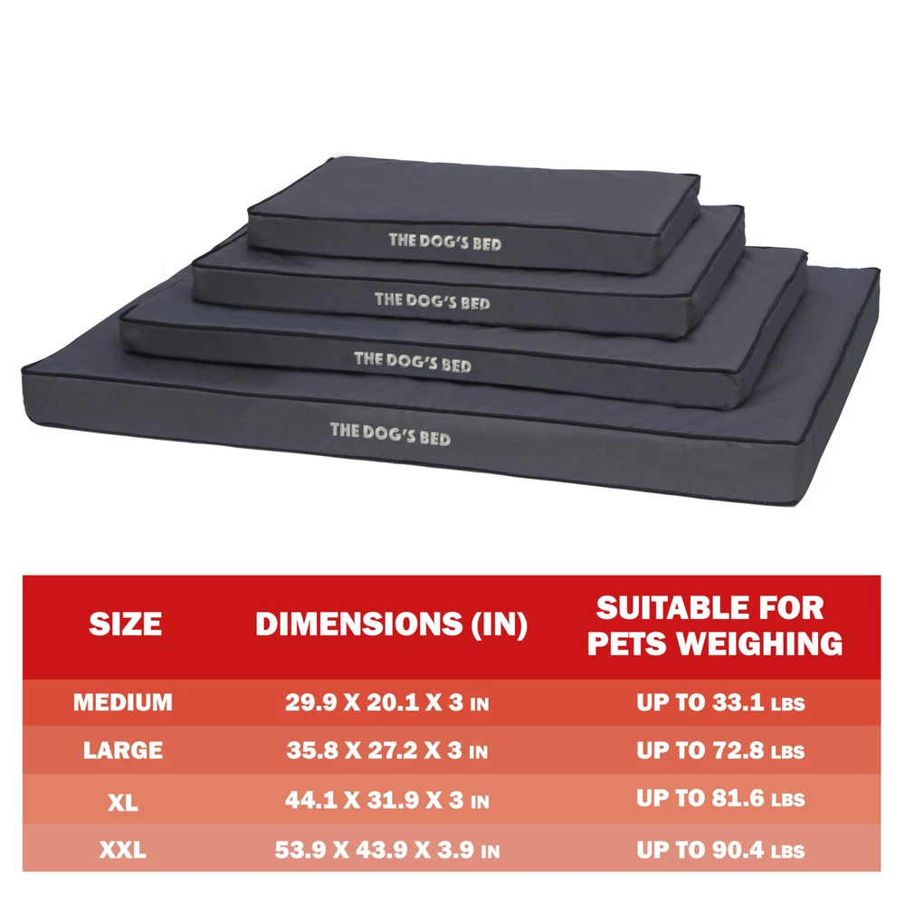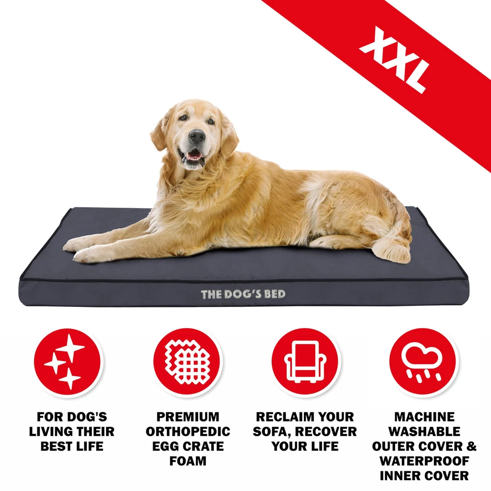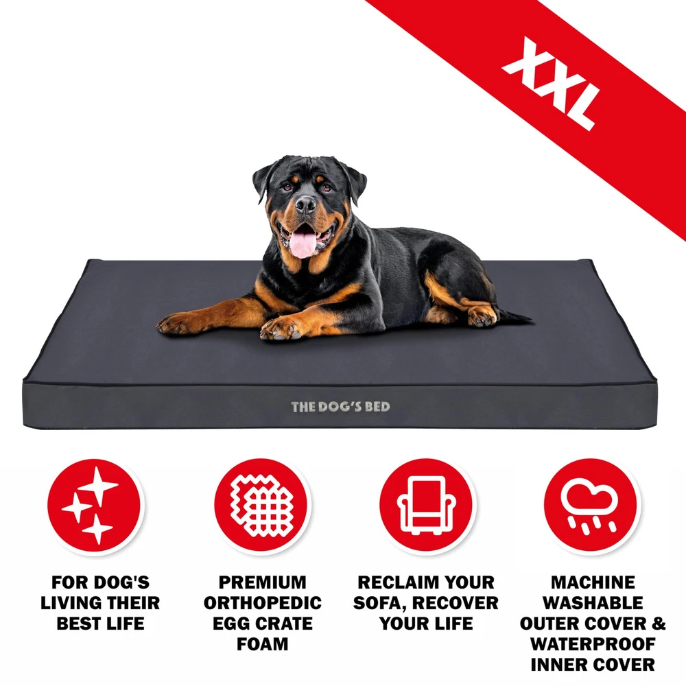WE LOVE DOGS. Our mission: to produce beds that pass our Quality of Life Test: beds contributing to your dog’s health, happiness and wellbeing, that help your dog to live its best life. Our design keeps your dog’s joints young for longer. Pet guardians credit The Dog’s Bed orthopedic with restoring their dog’s mobility, vitality and helping them to sleep soundly. Dogs are family: our bed structure approximates the structure and support of a human orthopedic mattress. Our heat-sensitive mattress supports your dog’s skeletal system, its correct alignment and protects their delicate joints. Quality is the keystone of our brand. To meet our high-quality standards and yours, we use high-grade materials to produce our bed. Quality is verified by 2 international 3rd-party companies, experts in inspection, testing, verification and certification with all dog sizes and dogs with conditions such as hip- and elbow dysplasia & patella luxation ensure that our bed enhances dogs’ lives. With rigorous quality controls we ensure that our bed is of the highest quality and is delivered to you in perfect condition. The Dog’s Bed orthopedic is for young dogs too. Getting your dog our bed early on is an excellent preventative measure to keep their joints youthful for longer. Many breeds are predisposed to conditions such as arthritis making their senior years painful. This immobility leads to isolation and a breakdown of the human-dog bond. The Dog’s Bed orthopedic has been designed to be long-lasting. Your dog will be able to keep this bed for a long time, so we produce replacement covers at a fraction of the cost of replacing the whole bed. Easy-clean vs plush/fur covers? The easy-clean cover is for dogs who shed/drool or recovering from surgery and is easy to vacuum/wipe clean. The plush/fur cover is like a soft blanket. XXL Grey with Black Trim (Easy Clean Cover) waterproof Orthopedic dog bed. Solid 4" veterinary grade, high density, Orthopedic egg crate foam with covers designed so that your bed fits your home decor seamlessly and your dog can stay close to the family A cost effective orthopedic bed for dogs of breeds that are not predisposed to joint conditions providing them with a standard level of support for them to rest and recover from an active day An excellent first bed for all puppies providing good support and comfort allowing a peaceful sleep The egg crate foam is reversible based on the weather conditions with one side allowing more airflow for summer and the other side a warmer solution for winter Bed comes with aesthetically pleasing removable covers that aid the transmission of your dog’s body heat to the heat-sensitive orthopedic egg crate foam mattress. They are also easy to wash, quick-drying and include a waterproof mattress protector to catch accidents associated with incontinence. Covered by a 1 year limited warranty for manufacturing defects
