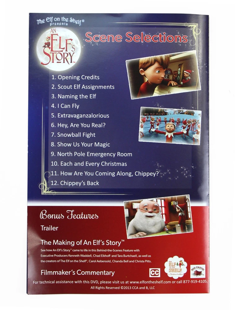The Elf on the Shelf An Elf's Story: DVD Product Description A beloved Christmas classic. An Elf's Story is filled with fun, music, and the timeless message that Christmas is something we carry out in our hearts. An Elf's Story is the inspirational tale of Chippey, the enthusiastic young scout elf who is assigned by Santa to restore Taylor McTuttle's belief in Christmas magic. When Taylor breaks the number one Elf on the Shelf rule and touches Chippey in a boyish act of defiance, the elf loses his Christmas magic. Through the power of love and forgiveness, both Taylor and Chippey learn that true belief cannot be taught. Based on the bestselling The Elf on the Shelf: A Christmas Tradition DVD includes the 23-minute holiday special, TV trailer, behind-the-scenes, and filmmaker's commentary Debuted in 2011 An Elf's Story DVD. From the Manufacturer Nine year old Taylor McTuttle has reached a crossroads. Does he believe Santa Claus really knows who is naughty or nice? Does he even believe in Santa Claus anymore? An Elfs Story is the inspirational tale of Chippey, the enthusiastic young scout elf who is assigned by Santa to restore Taylors belief in Christmas magic. When Taylor breaks the number one Elf on the Shelf rule and touches Chippey in a boyish act of defiance, the elf loses his Christmas magic, the entire McTuttle family loses its scout elf and both Taylor and Chippey lose their self-respect. Through the power of love and forgiveness, both of them learn that true belief cannot be taught. A family holiday classic for generations to come, An Elfs Story is filled with fun, music and the timeless message that Christmas is something we carry in our hearts. The DVD includes the 23-minute holiday special, TV trailer, behind-the-scenes video, filmmakers commentary and a code for special website access to Santas secret shipping yard. Features Based on the bestselling Christmas tradition The Elf on the Shelf Includes code for Santa's Secret website Debuted on national television in 2011 to over 5 million viewers Details Fast and Free Shipping You're already purchasing the item. Why pay additional for shipping, especially slow shipping? We get your order shipped out within 1-business day and delivered to your doorstep as quickly as possible. Competitive Pricing With our dynamic pricing model, our prices are always competitive. Our prices are some of the lowest that you will find on the internet. Rest assured that you're getting a good deal when purchasing with us. 30-day Money Back Guarantee We are committed to making sure that you leave this transaction satisfied. If you're unhappy with the product for any reason, you may return it back for your money-back or a replacement within 30 days. No questions asked!