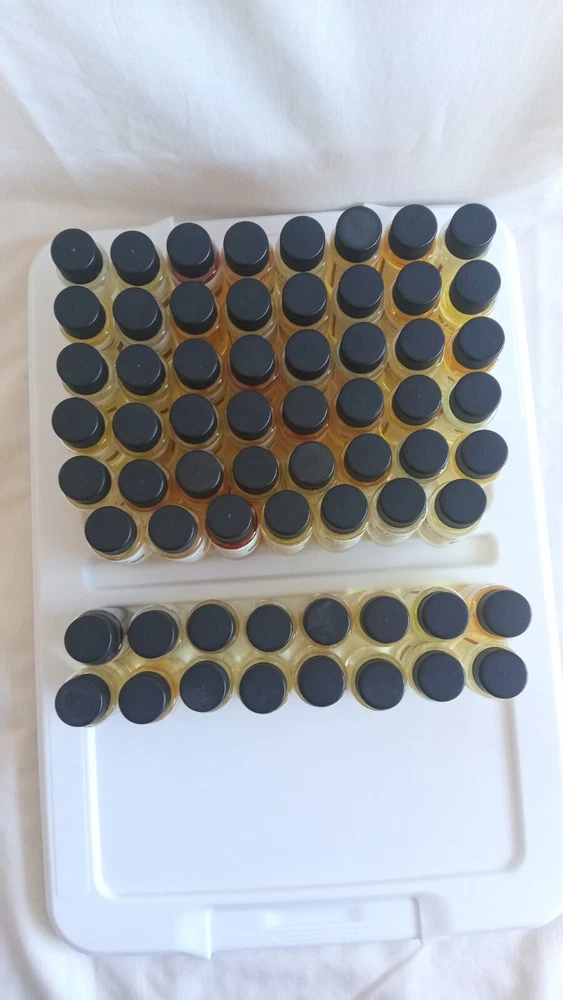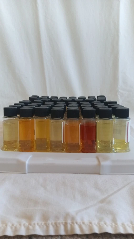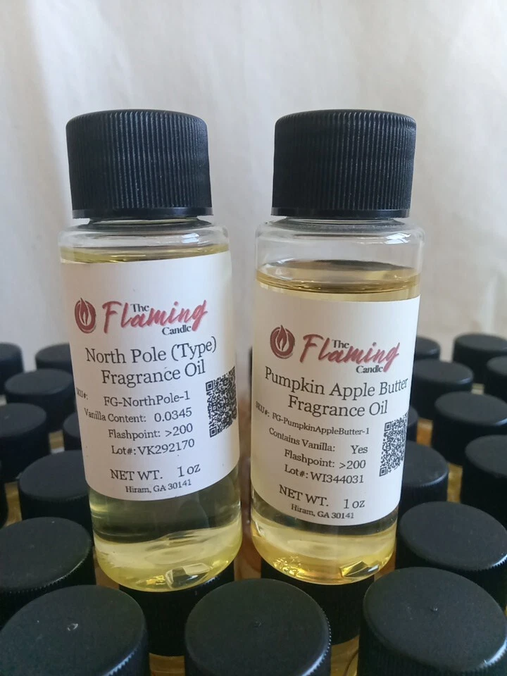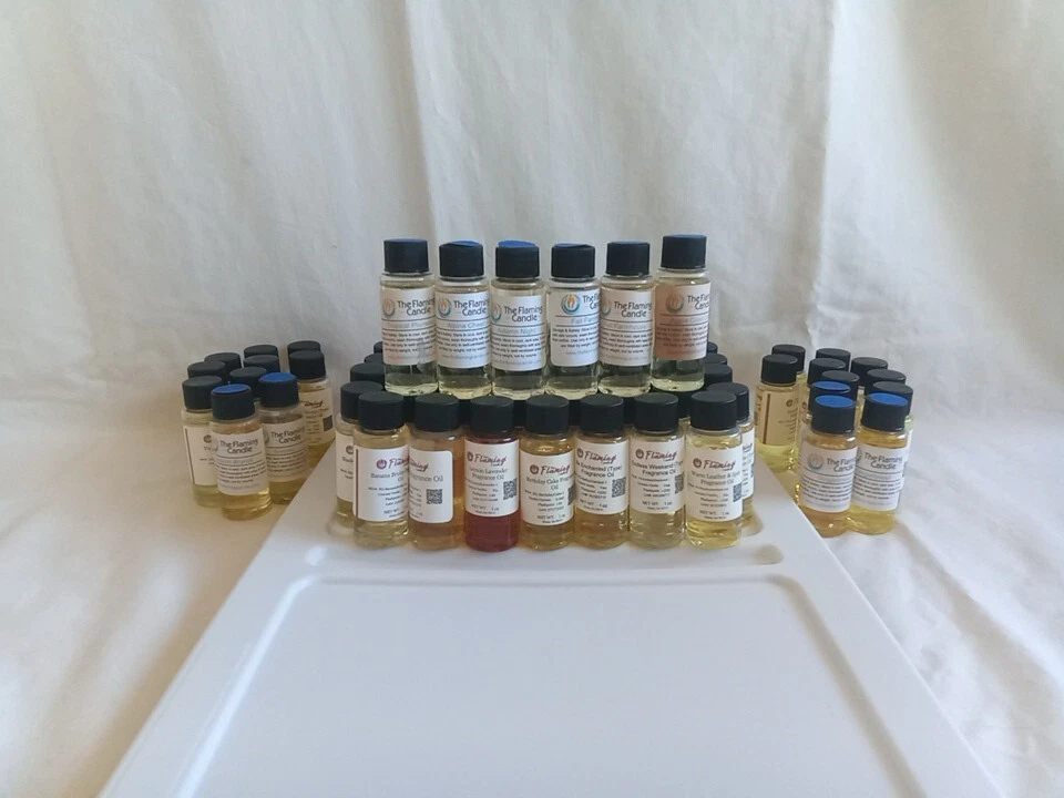 Create your own unique scented candles with The Flaming Candle's Fragrance Oil. With a variety of scents to choose from, this 1 fl oz bottle is perfect for candle making enthusiasts. Made in the United States, this high-quality fragrance oil is sure to enhance the aroma of your candles and create a more enjoyable burning experience. With a versatile range of scents, this fragrance oil is perfect for any occasion and will make your candles stand out from the rest. Whether you're a beginner or an experienced candle maker, The Flaming Candle's Fragrance Oil is a must-have for anyone looking to take their candle making to the next level. Scents include: Smores, Autumn Brunch, Vanilla Pumpkin Marshmallow, Gingerbread, Apple Cider Donut, Fall Farmhouse, Alpine Cheer, Autumn Night, Tropical Plumeria, Banana Brulee, Pumpkin Apple Butter, Cinnamon Spiced Vanilla, North Pole, Key Lime Pie, Banana Nut Bread, Vanilla Pumpkin Pie, Sweet Pea, Asian Sandalwood, Amethyst Aura, Summer Scoop, Pink Quartz, Lavender Sandalwood, Sandalwood & Suede, Pumpkin Spice Latte, Tis the Season, Pineapple Wild Mango, Vanilla, Lemon Lavender, Birthday Cake, Warm Leather & Spice, Endless Weekend, Be Enchanted, Sugar & Spice, Southern Iced Tea, Blueberry Cobbler, Georgia Peach, Pink Sugar, Peach Magnolia, Wild Berry Cheesecake, Salted Caramel Milkshake, Black Amber & Lavender, Volcano, Sundrenched Blossom, Capri Limoncello, Flower Jam, Wild Daisy Dream, Sage White Tea, Italian Ice, Sugar Cookie Royale, Amber Romance, Starfruit Lime, Cotton Candy, Black Cherry, Chocolate Amber, Pumpkin Peanut Brittle, Texas Pecan Pie, Butt Naked, Chocolate, Passionate Kisses, Strawberries & Champagne, Raw Sugar Mandarin, Lakeside Pine Most if not all of the bottles have been opened and sniffed, many have been sampled but they are all more than or around 3/4 full. See photos for range of variations (colors and liquid levels.) If you have any questions or would like photos of a specific fragrance's bottle, please don't hesitate to reach out. Thank you! :)