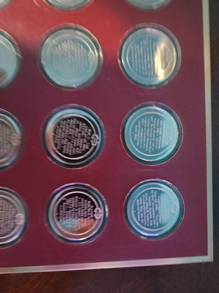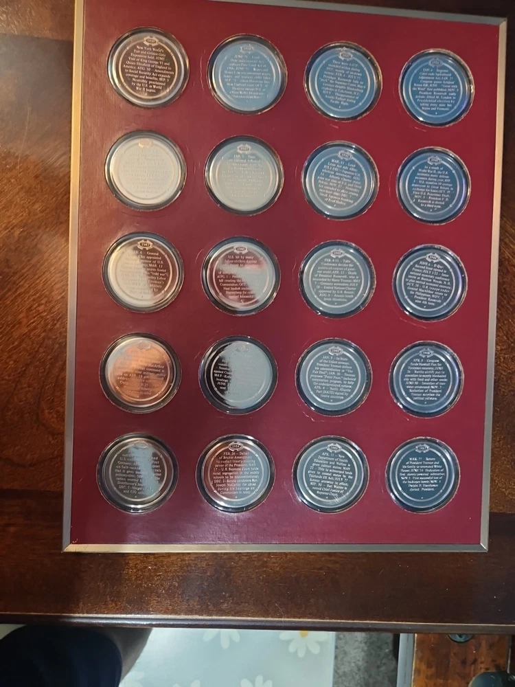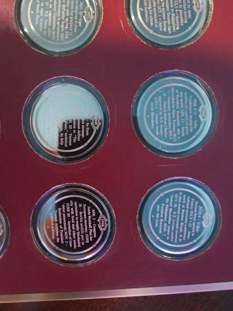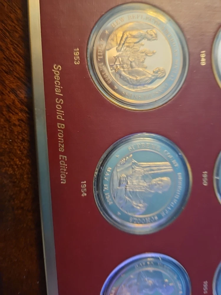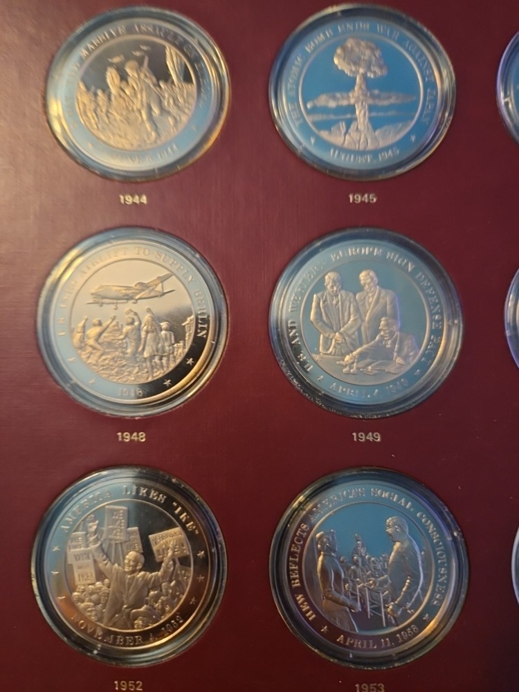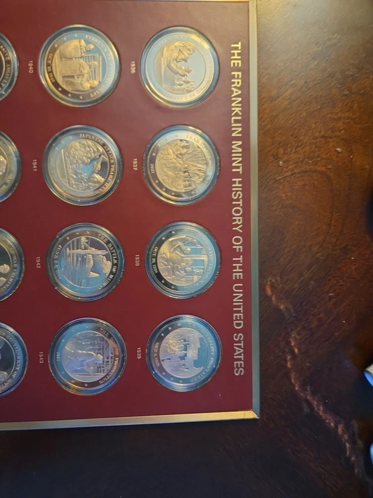 The Franklin Mint History of the United States is a collection of bronze medals showcasing key moments and figures in American history. Each medal is struck with a fineness of 0.999 bronze and is in uncirculated condition, making them valuable pieces for collectors and history enthusiasts. The brand, Franklin Mint, is known for producing high-quality coins and medals, adding to the appeal and authenticity of this series.From years 1936 to 1955. all coins are bronze enclosed in plastic cases. never been opened.
