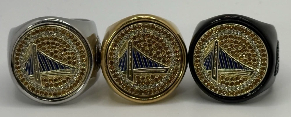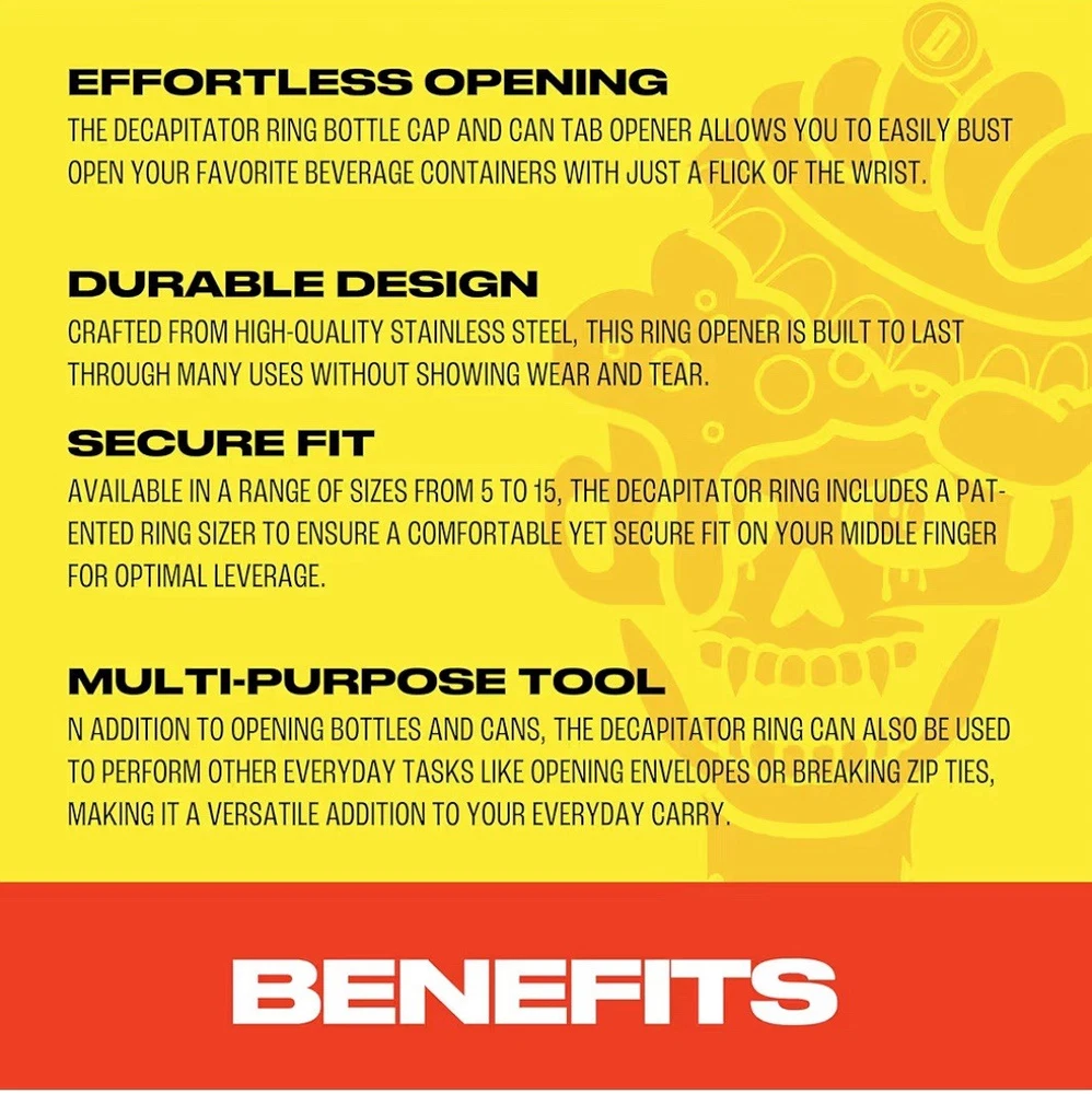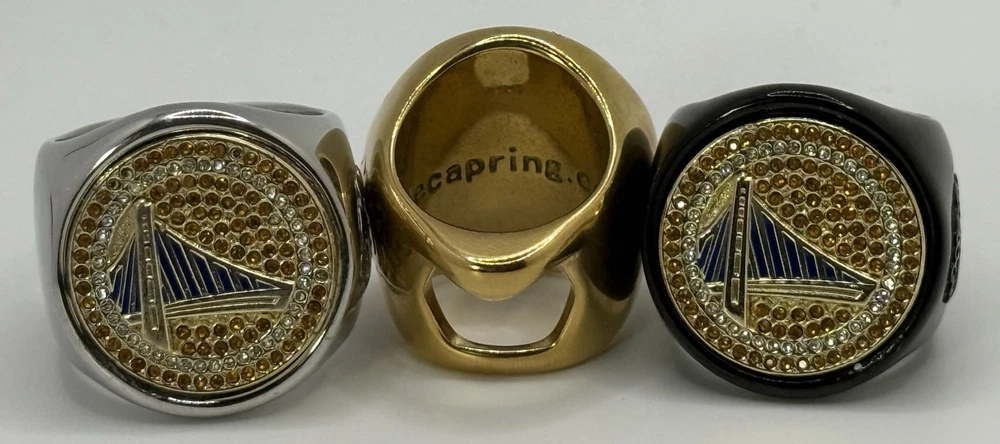 The GOLDEN STATE WARRIORS de CAP itator ring bottle cap & can tab opener! The ONLY Replica Championship ring that cracks open your favorite beverage of bottle caps and can tabs with just a flick of your wrist. Made of durable polished stainless steel. Made with 52 cubic zirconia's. All rings come with our patented ring sizer to fit all middle fingers. The ring goes on your middle finger for best leverage. NFL, Fantasy football, Awards. Trophies At checkout please choose between a black, Silver or Gold ring Comes in sizes 6-15 with our patented ring sizer. What's better than cracking open your favorite beverage with just a flick of your wrist. ✅ Effortless Opening: The Original deCAPitator ring bottle cap and can tab opener allows you to easily bust open your favorite beverage containers with just a flick of the wrist. ✅ Durable Design: Crafted from high-quality black stainless steel, this ring opener is built to last through many uses without showing wear and tear. ✅ Secure Fit: Available in a range of sizes from 5 to 15, the deCAPitator ring includes a patented ring sizer to ensure a comfortable yet secure fit on your middle finger for optimal leverage. ✅ Eye-Catching Style: Featuring logo design embossed and painted set in silver tone, this functional ring is sure to spark conversation and turn heads wherever you go. ✅ Multipurpose Tool: In addition to opening bottles and cans, the deCAPitator ring can also be used to perform other everyday tasks like opening envelopes or breaking zip ties, making it a versatile addition to your everyday carry. Unique Bottle Cap & can tab Opener: This innovative ring design allows you to effortlessly remove caps from bottles and pop-tops from cans with a simple flick of the wrist. Stylish and Functional: Crafted with a sleek, eye-catching pattern of sparkling crystals, this opener doubles as a fashionable accessory for any occasion. Compact and Portable: The compact size makes it easy to carry in your pocket, purse, or keychain for convenient access whenever you need it. Durable Construction: Made with high-quality stainless steel, this opener is built to withstand regular use and last for years to come. Versatile Utility: Whether you're enjoying a cold beverage at home, a party, or on-the-go, this multi-purpose opener ensures you're always prepared.